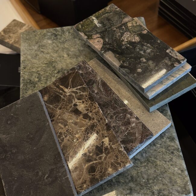 Zuerst die Farbpalette zusammenstellen. Wir begleiten Sie bei der Auswahl seltener Stoffe, Steine und Oberflächen, um die Textur Ihres Zuhauses zu definieren.