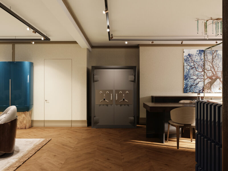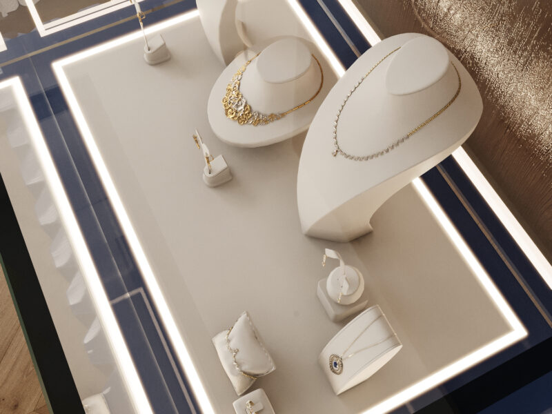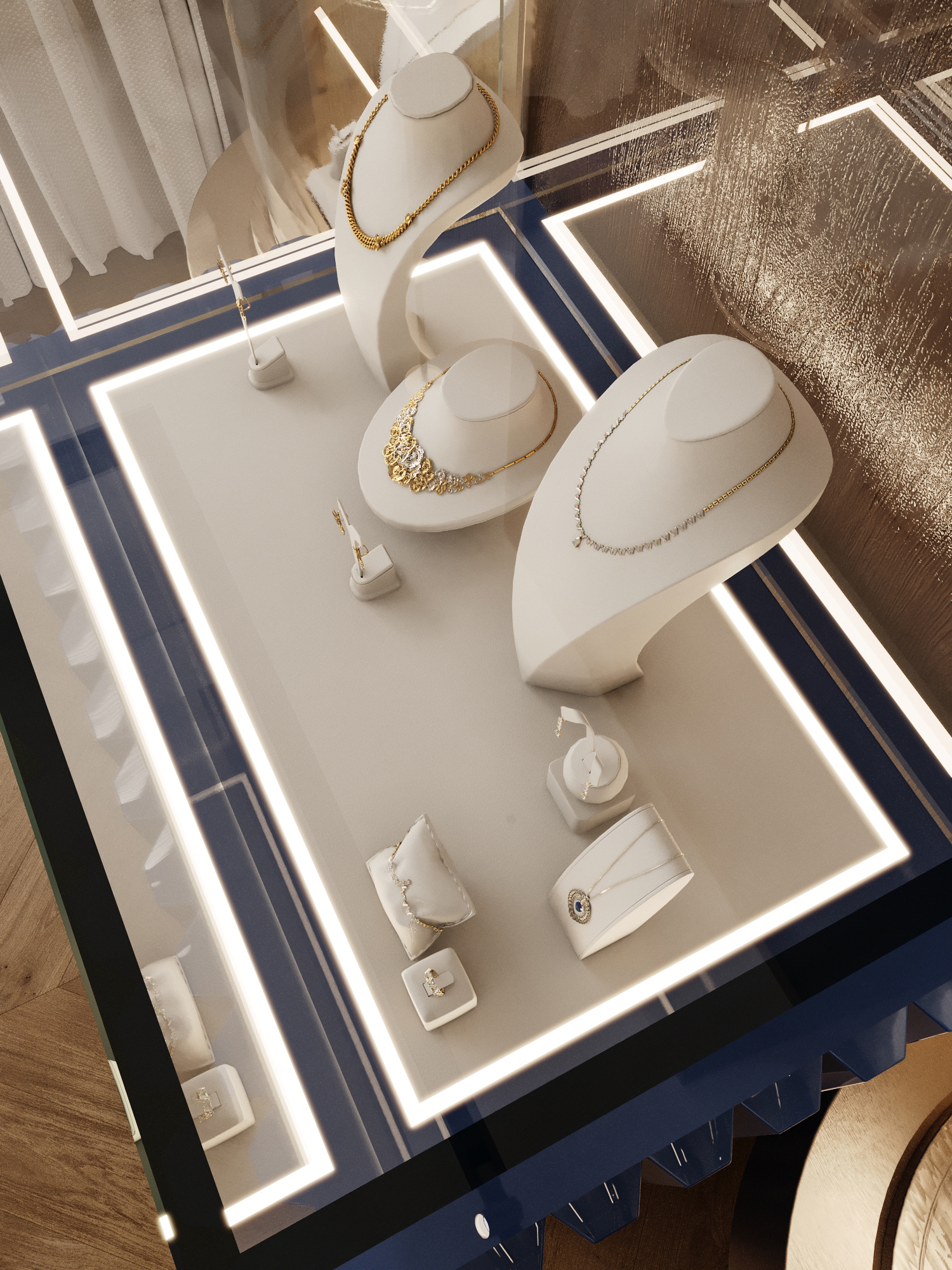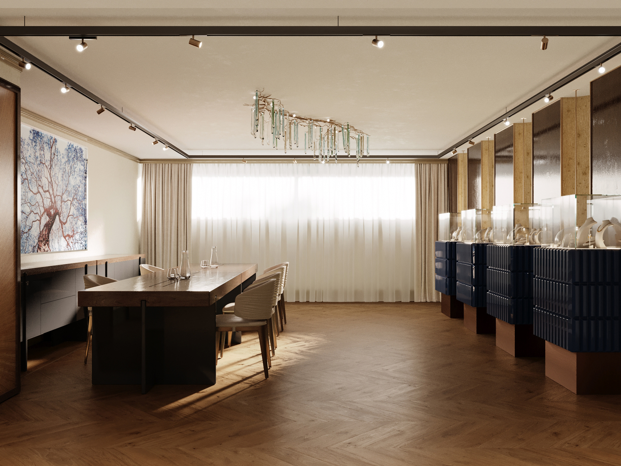 Das Cyprus-Projekt umfasste die vollständige Innenraumgestaltung eines Juwelier-Showrooms, der sich auf den Vertrieb von Edelsteinen an professionelle Juweliere spezialisiert. Der Arbeitsumfang erstreckte sich über die gesamte Ausstellungsfläche, einschließlich eines zentralen Präsentationsrings, eines speziell für dieses Projekt entwickelten, maßgefertigten Safes, der Büroräume und eines Gästebads.