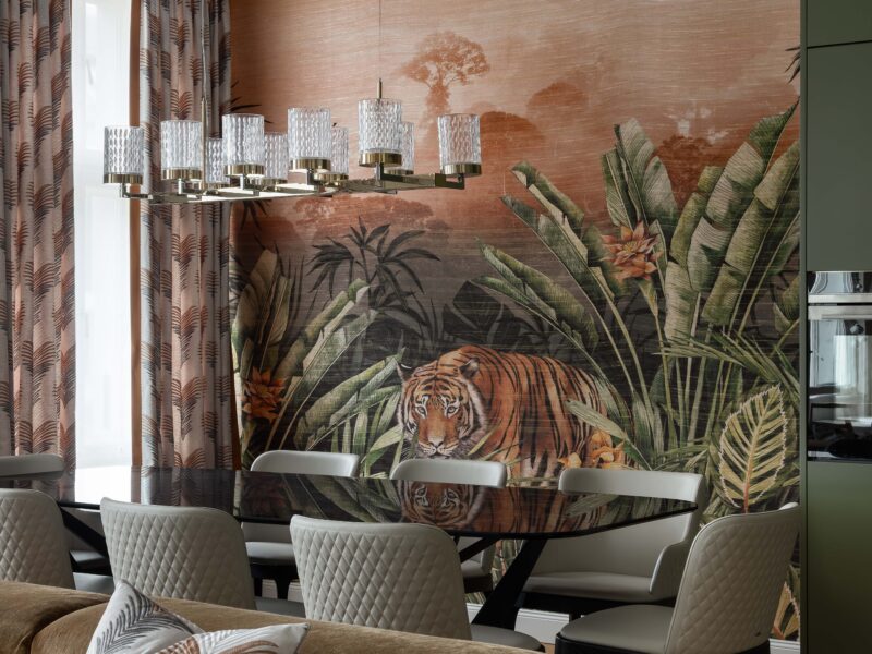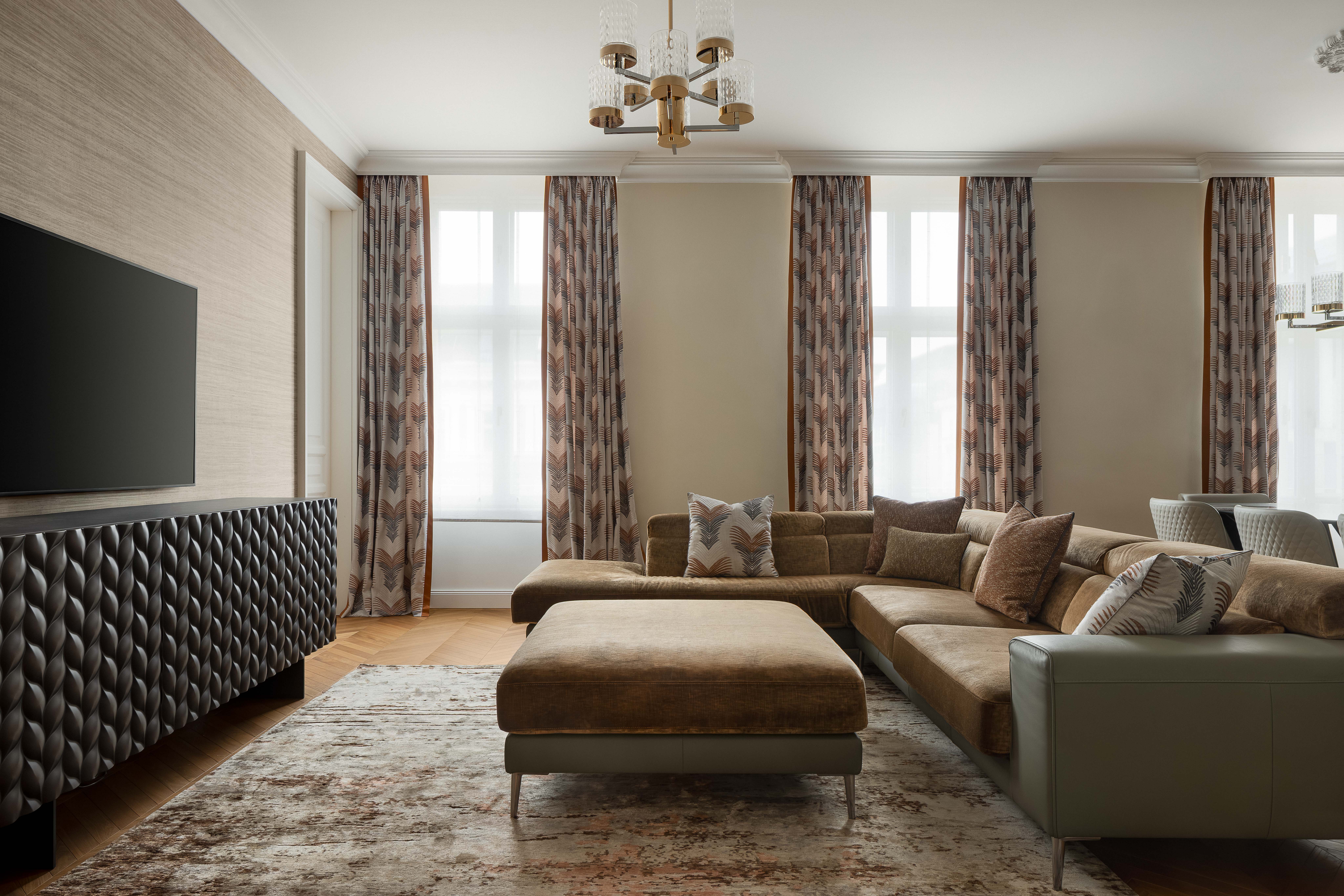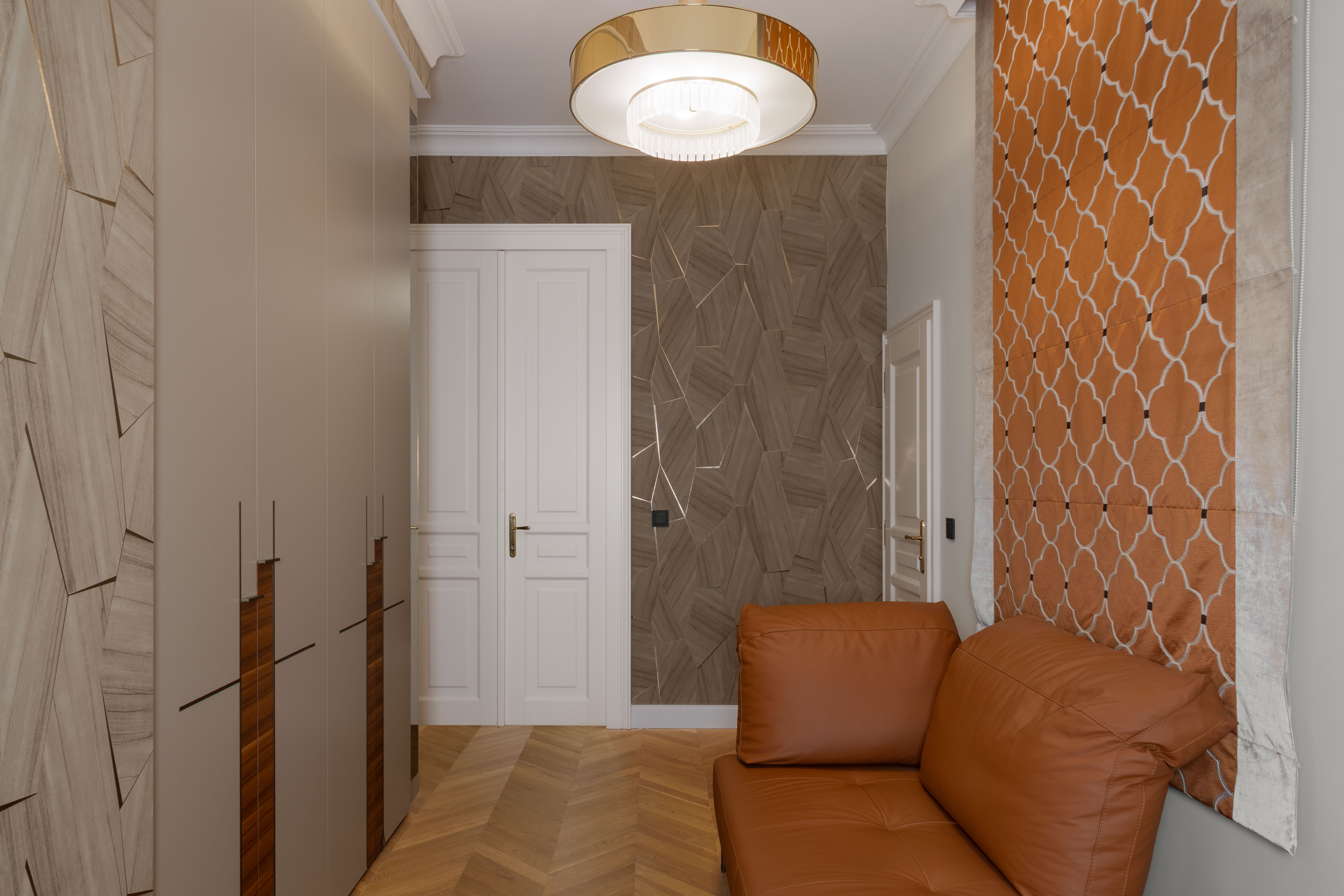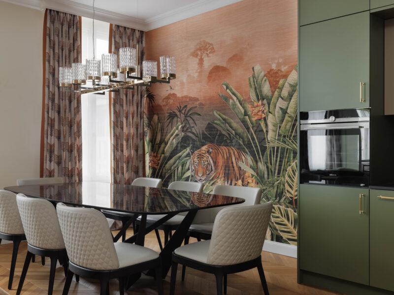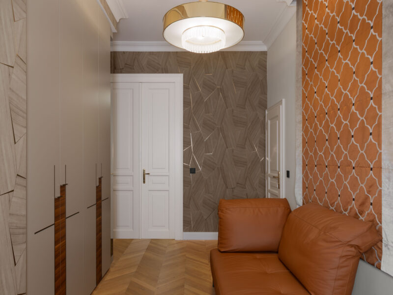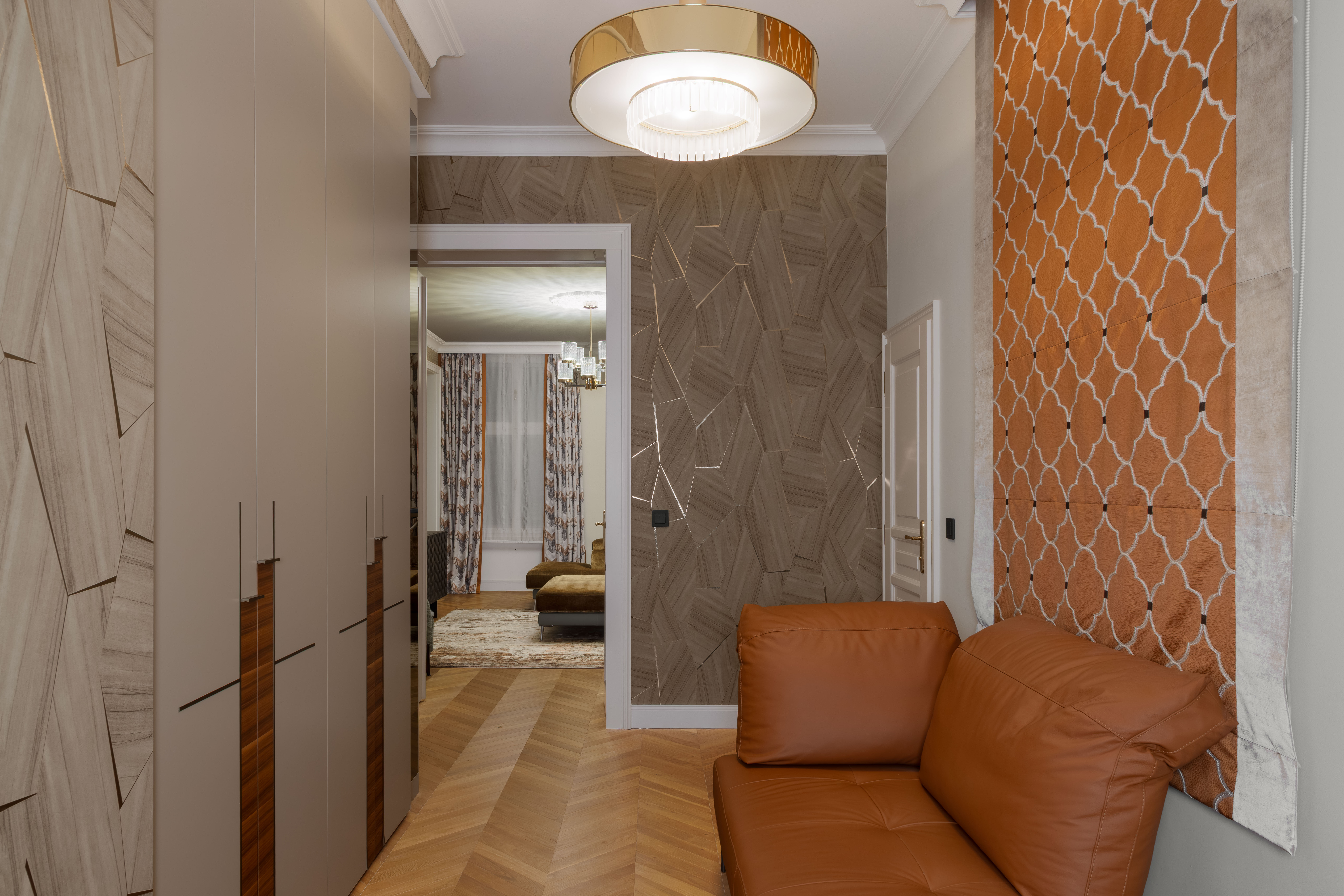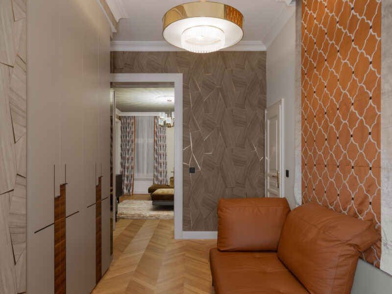 Satte, warme Farbtöne, ausdrucksstarke Akzenttapeten und raffinierte, luxuriöse Einrichtungsgegenstände schaffen eine unverwechselbare und einladende Atmosphäre in der gesamten Wohnung.