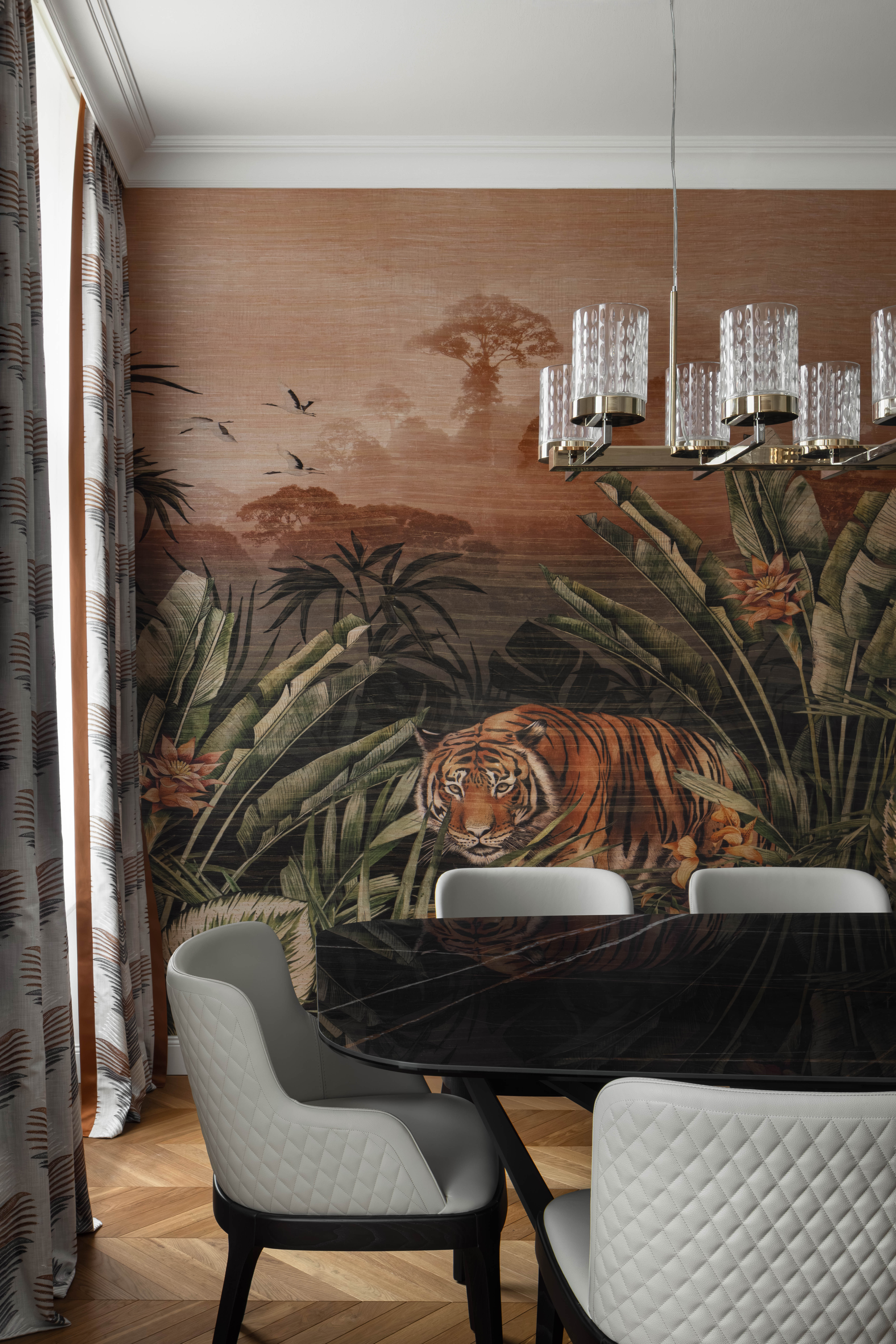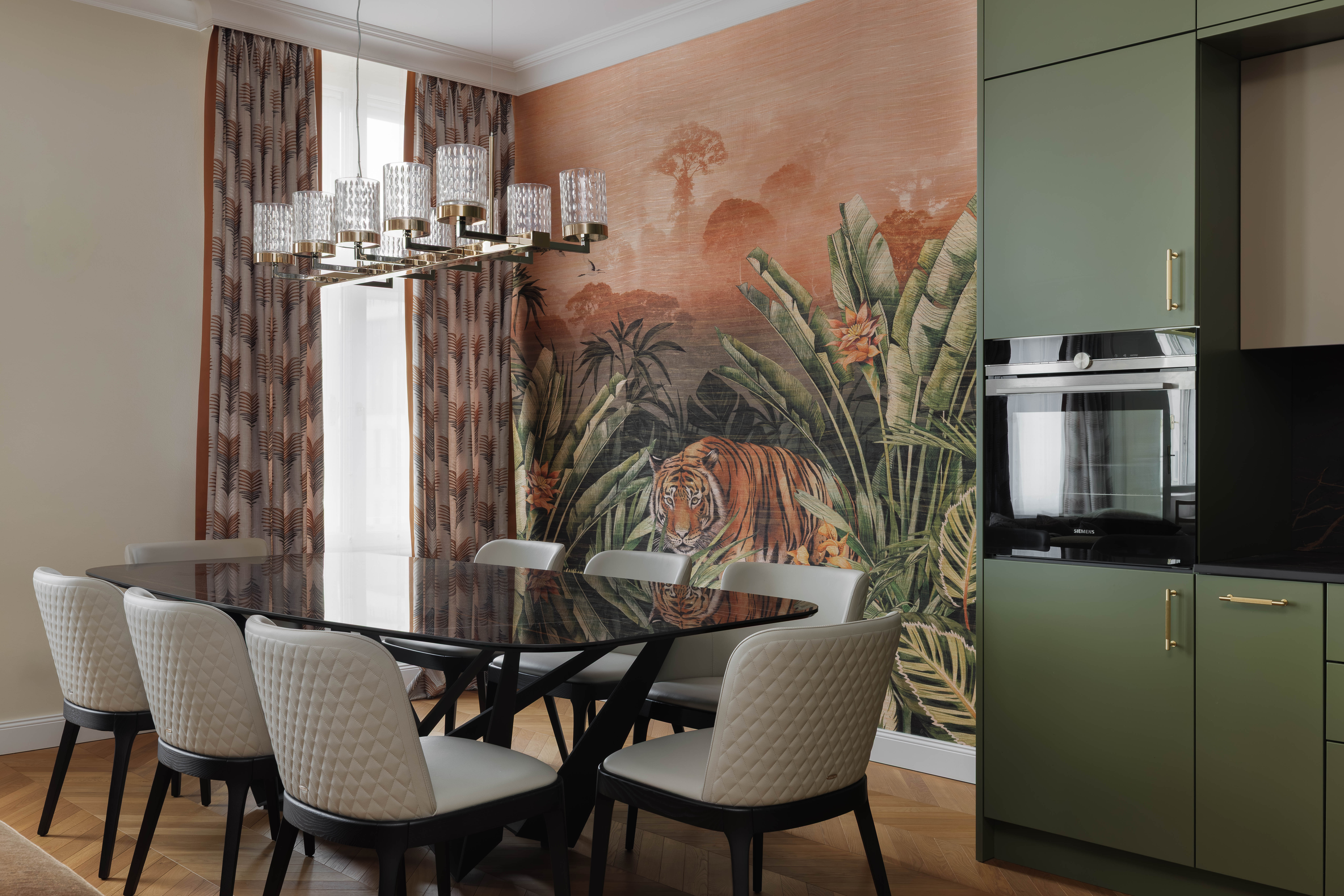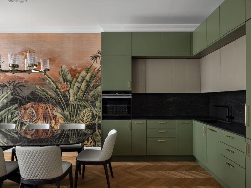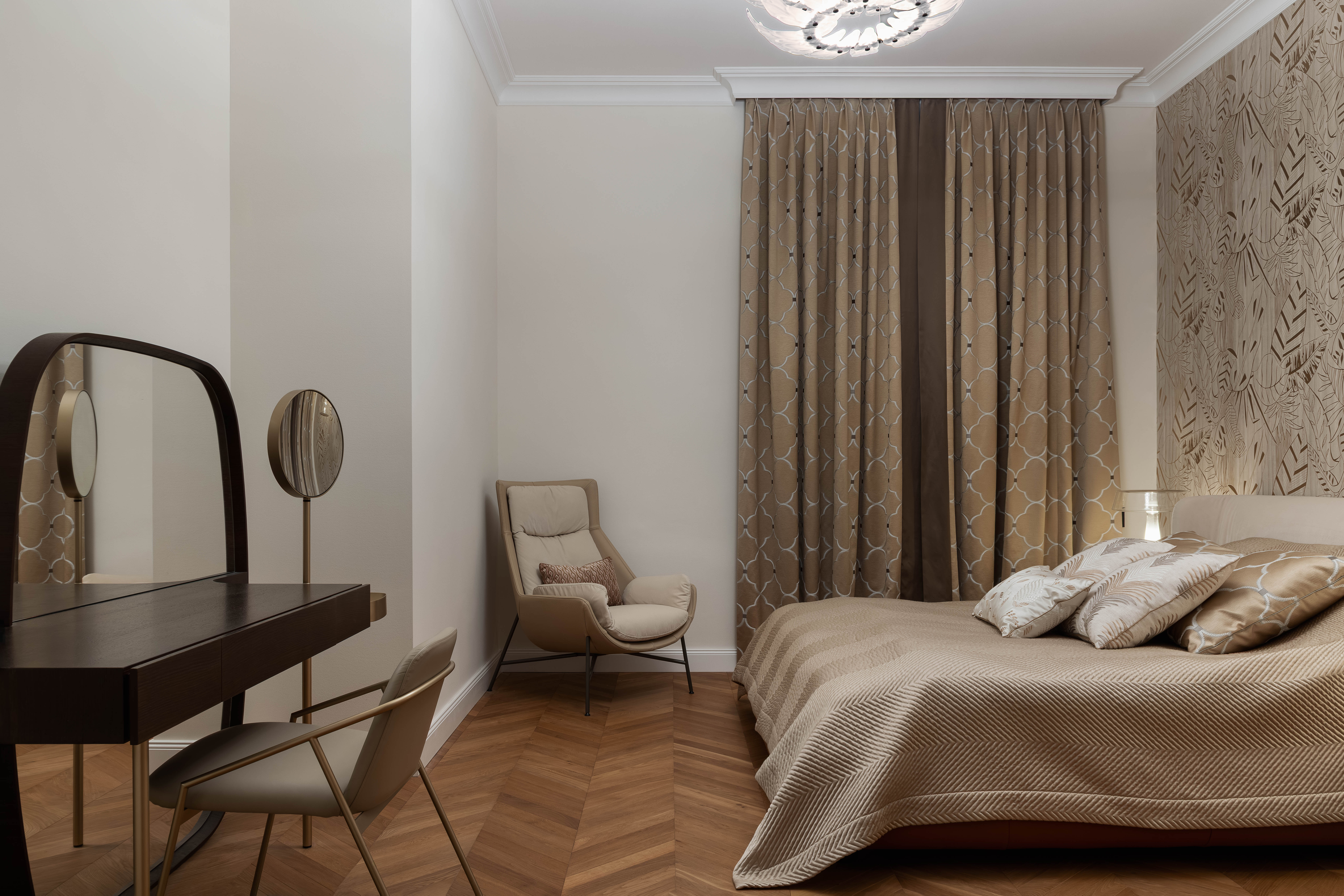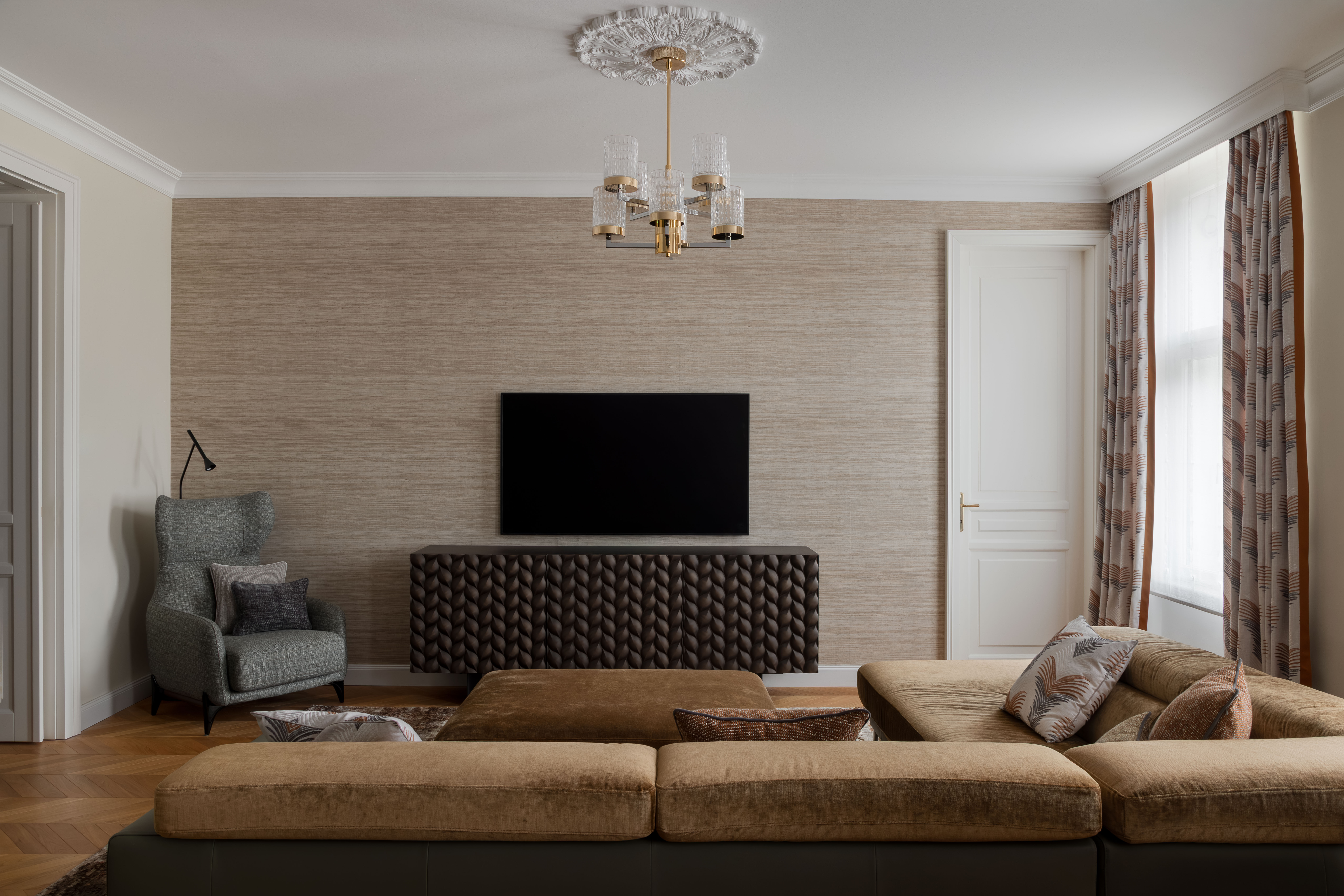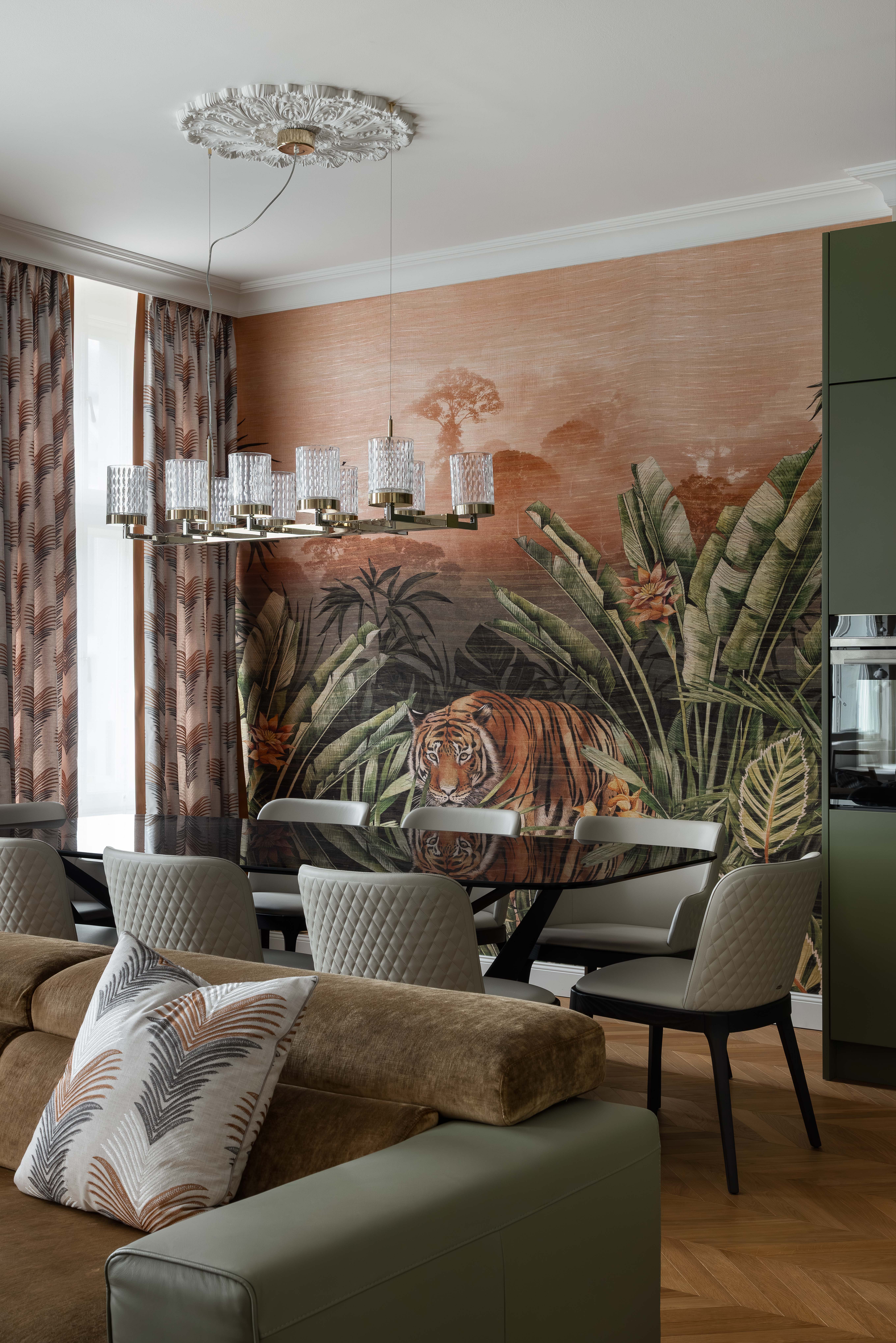 Satte, warme Farbtöne, ausdrucksstarke Akzenttapeten und raffinierte, luxuriöse Einrichtungsgegenstände schaffen eine unverwechselbare und einladende Atmosphäre in der gesamten Wohnung.
