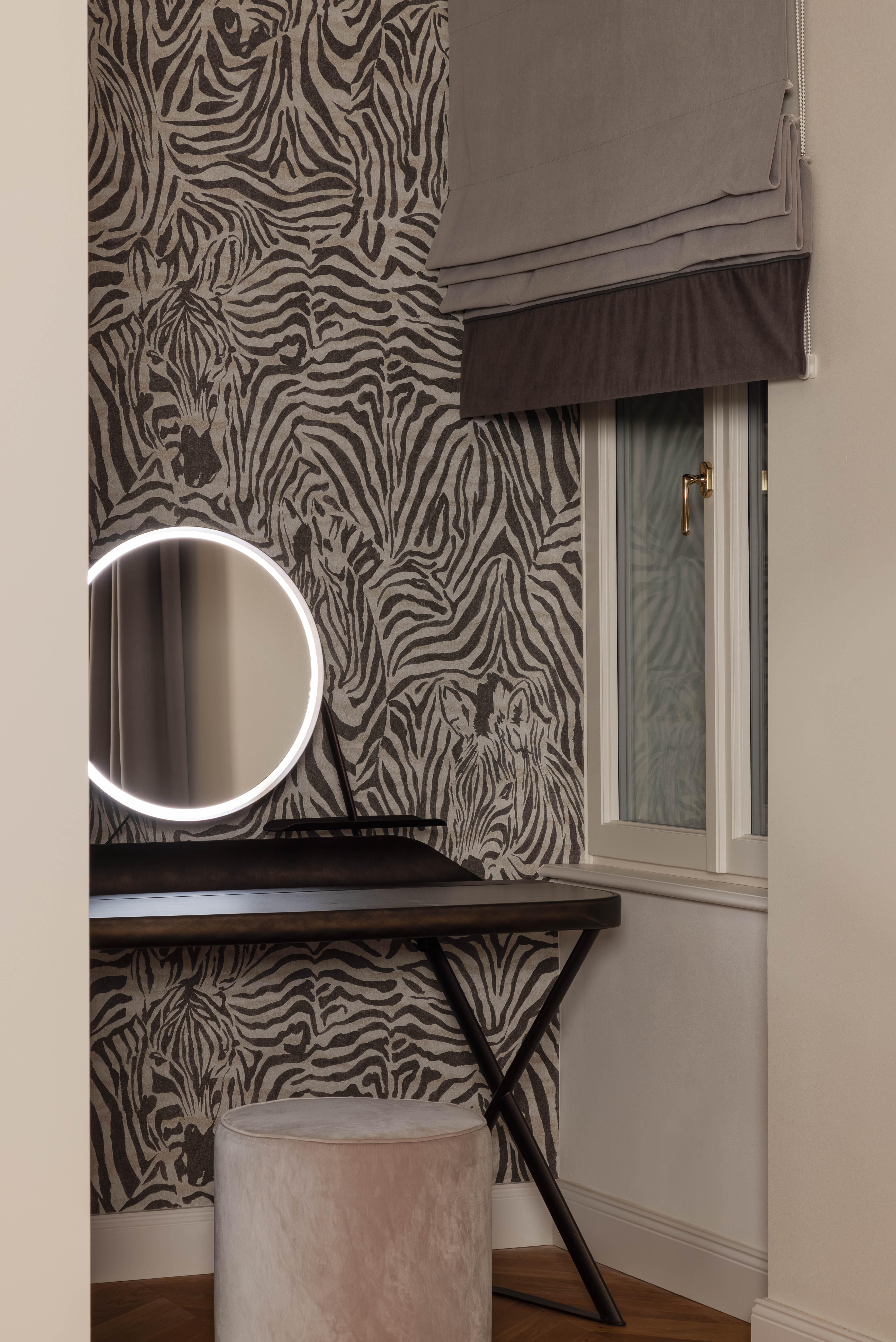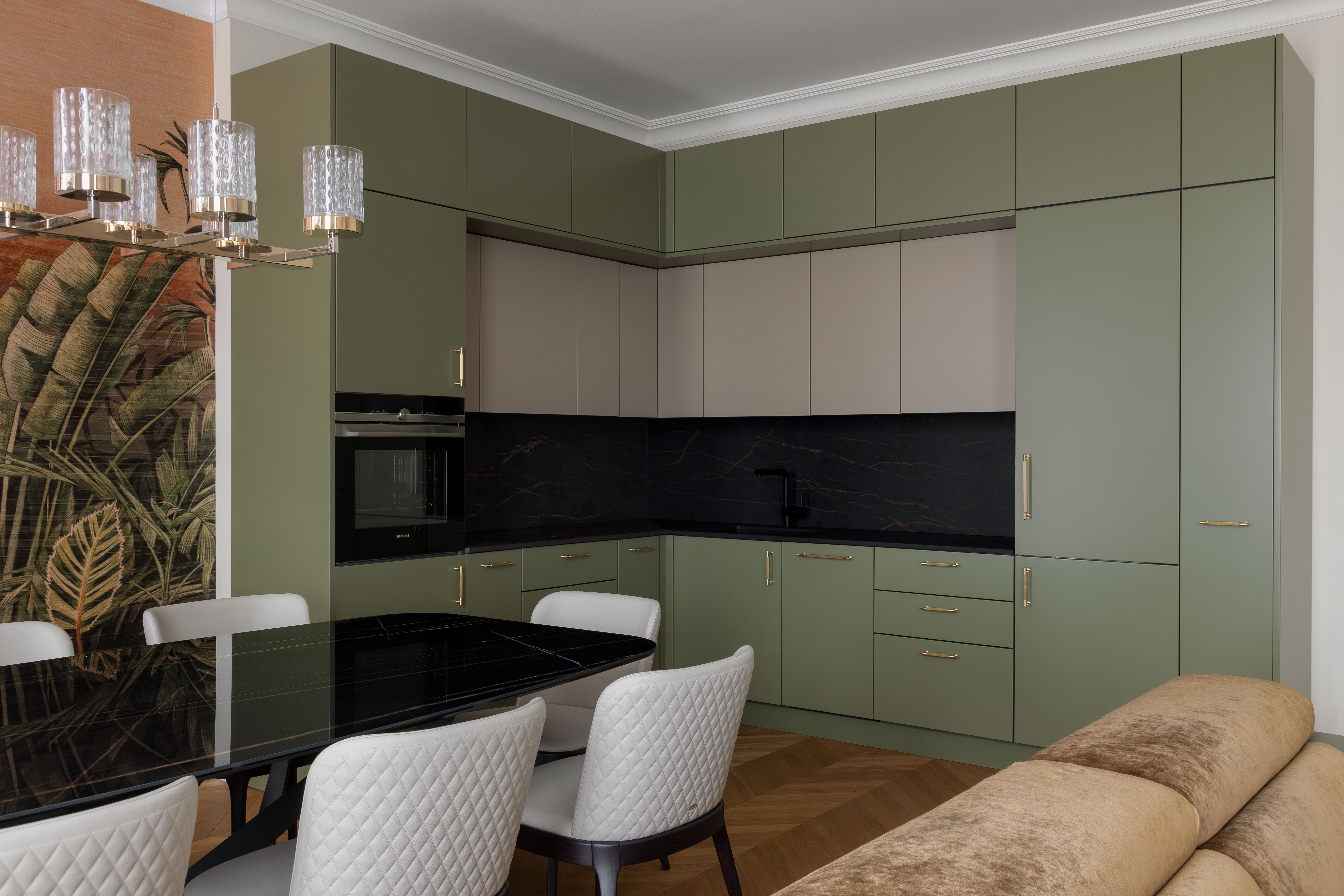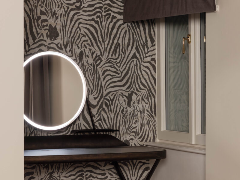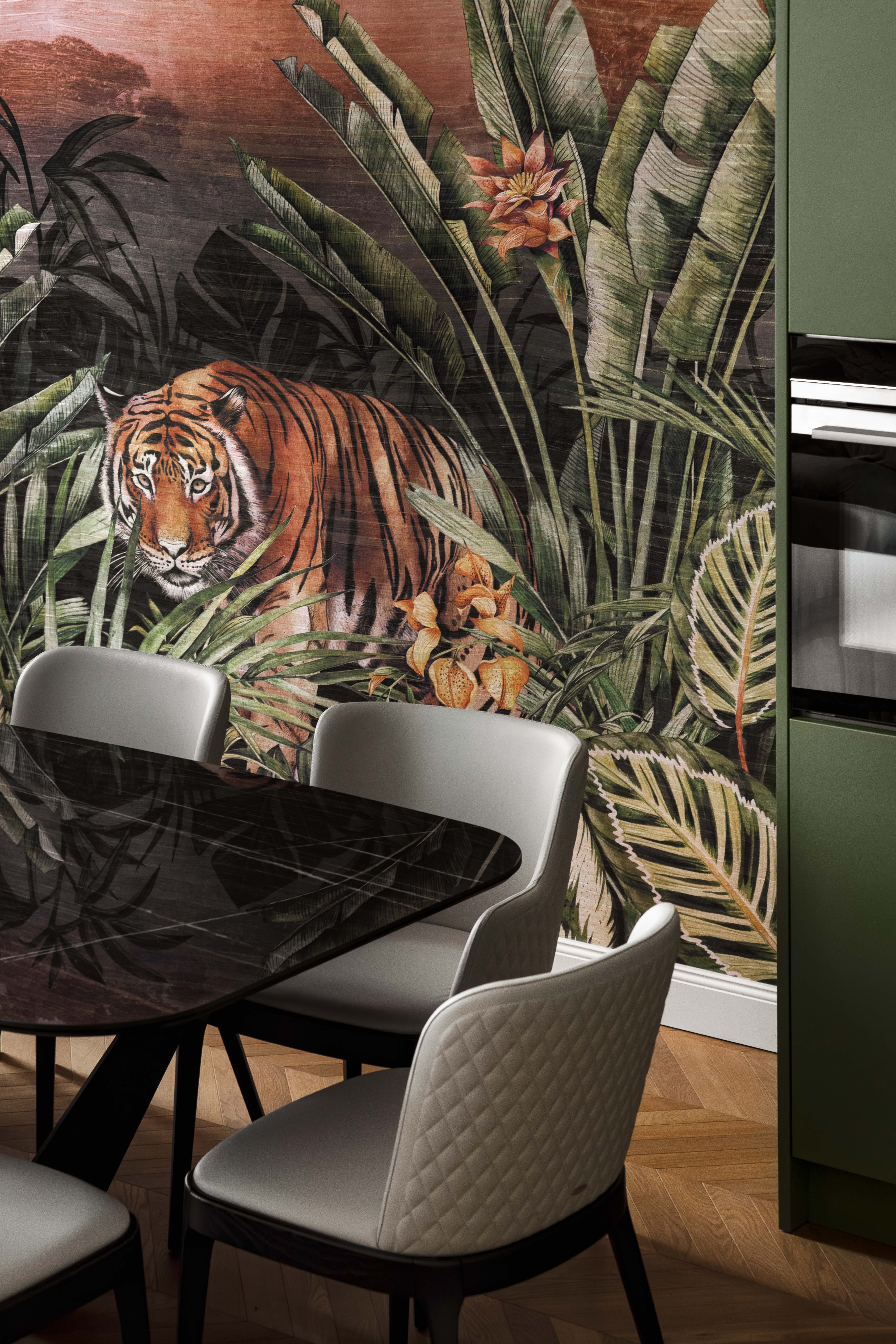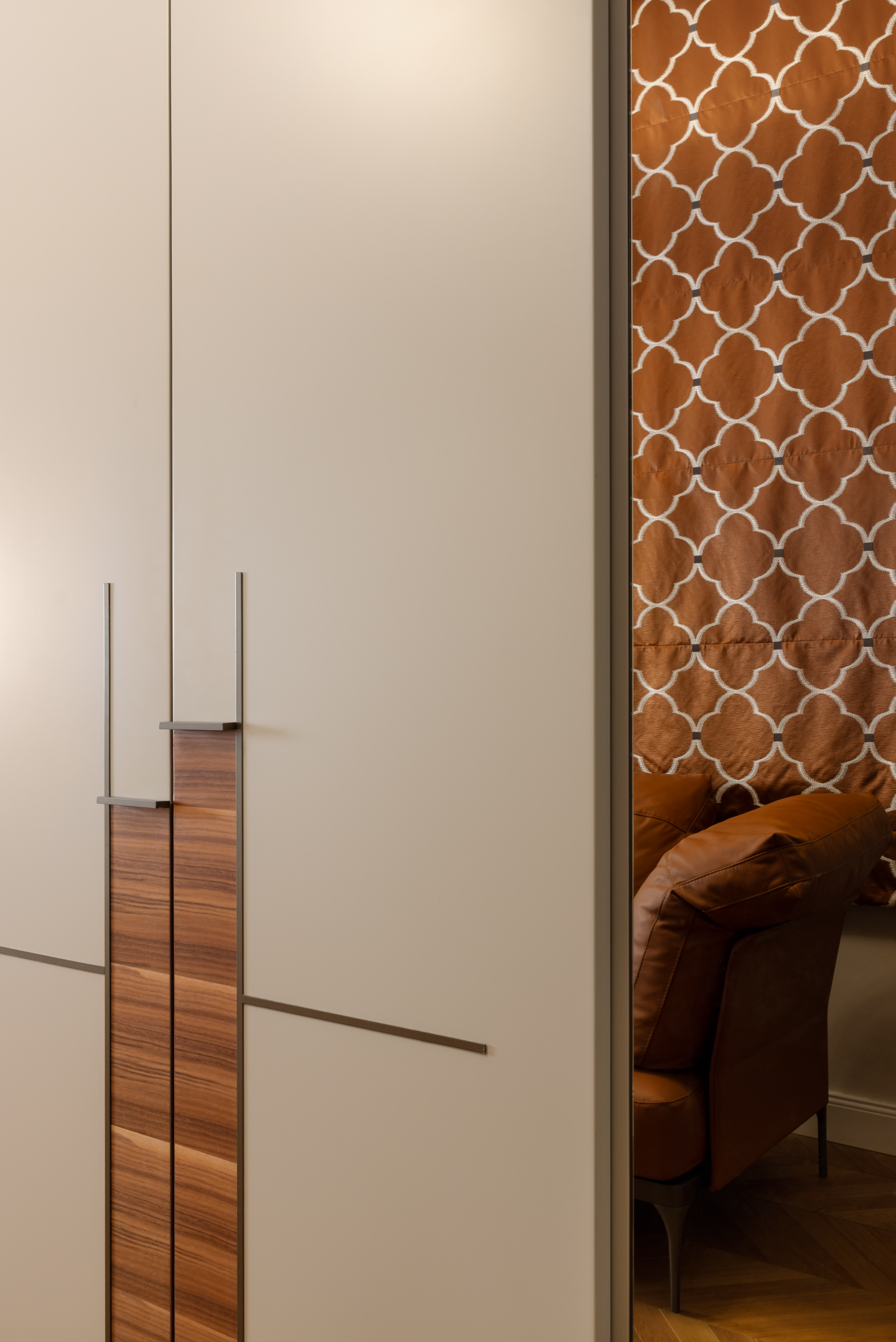 Satte, warme Farbtöne, ausdrucksstarke Akzenttapeten und raffinierte, luxuriöse Einrichtungsgegenstände schaffen eine unverwechselbare und einladende Atmosphäre in der gesamten Wohnung.