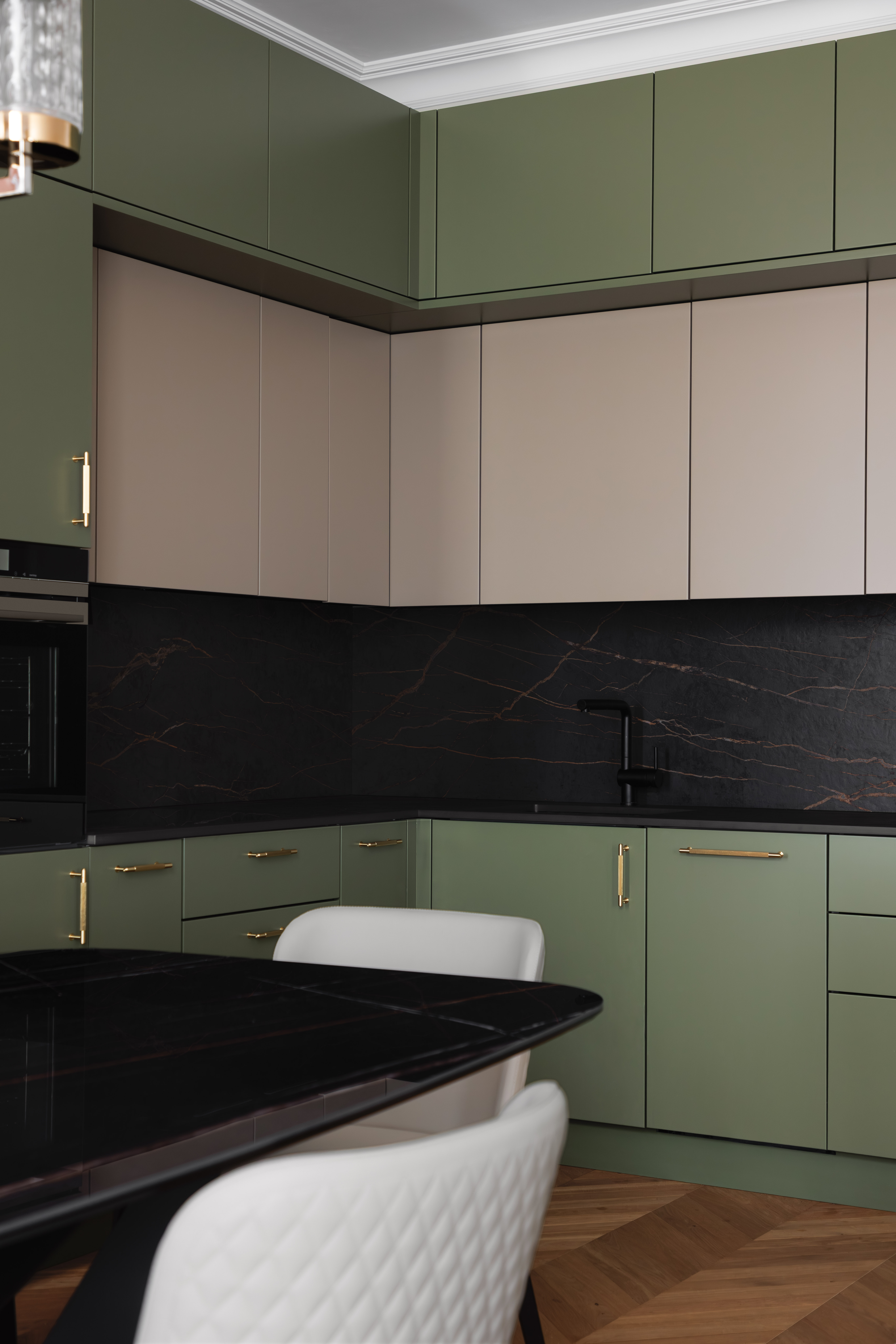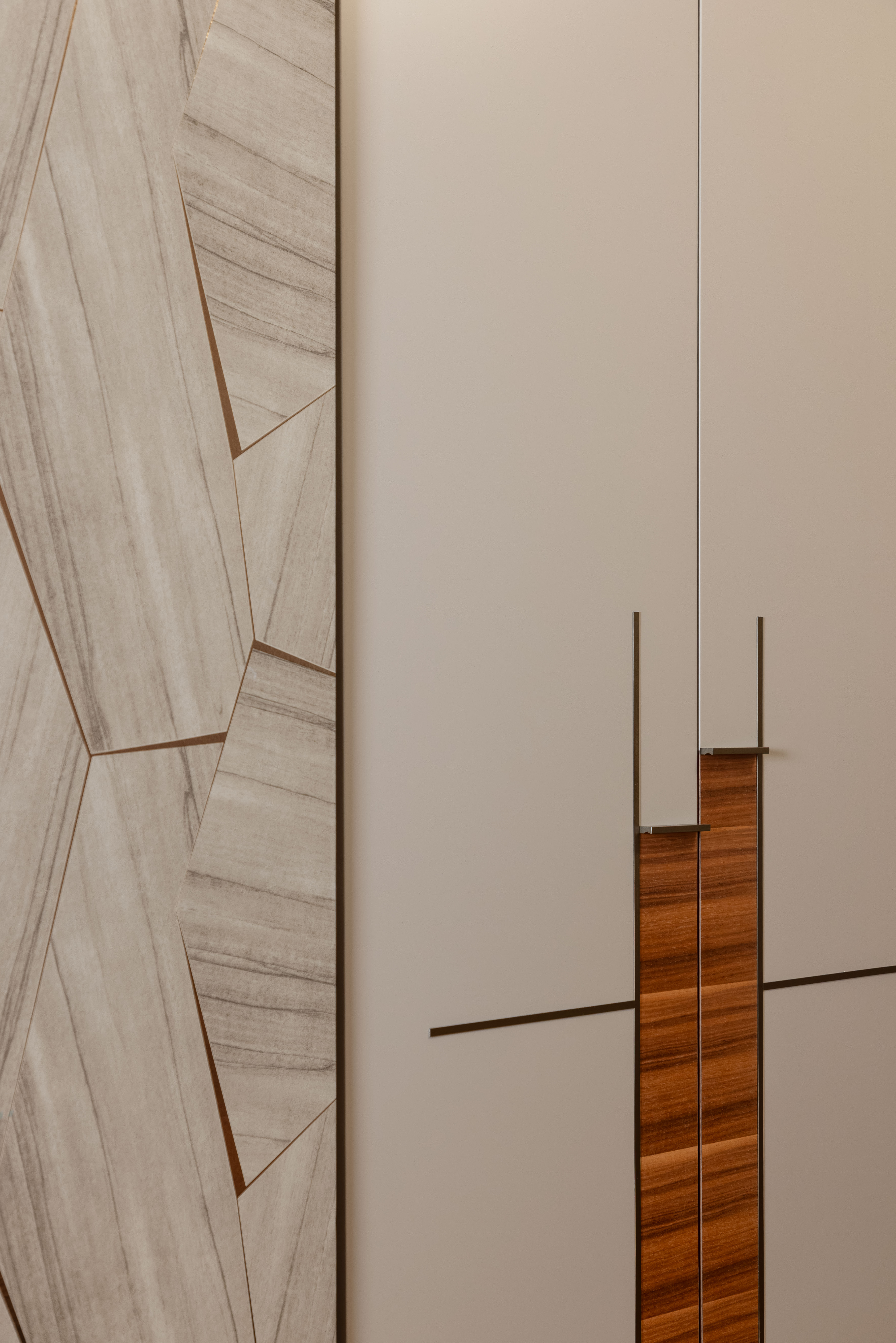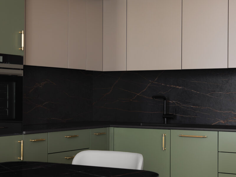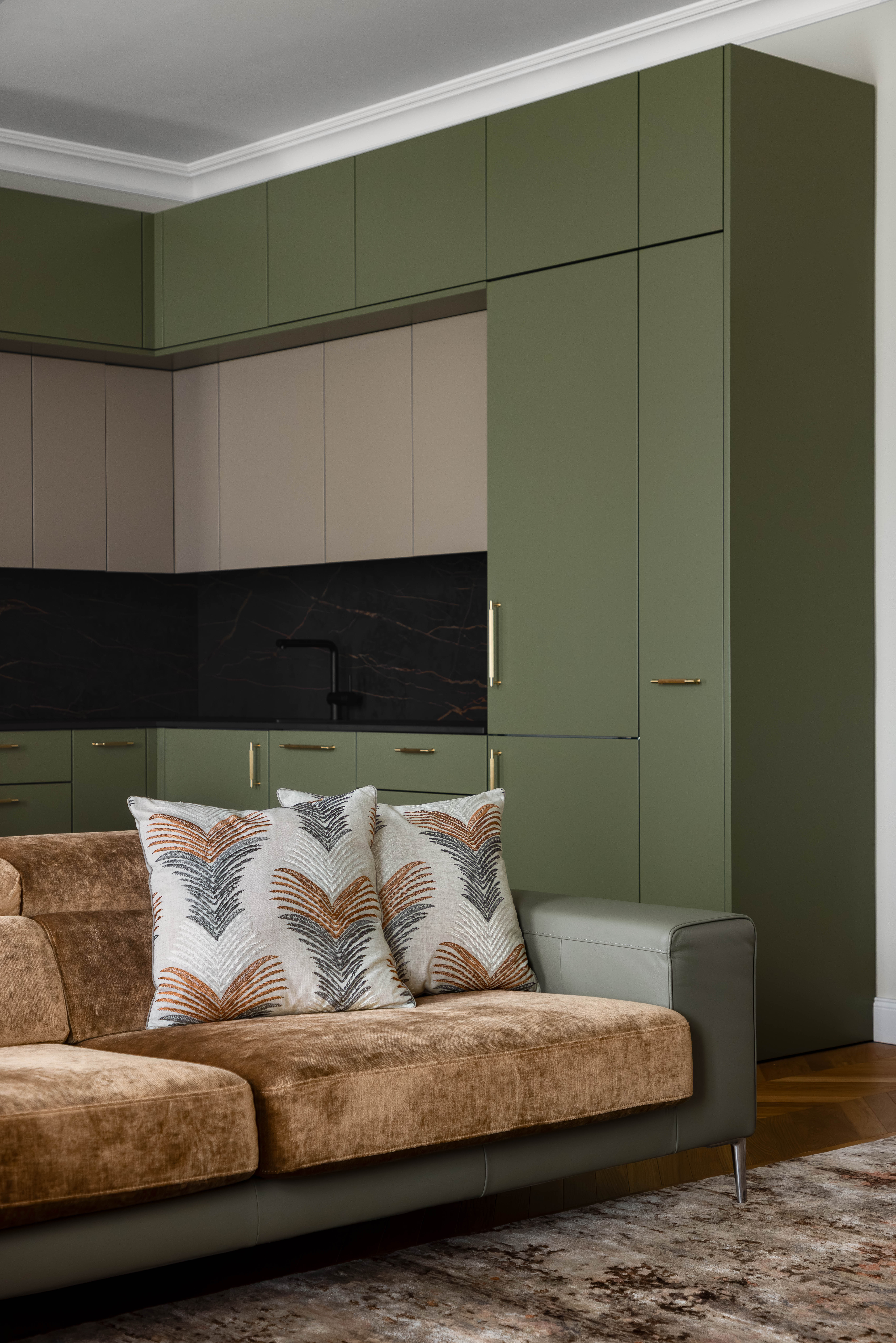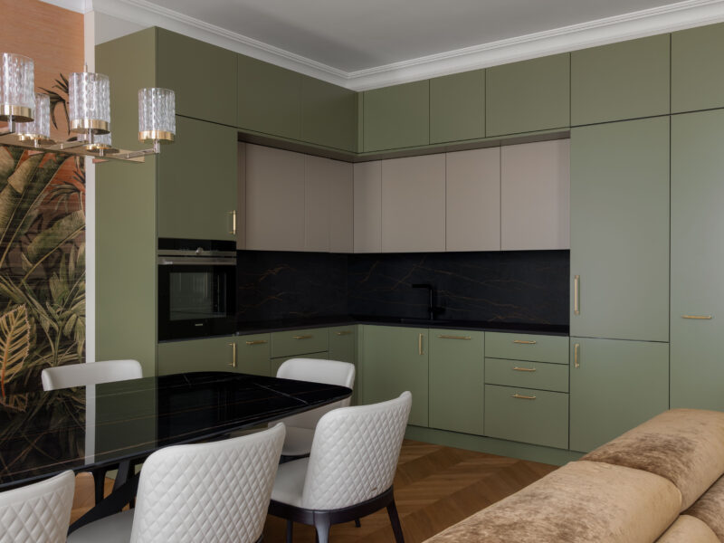 Für dieses Projekt fertigte Arevente & Partner maßgeschneiderte Einbauten – von maßgefertigten Kleiderschränken bis hin zu einer nahtlos integrierten Küche –, wobei jedes Stück sorgfältig so gestaltet wurde, dass es sich harmonisch in den Raum einfügt und gleichzeitig maximal funktional und benutzerfreundlich ist.