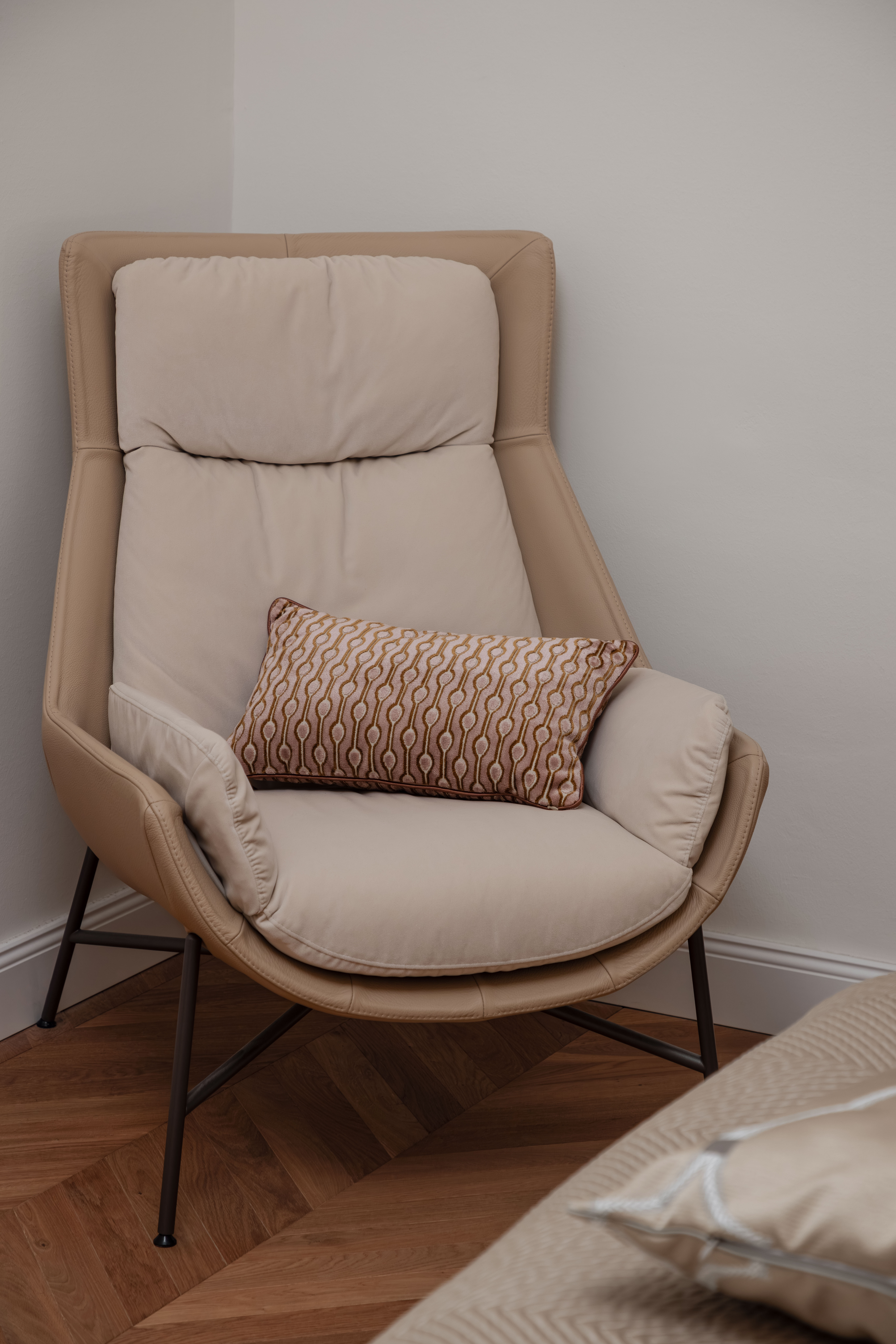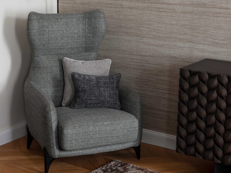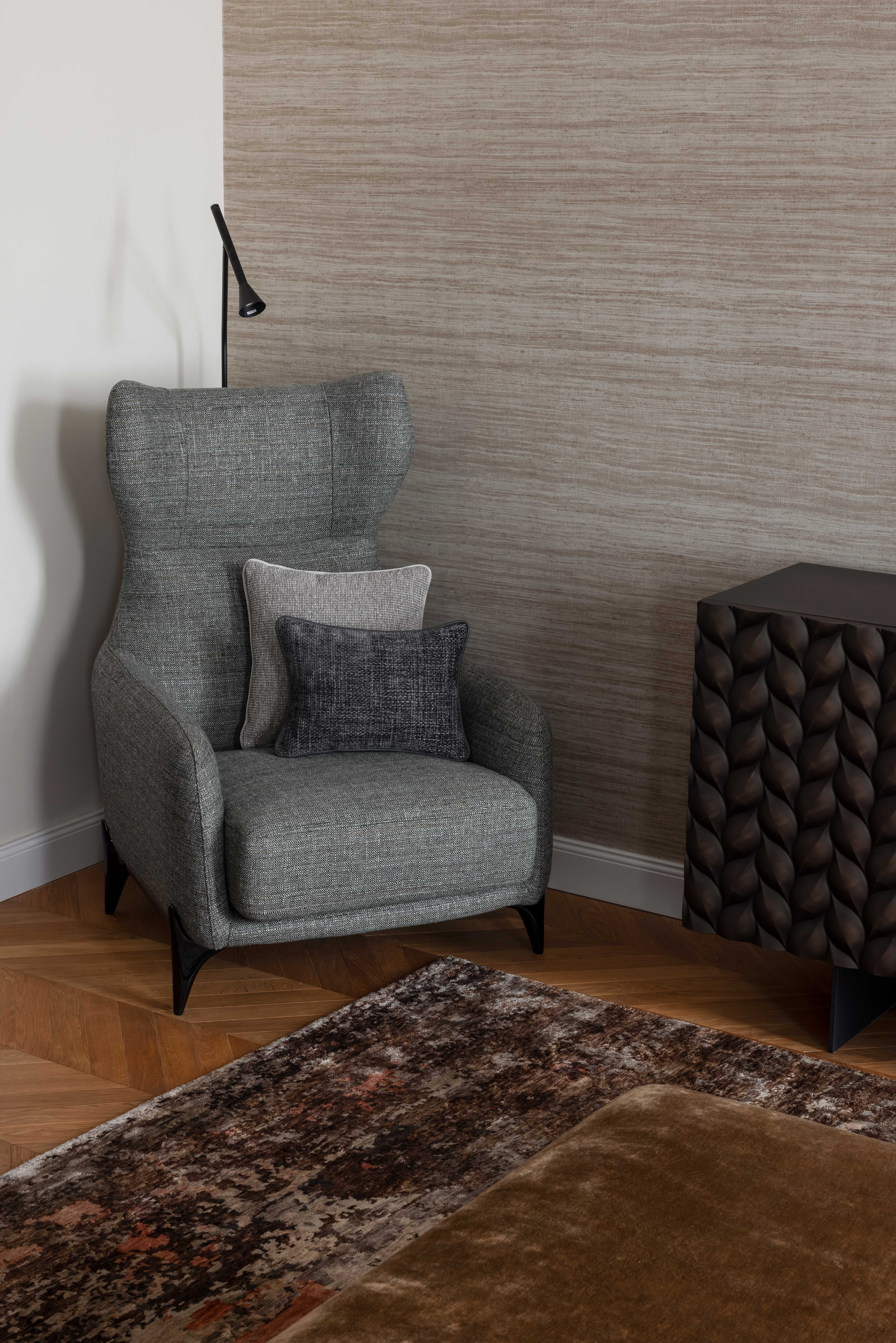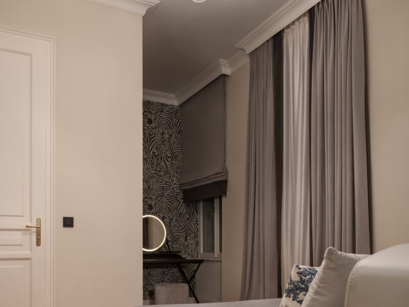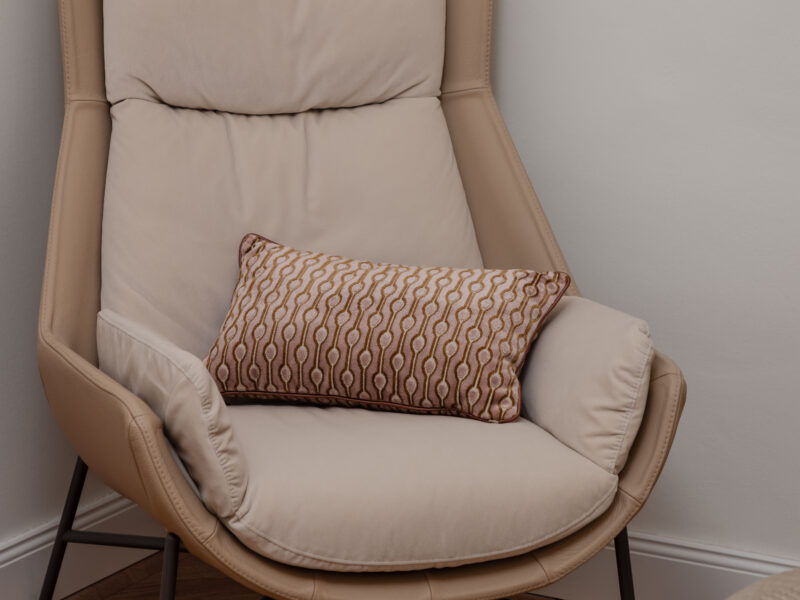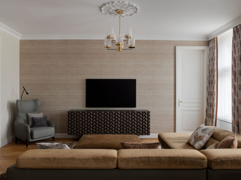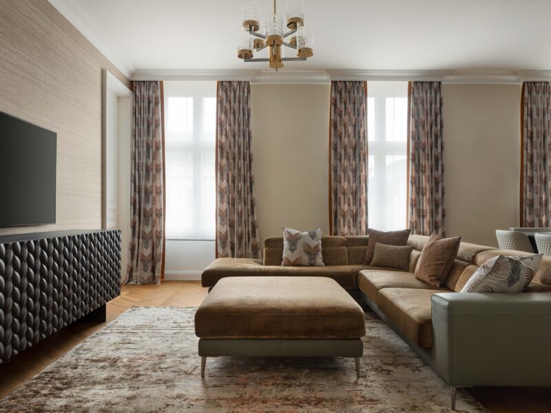 Nicht zuletzt sind die exquisiten Textilien aus unserem Home Atelier ein Highlight für sich: Maßgeschneiderte Vorhänge und handgefertigte Kissen runden das Interieur elegant ab und verleihen ihm Tiefe, Weichheit und eine warme, einladende Atmosphäre.