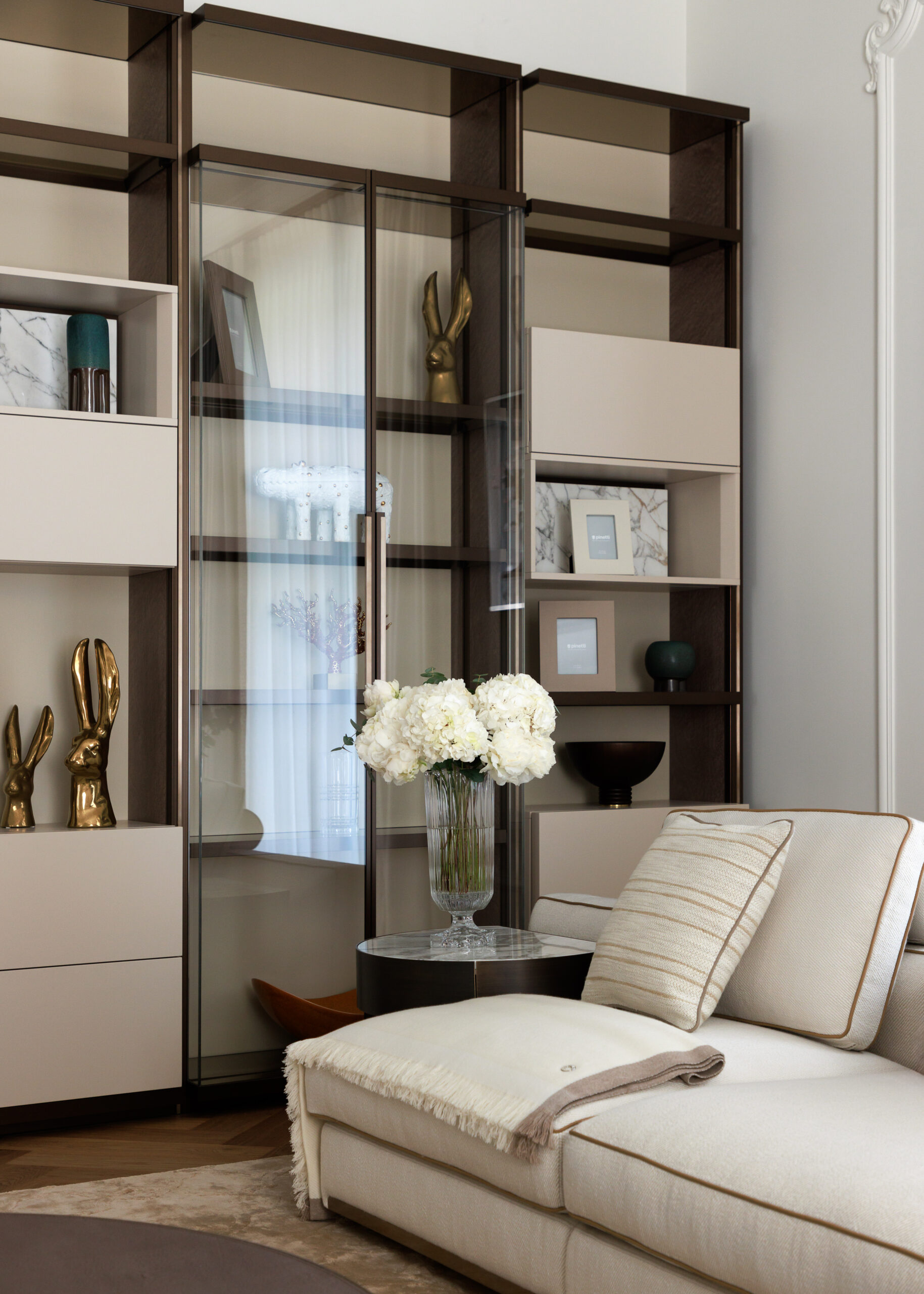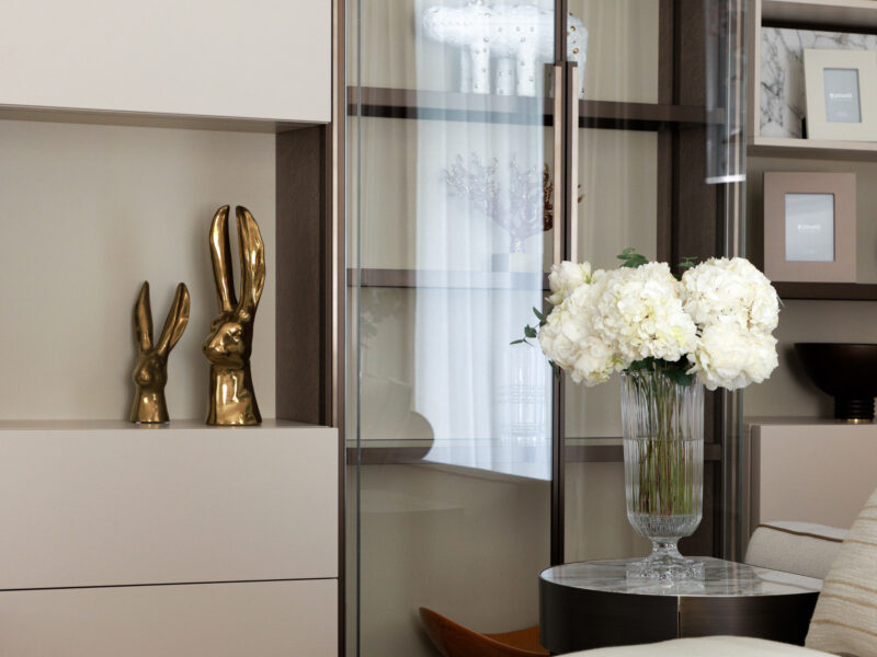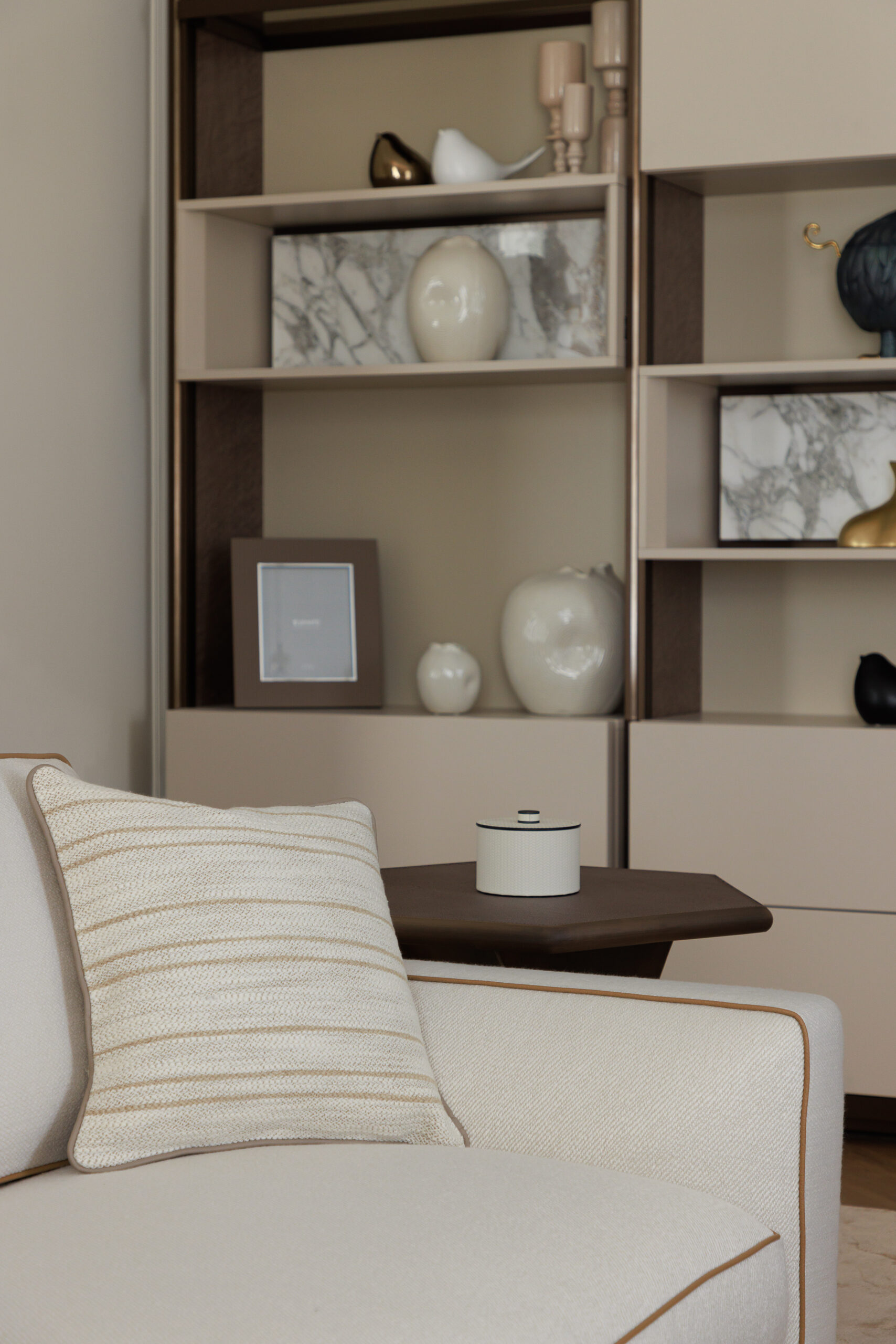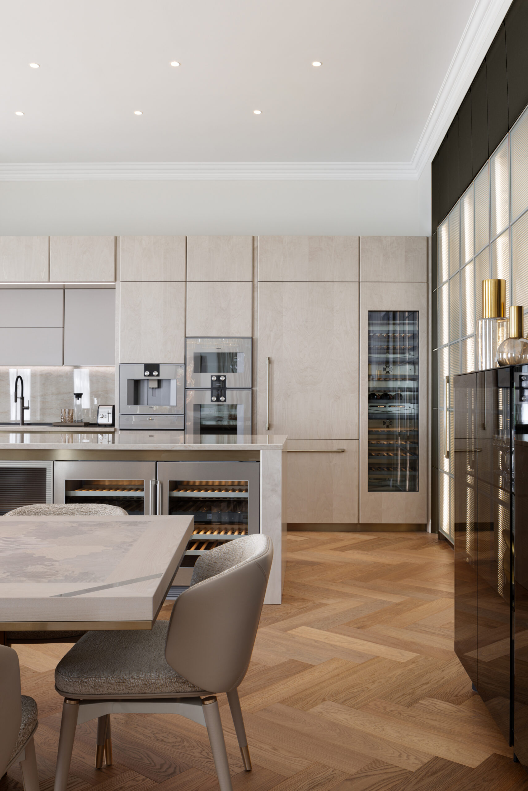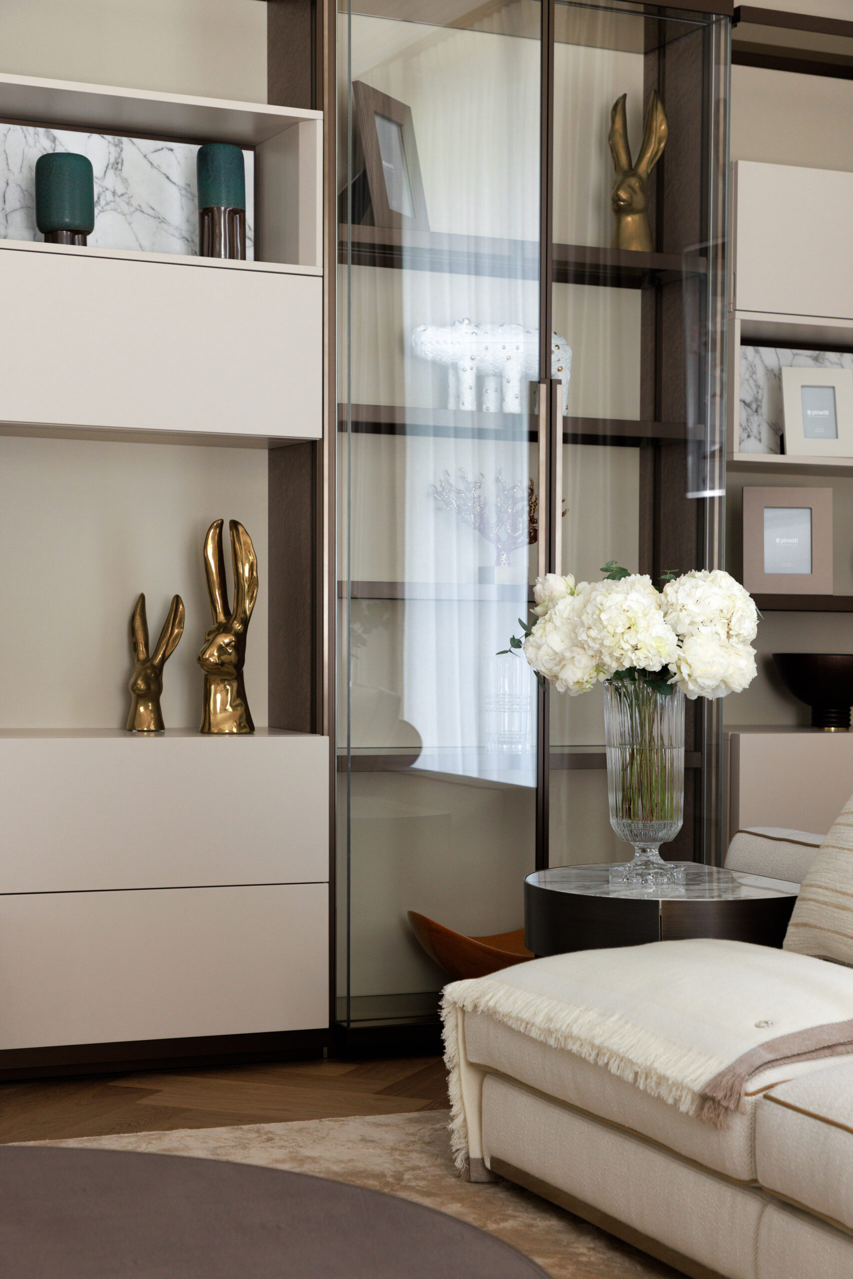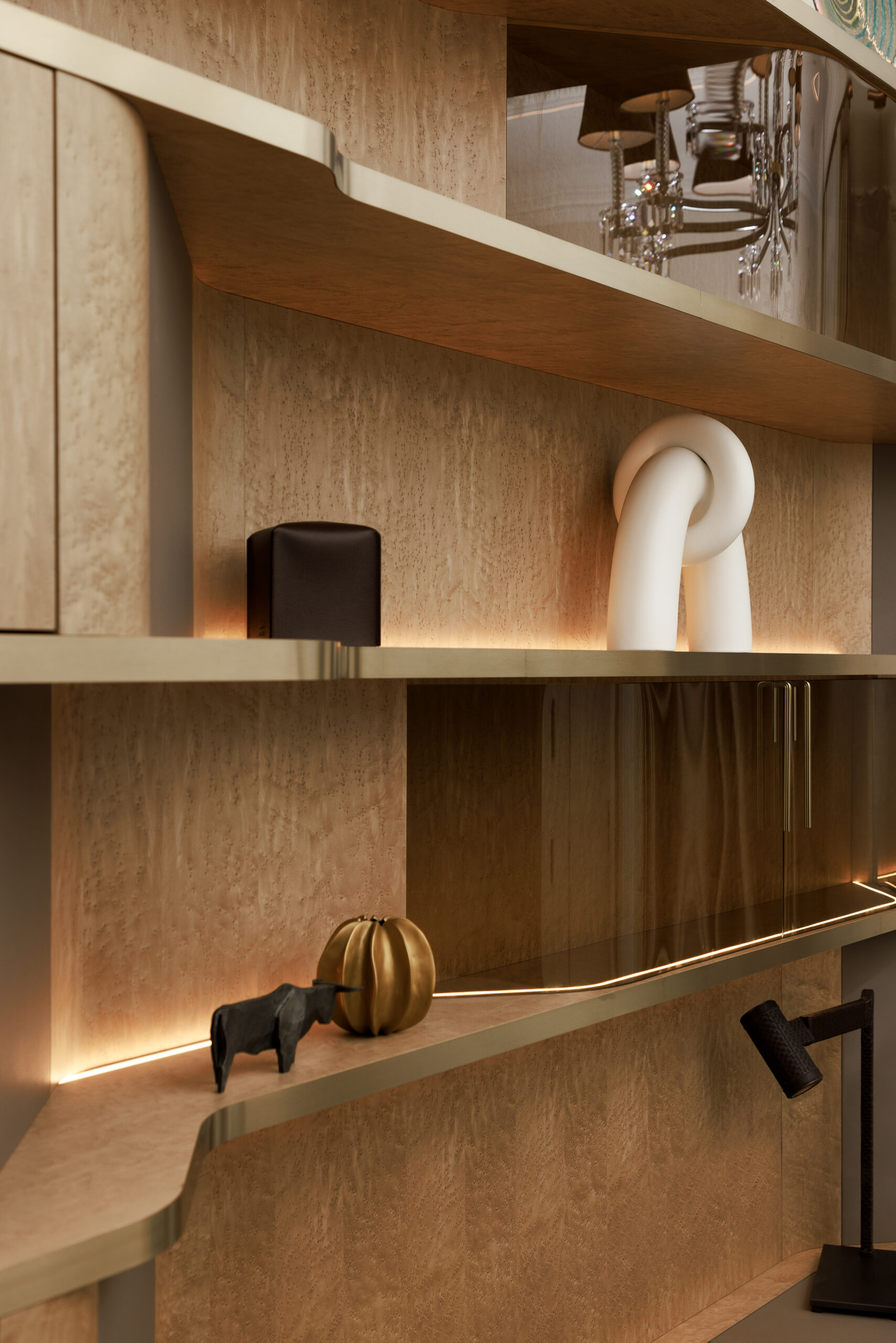 Für dieses Projekt wurden Möbel von Visionnaire sorgfältig ausgewählt und durch eine Reihe von speziell für diesen Raum angefertigten Elementen ergänzt. Zu den wichtigsten Sonderanfertigungen zählen die integrierten Küchenschränke und ein maßgeschneiderter Regalschrank für das Homeoffice, die beide Funktionalität mit architektonischer Raffinesse verbinden.