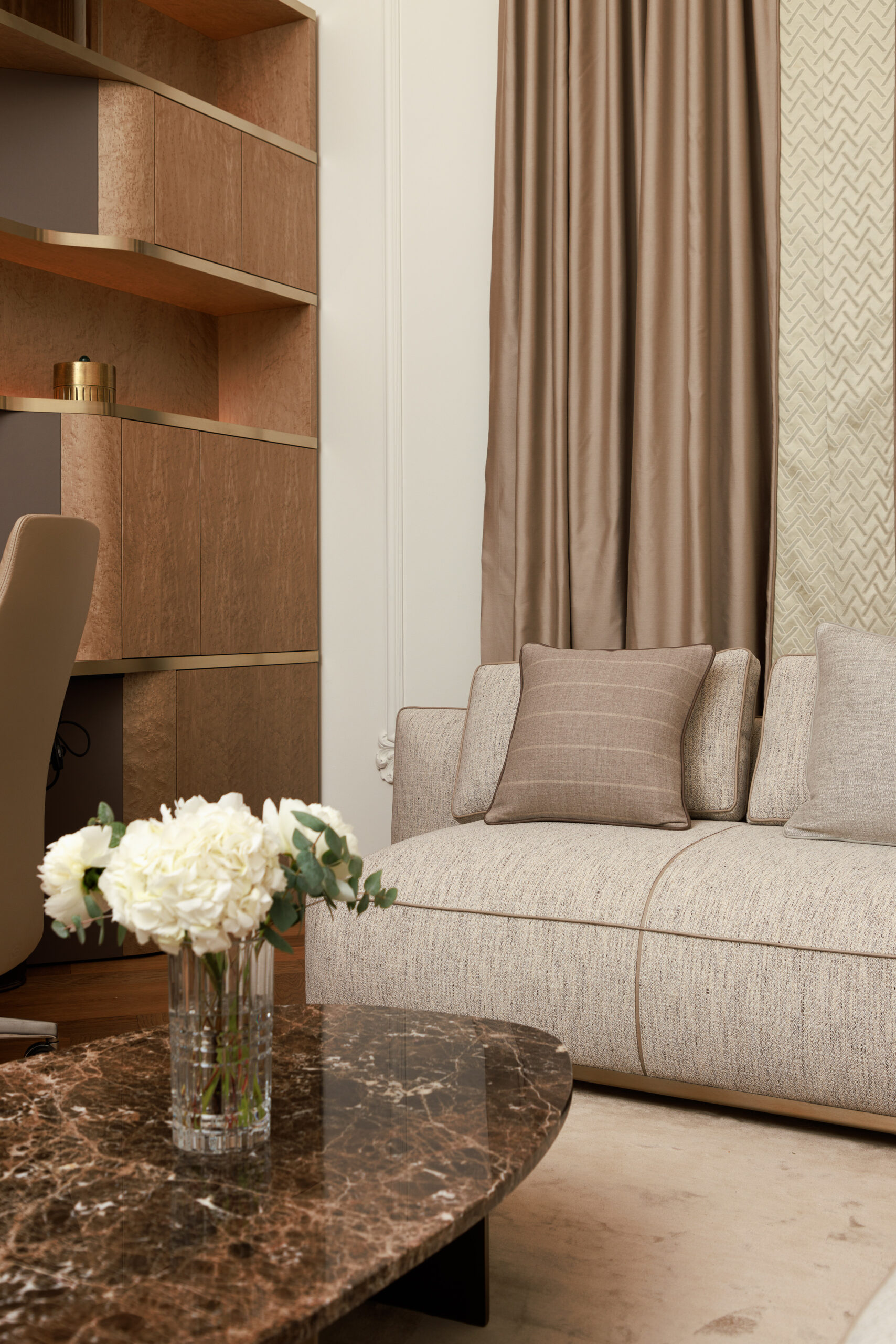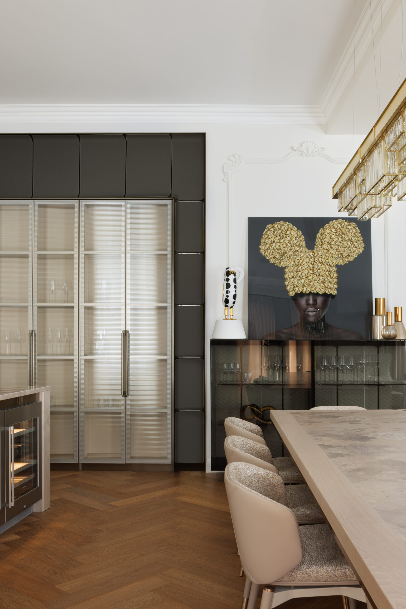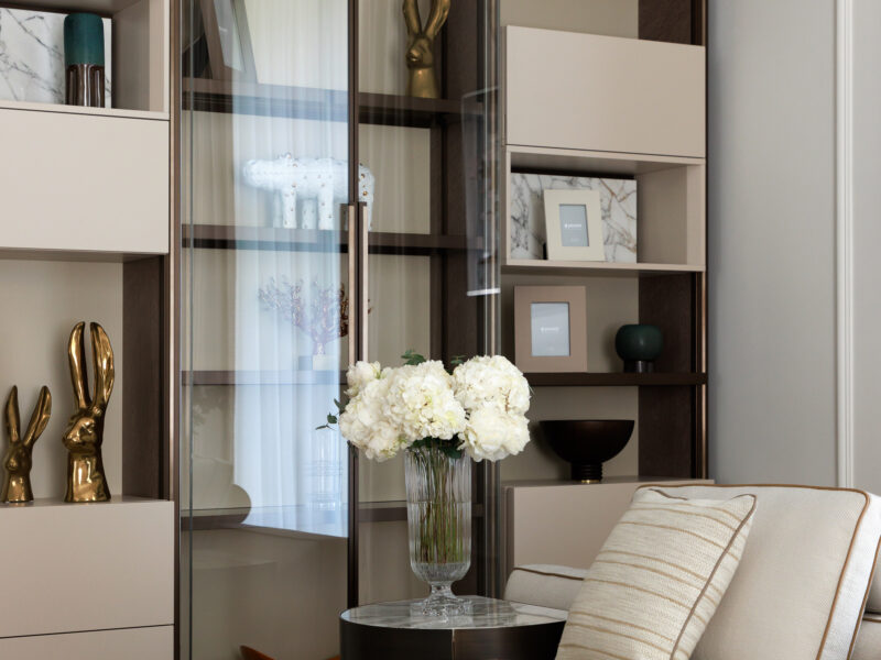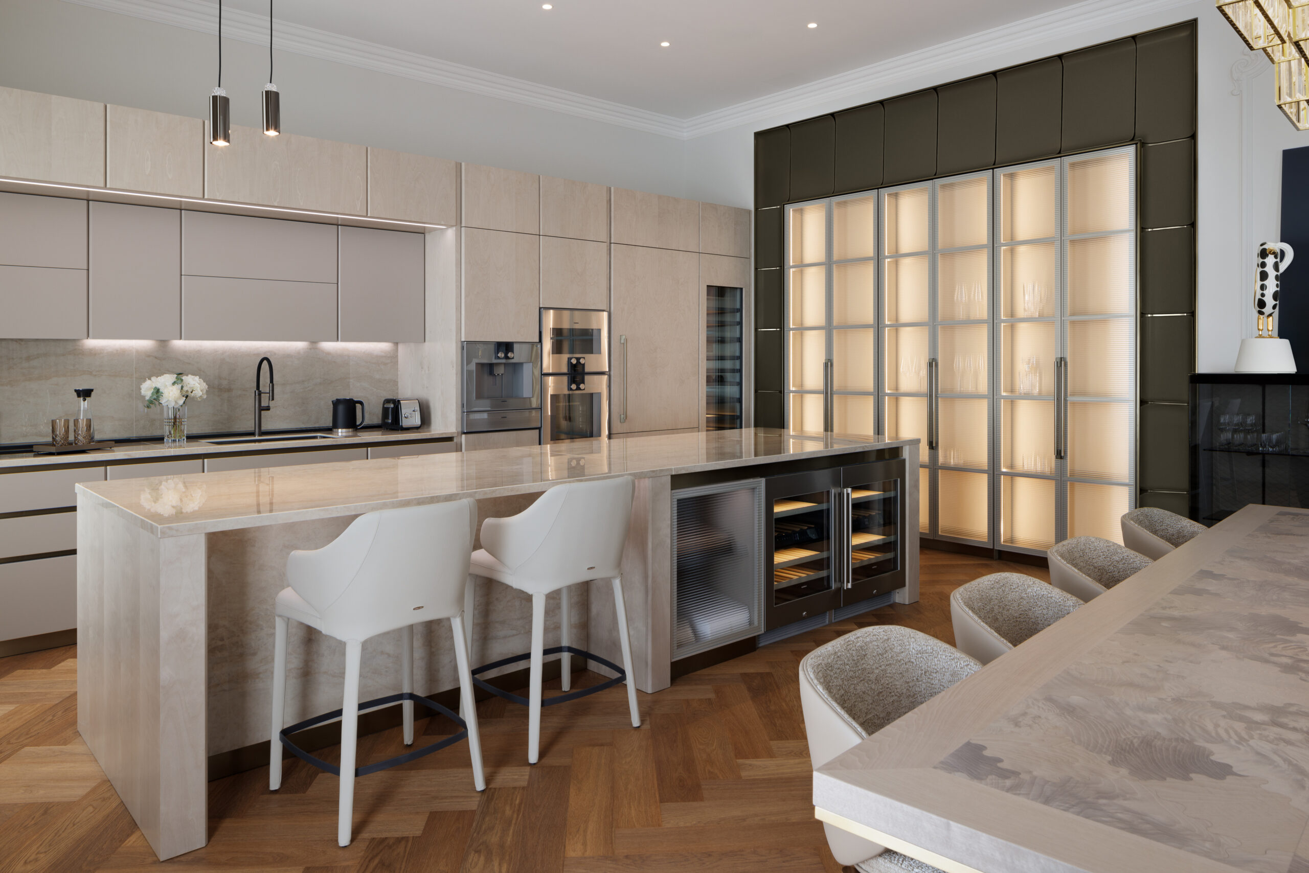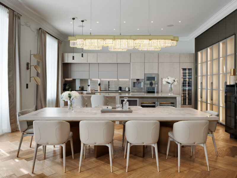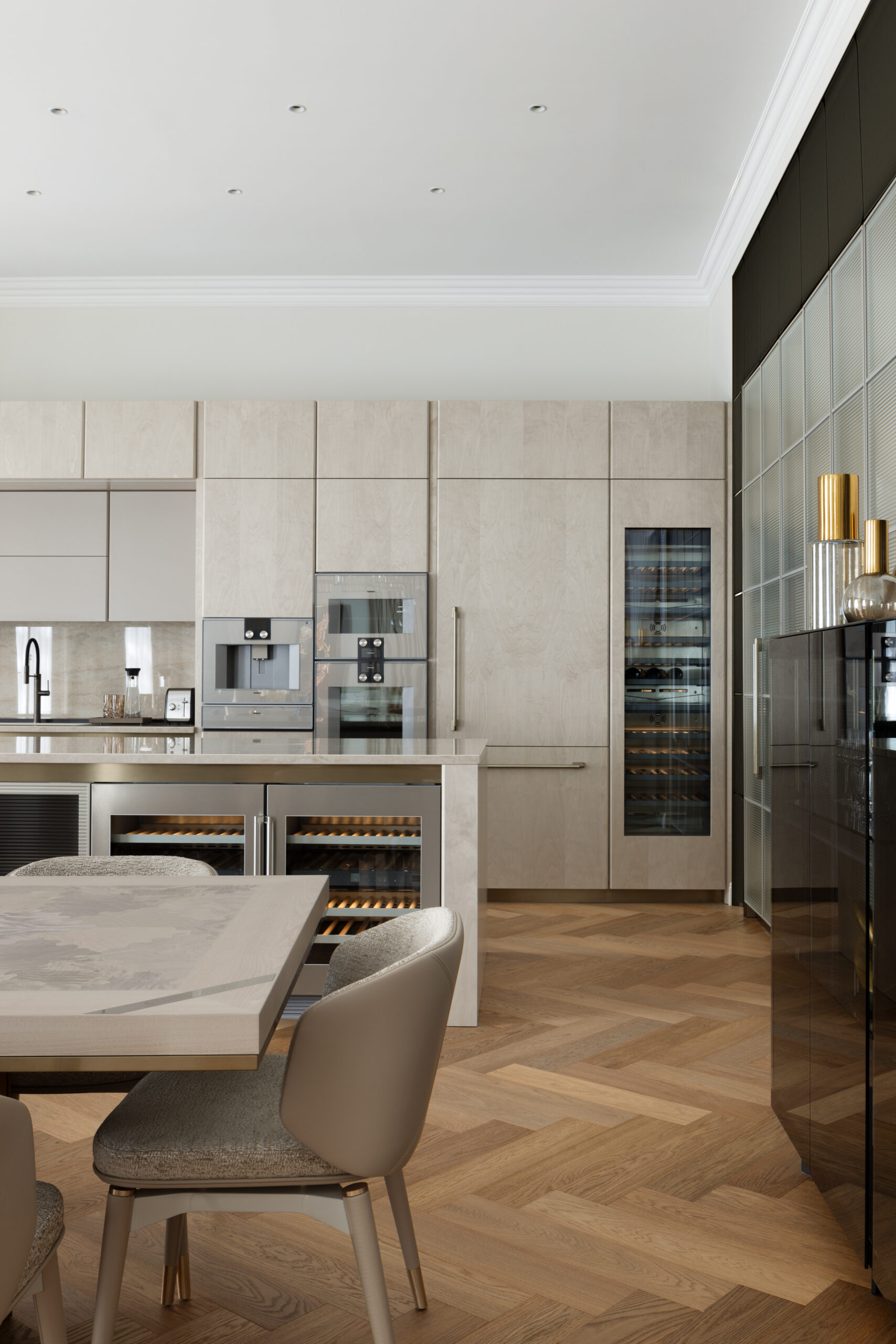 Für dieses Projekt wurden Möbel von Visionnaire sorgfältig ausgewählt und durch eine Reihe von speziell für diesen Raum angefertigten Elementen ergänzt. Zu den wichtigsten Sonderanfertigungen zählen die integrierten Küchenschränke und ein maßgeschneiderter Regalschrank für das Homeoffice, die beide Funktionalität mit architektonischer Raffinesse verbinden.