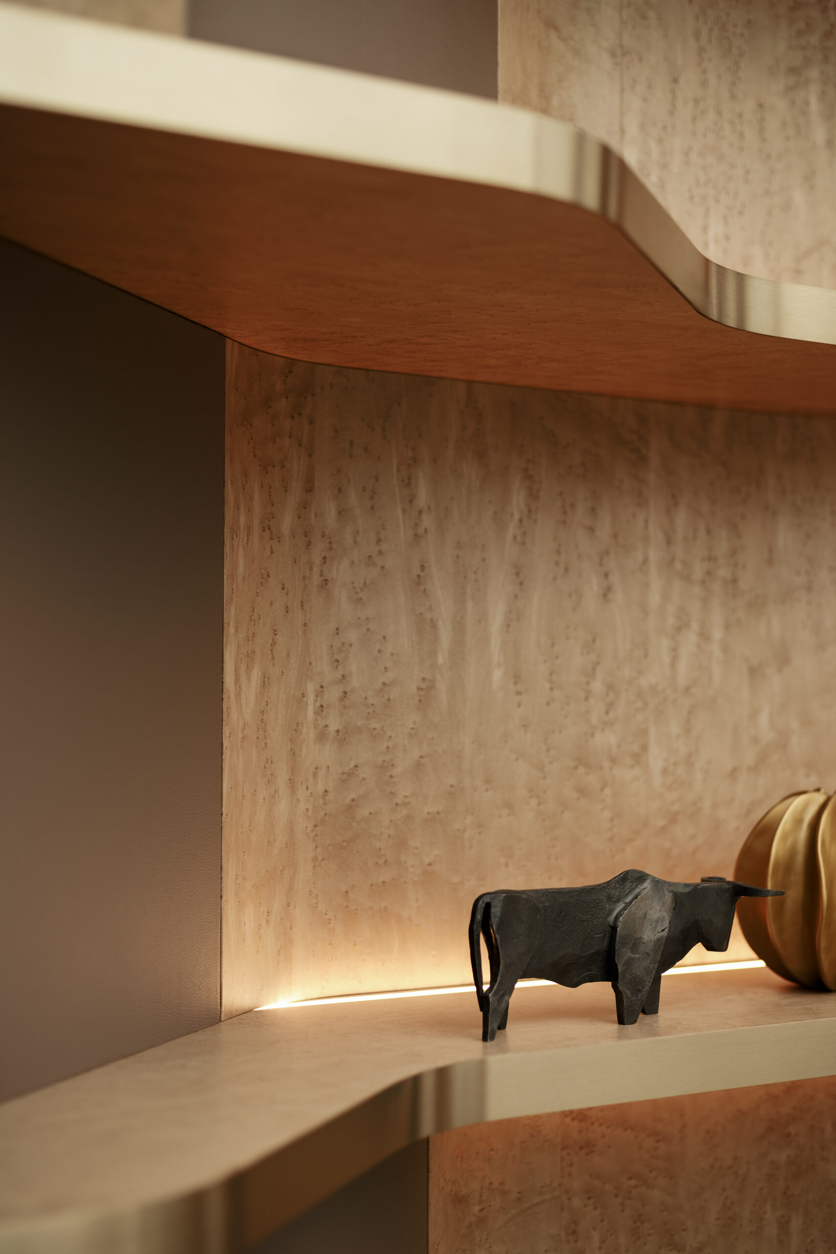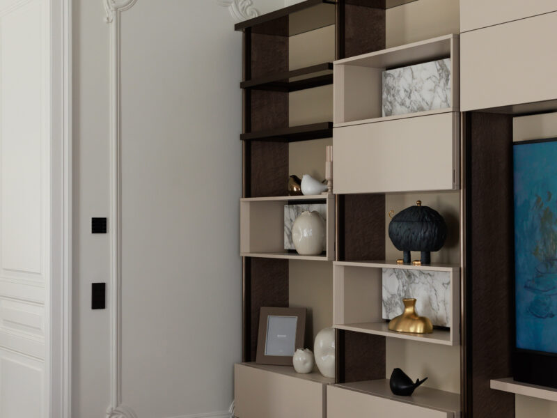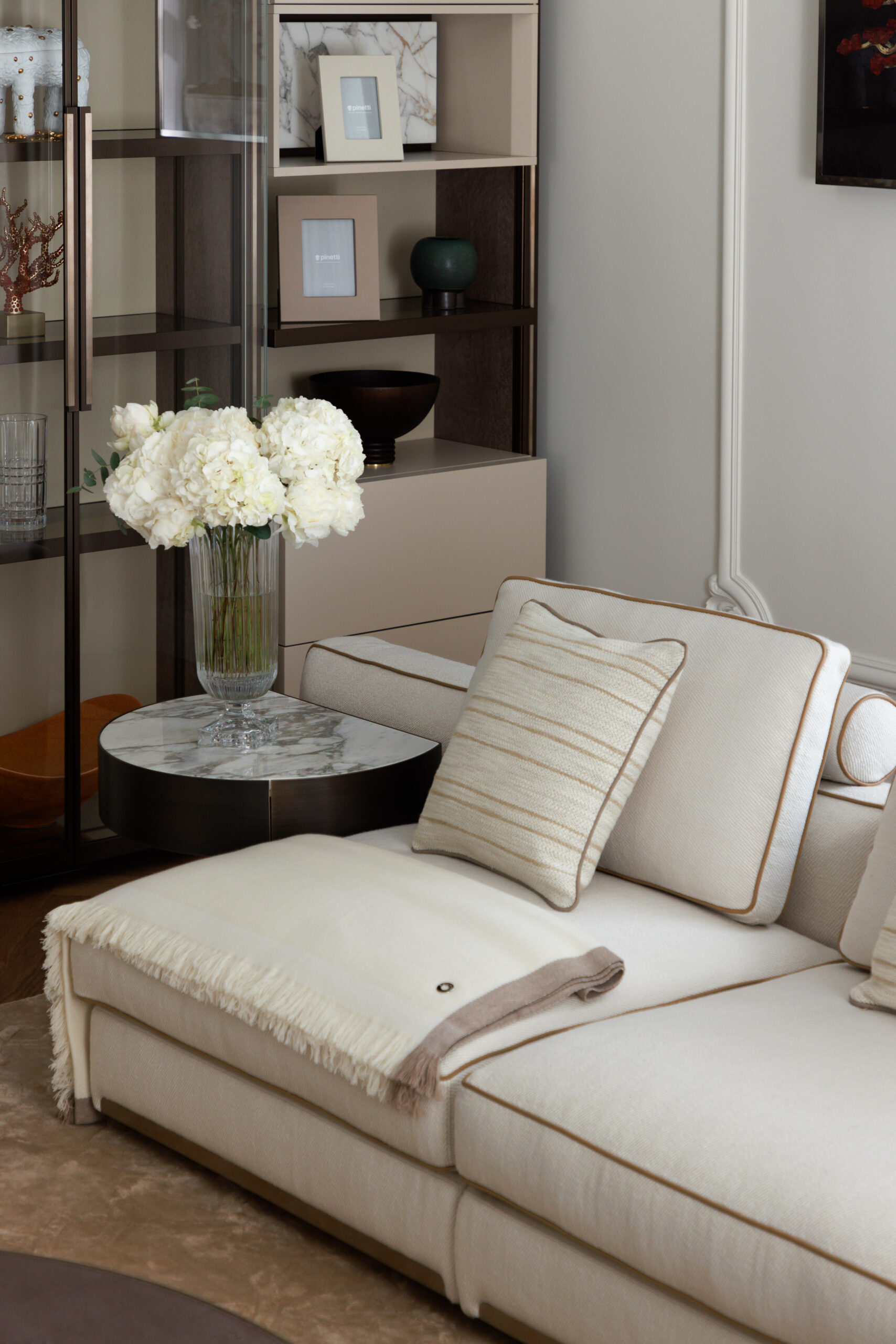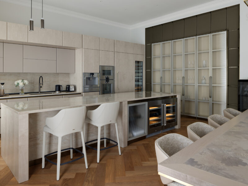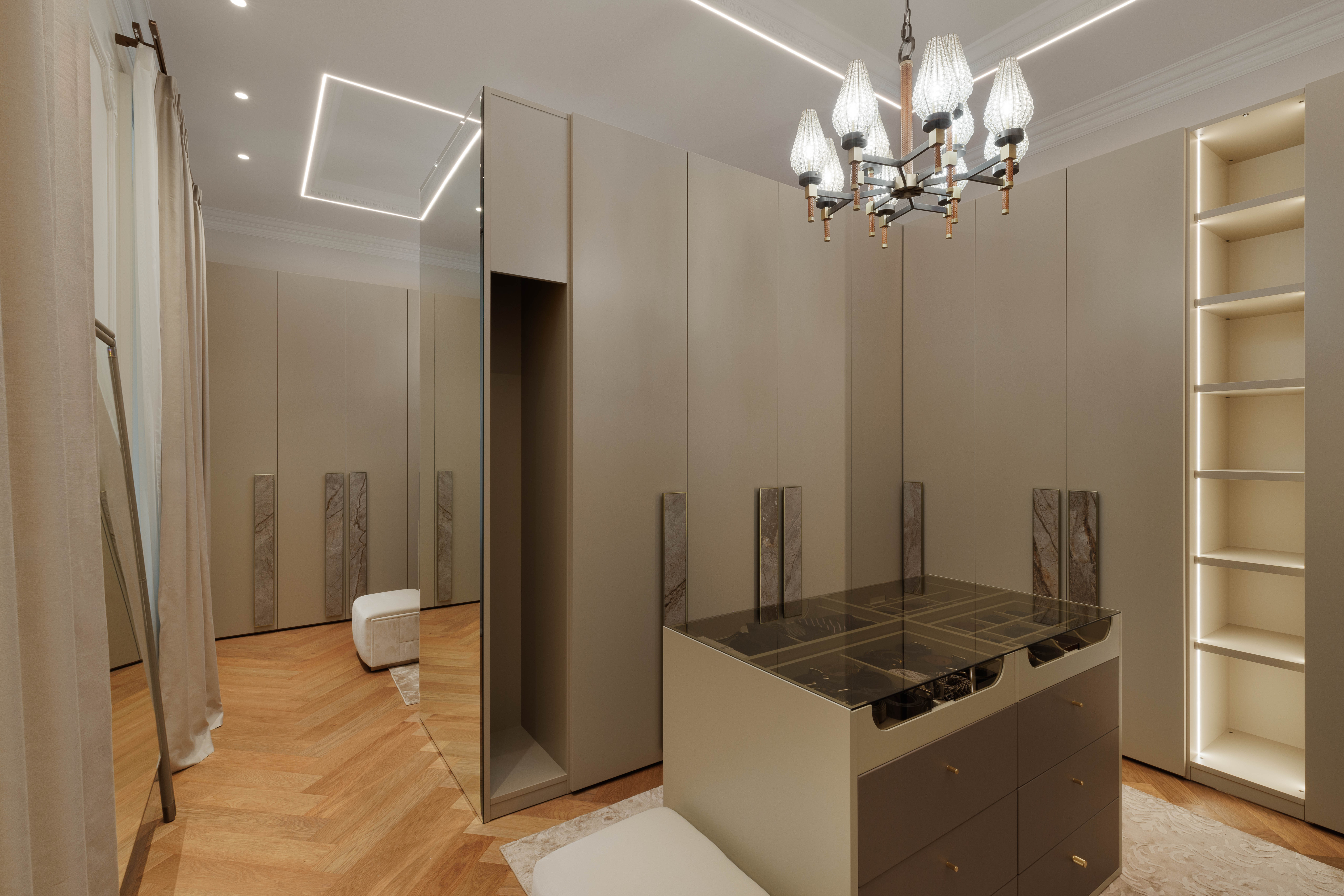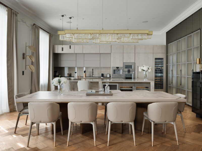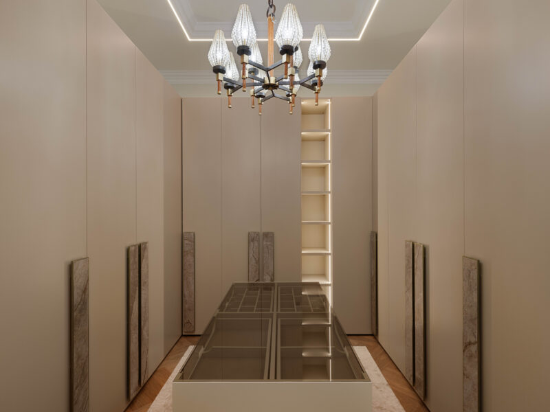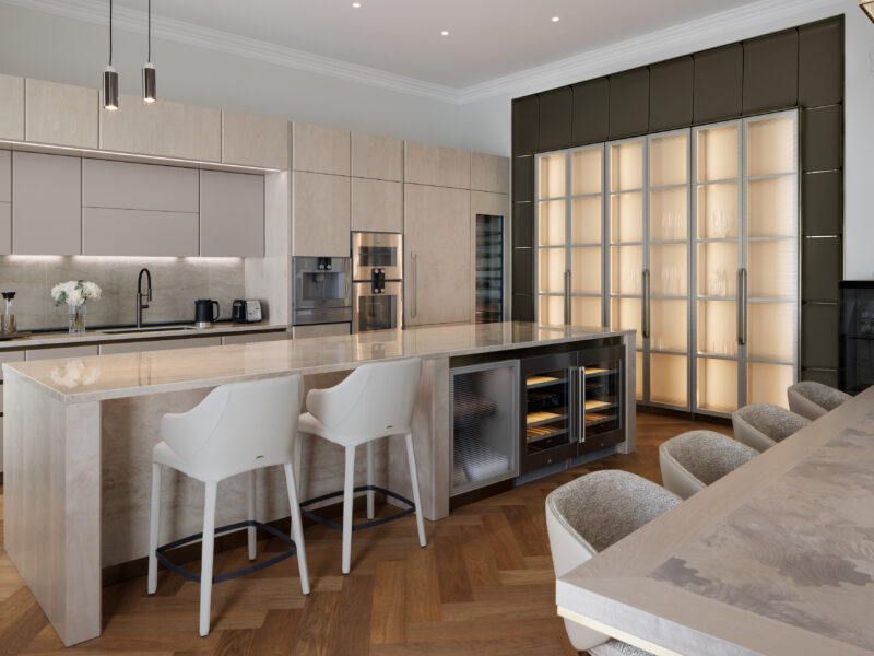 Für dieses Projekt wurden Möbel von Visionnaire sorgfältig ausgewählt und durch eine Reihe von speziell für diesen Raum angefertigten Elementen ergänzt. Zu den wichtigsten Sonderanfertigungen zählen die integrierten Küchenschränke und ein maßgeschneiderter Regalschrank für das Homeoffice, die beide Funktionalität mit architektonischer Raffinesse verbinden.