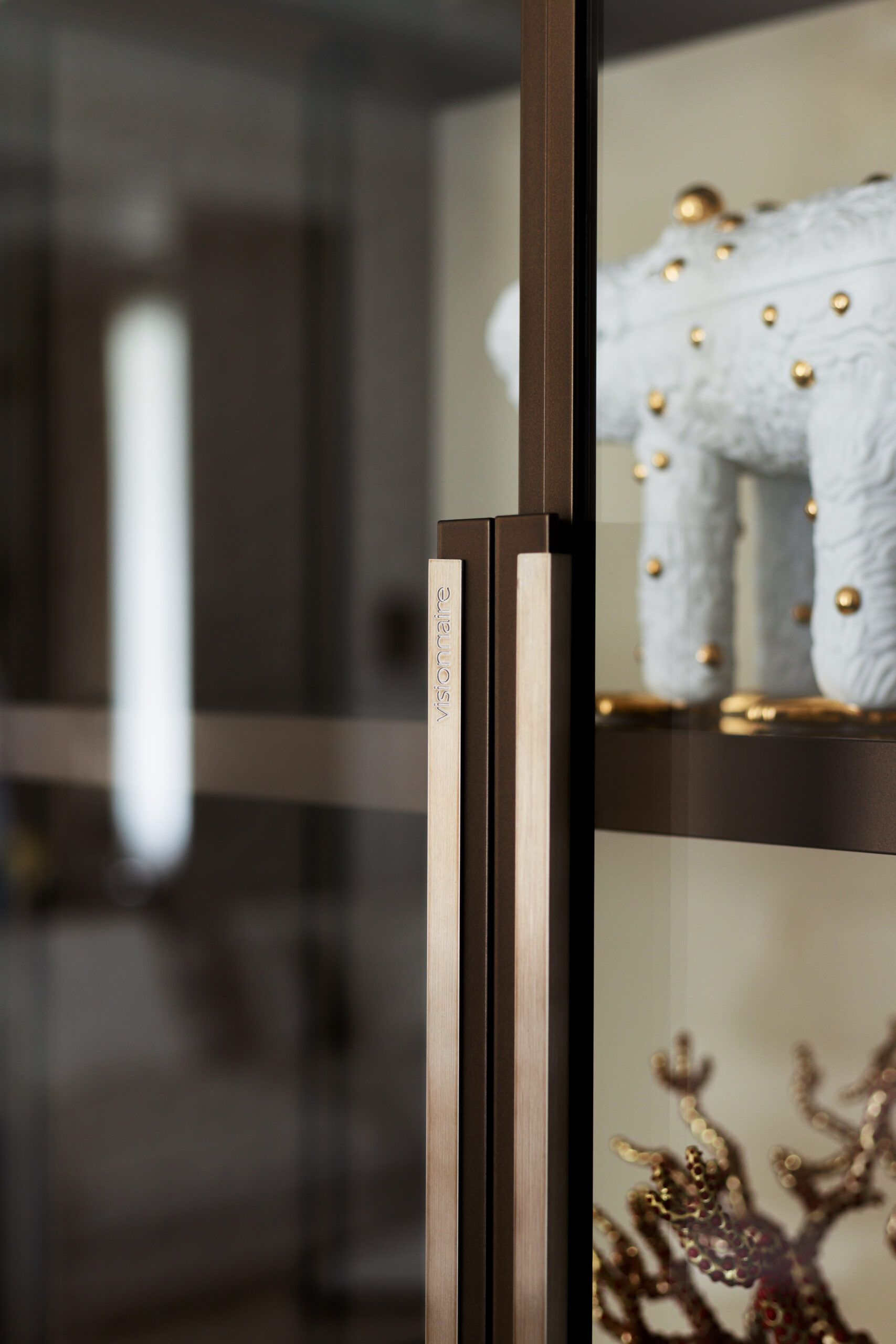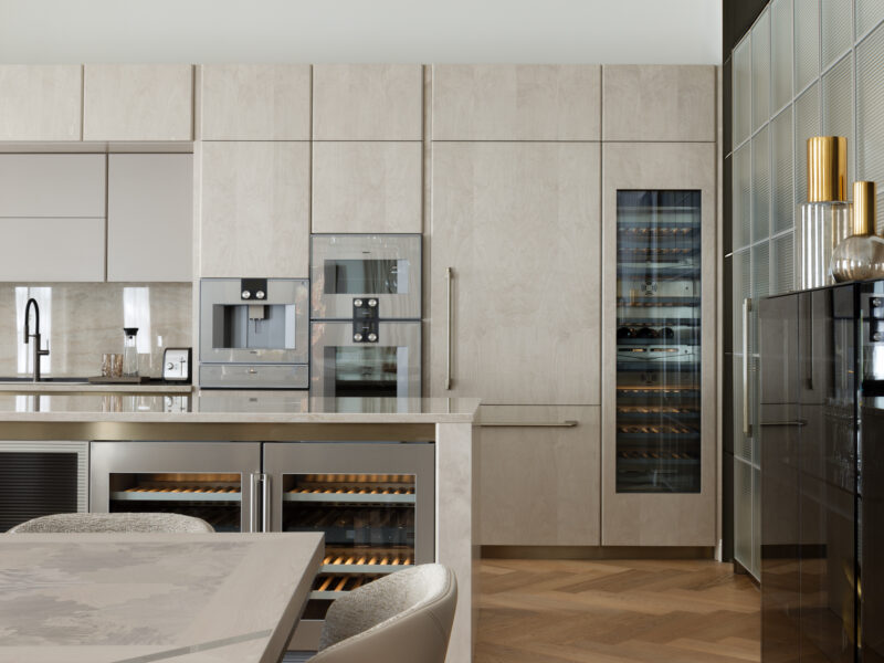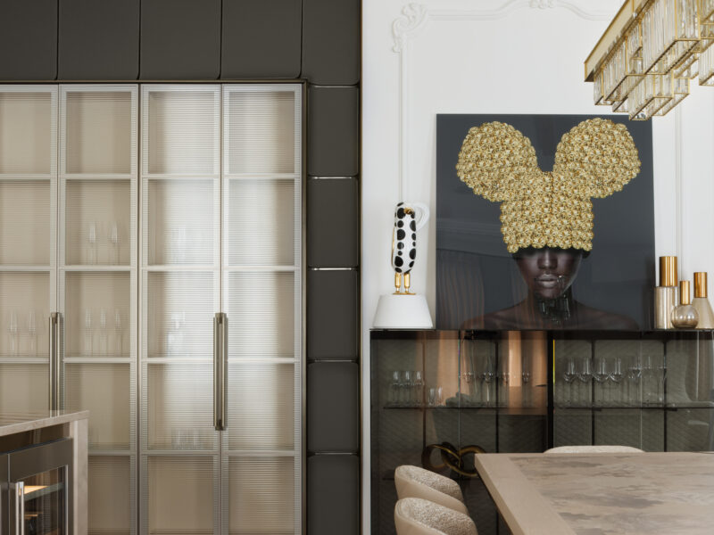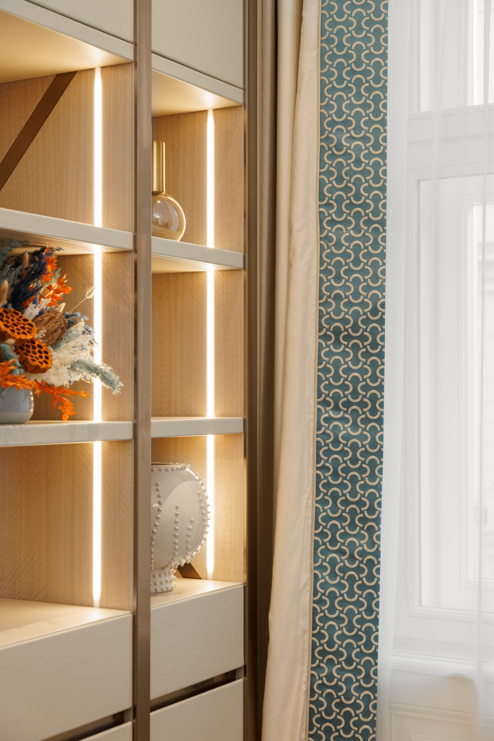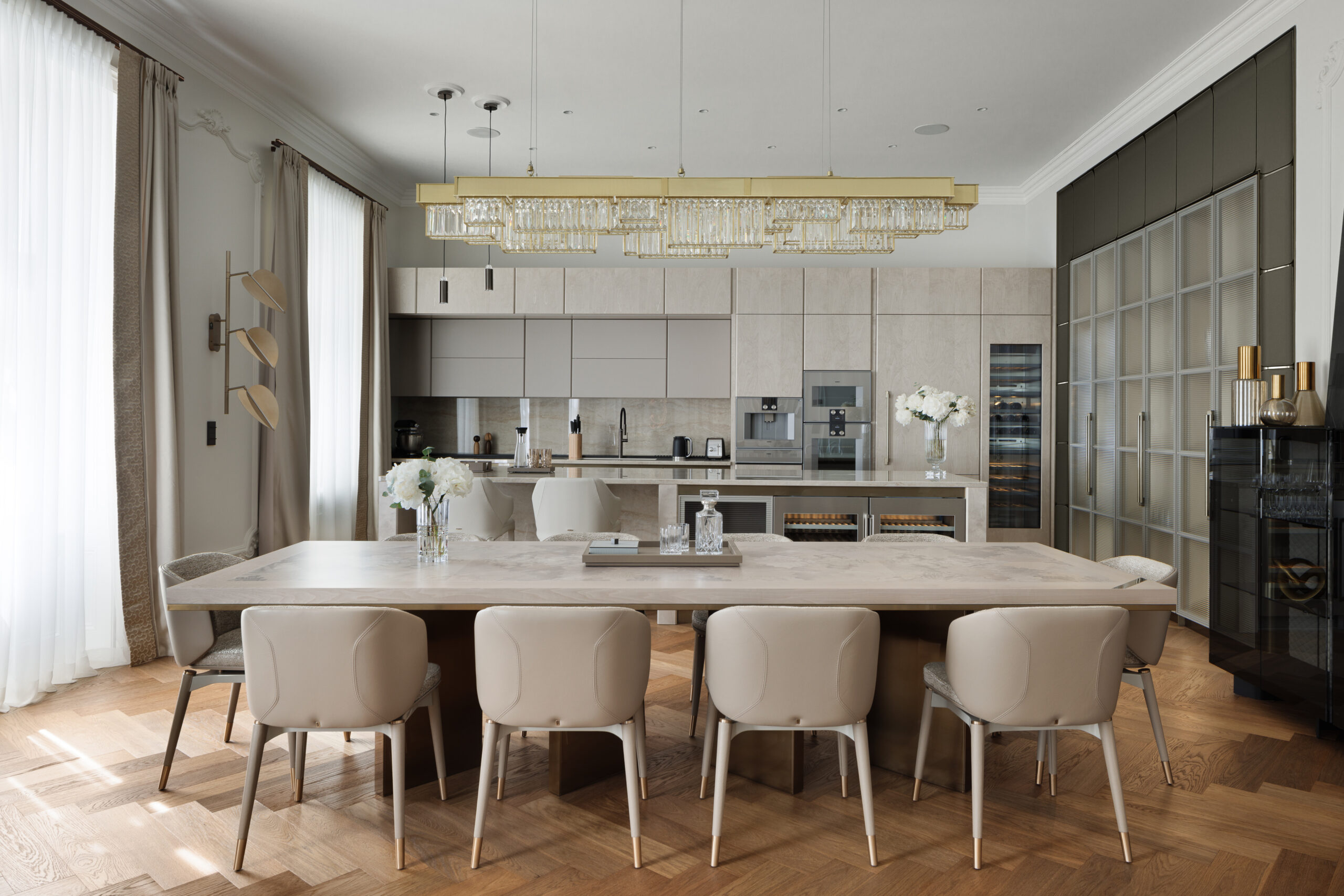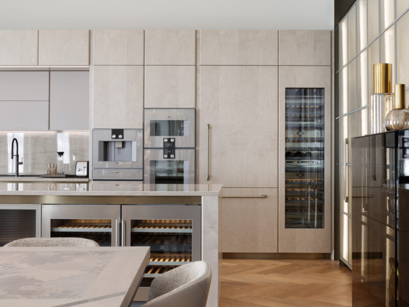 Für dieses Projekt wurden Möbel von Visionnaire sorgfältig ausgewählt und durch eine Reihe von speziell für diesen Raum angefertigten Elementen ergänzt. Zu den wichtigsten Sonderanfertigungen zählen die integrierten Küchenschränke und ein maßgeschneiderter Regalschrank für das Homeoffice, die beide Funktionalität mit architektonischer Raffinesse verbinden.