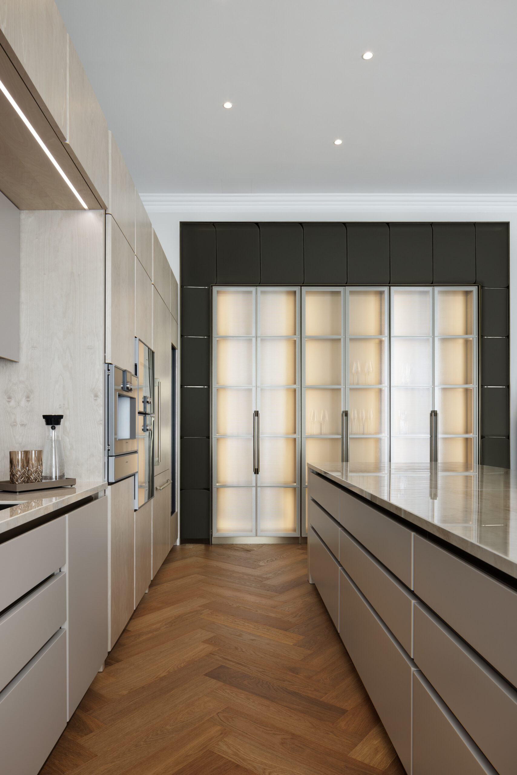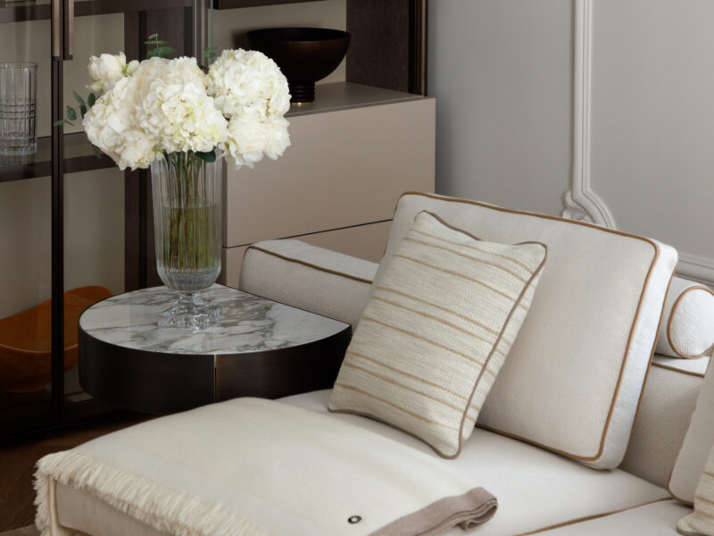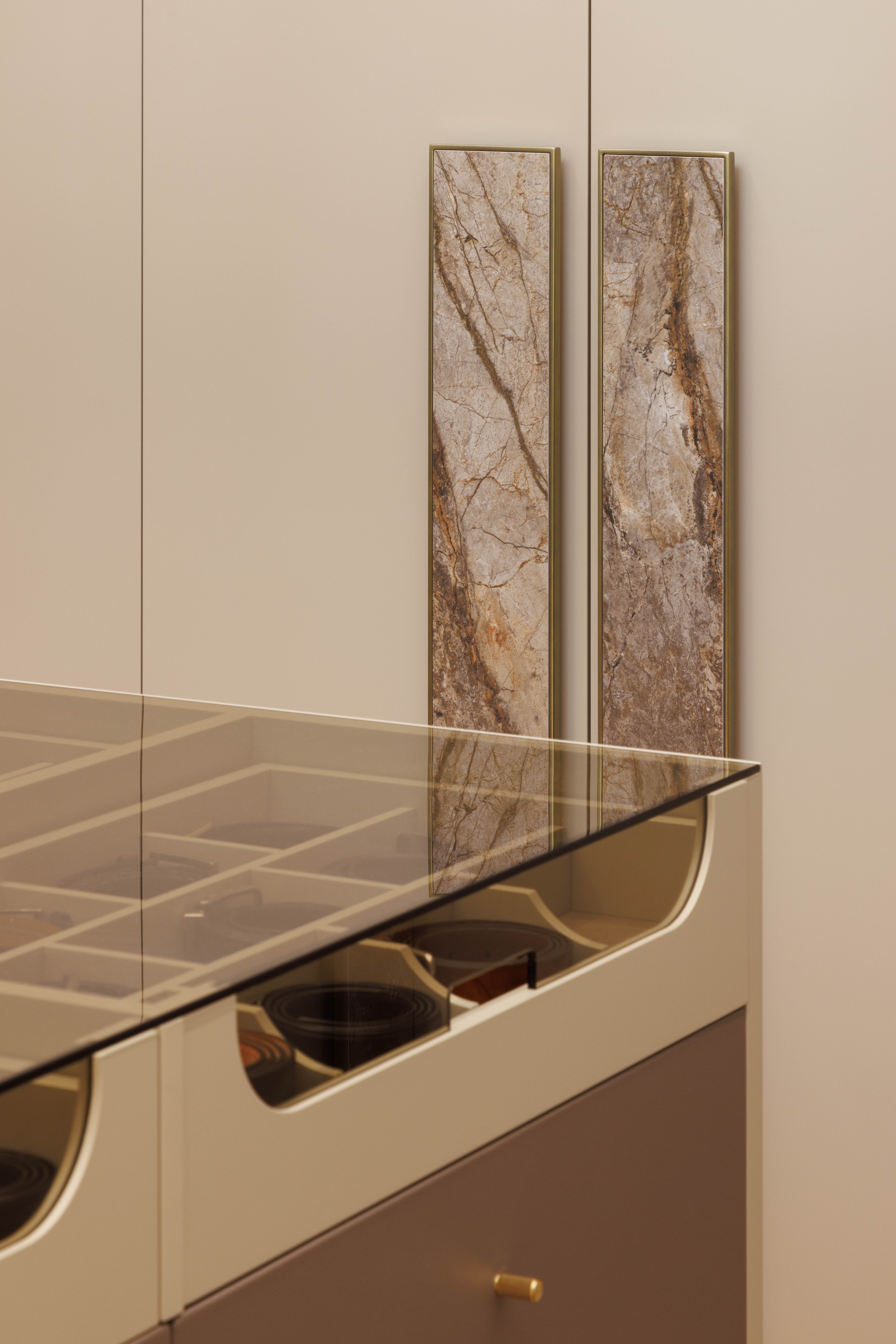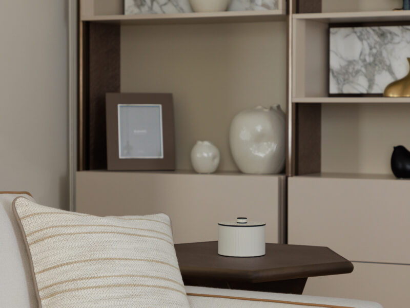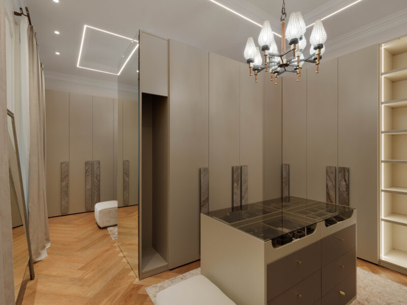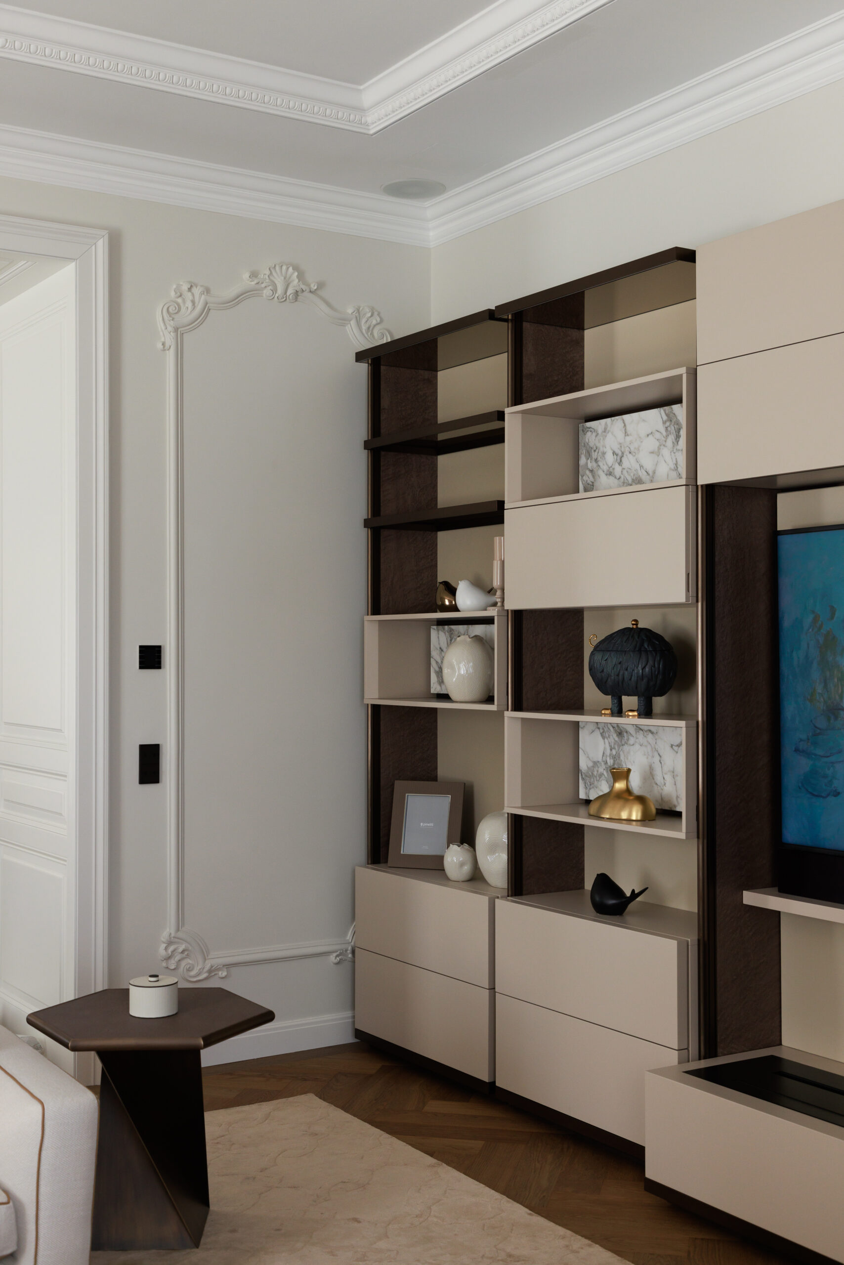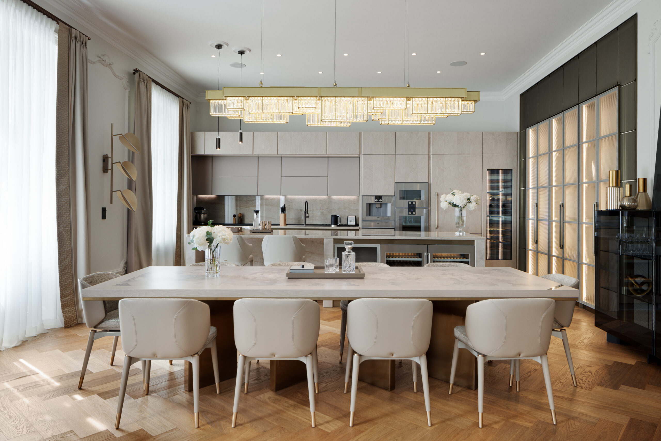Für dieses Projekt wurden Möbel von Visionnaire sorgfältig ausgewählt und durch eine Reihe von speziell für diesen Raum angefertigten Elementen ergänzt. Zu den wichtigsten Sonderanfertigungen zählen die integrierten Küchenschränke und ein maßgeschneiderter Regalschrank für das Homeoffice, die beide Funktionalität mit architektonischer Raffinesse verbinden.