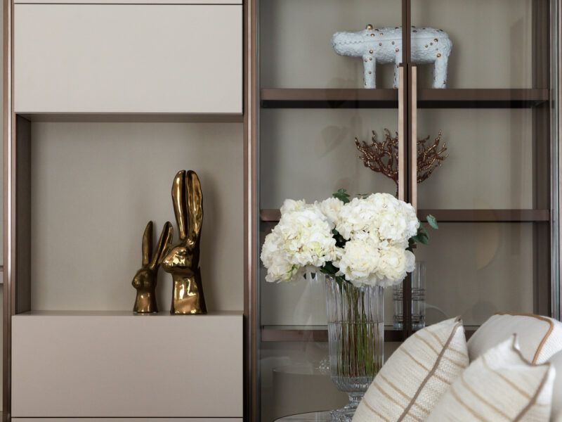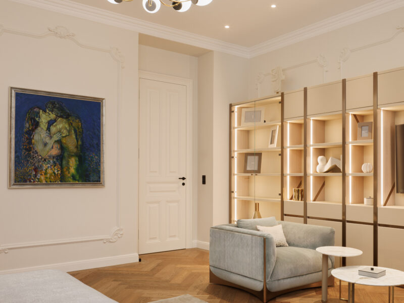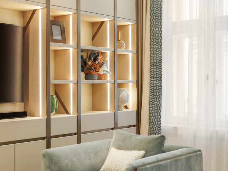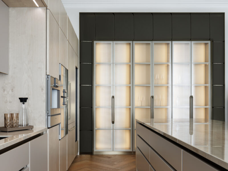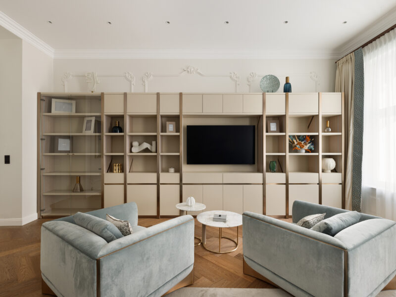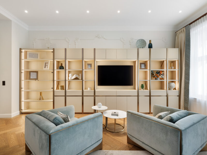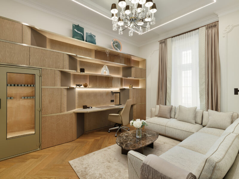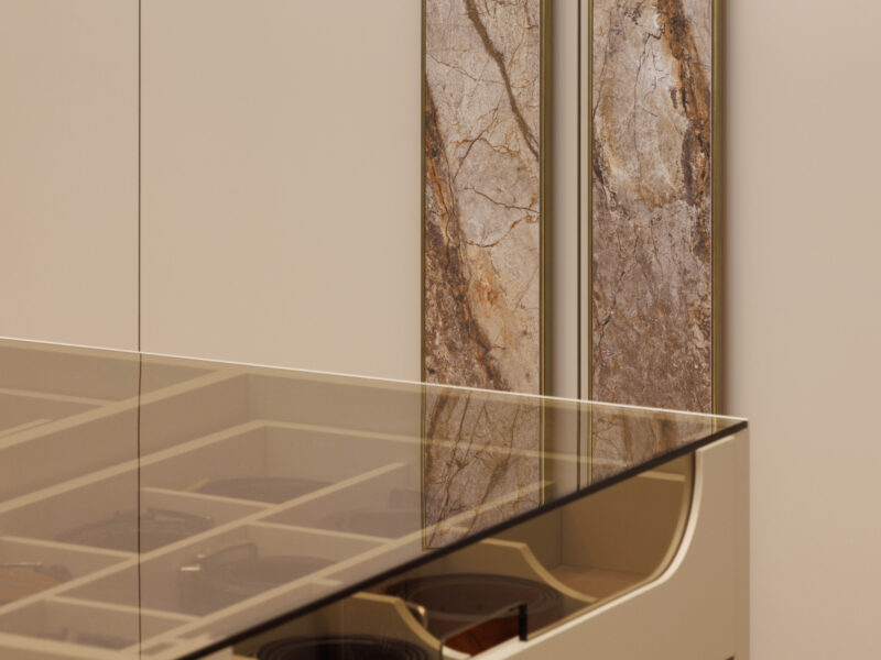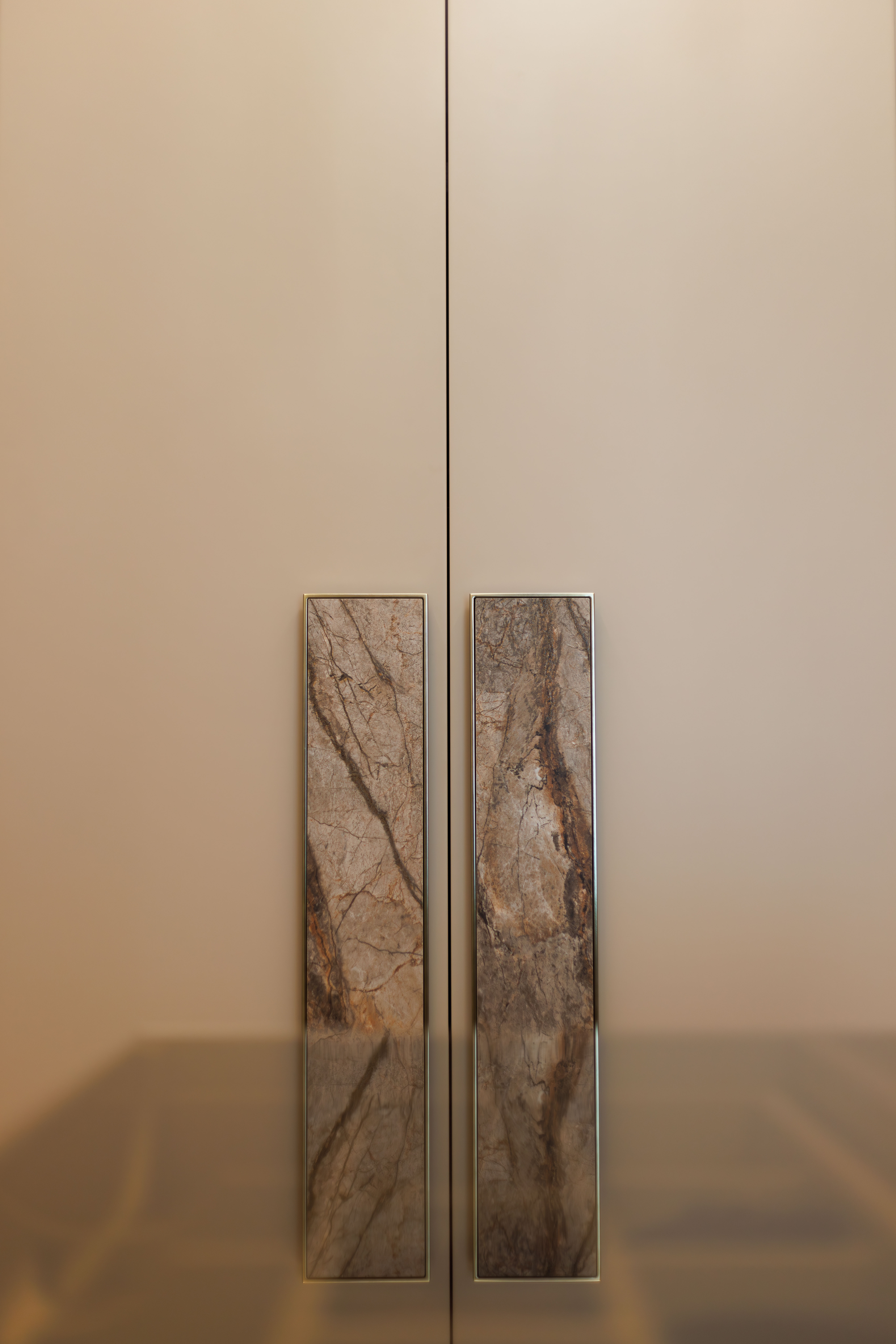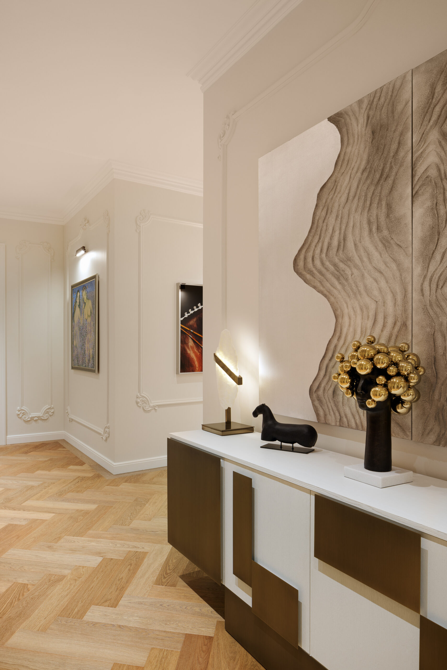 Für dieses Projekt wurden Möbel von Visionnaire sorgfältig ausgewählt und durch eine Reihe von speziell für diesen Raum angefertigten Elementen ergänzt. Zu den wichtigsten Sonderanfertigungen zählen die integrierten Küchenschränke und ein maßgeschneiderter Regalschrank für das Homeoffice, die beide Funktionalität mit architektonischer Raffinesse verbinden.