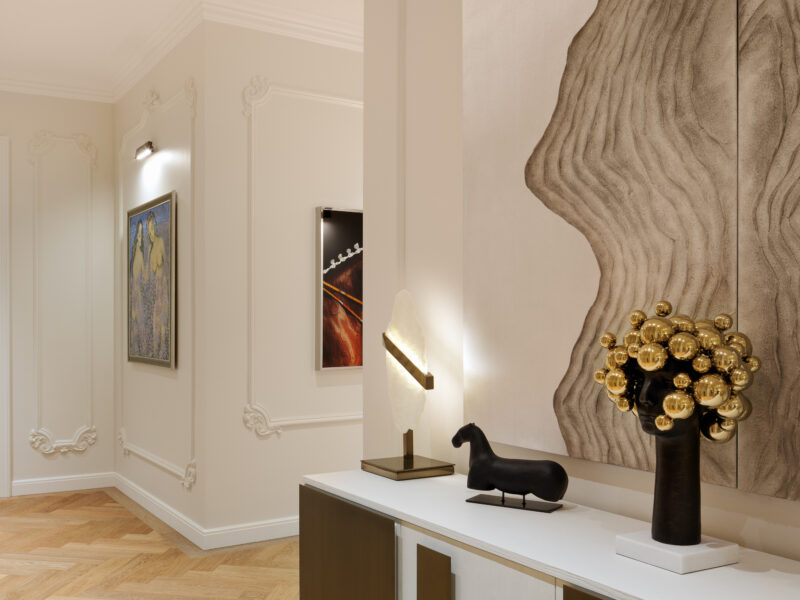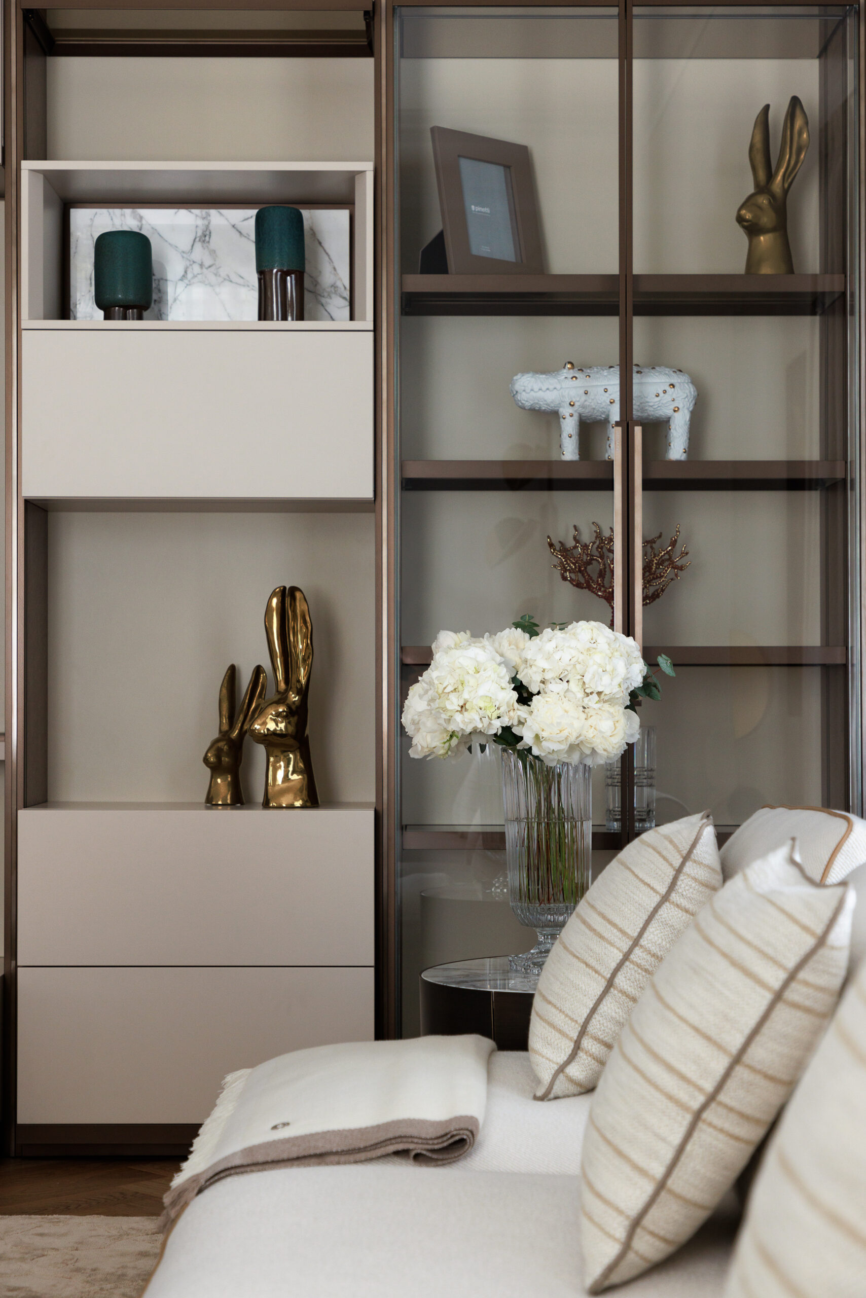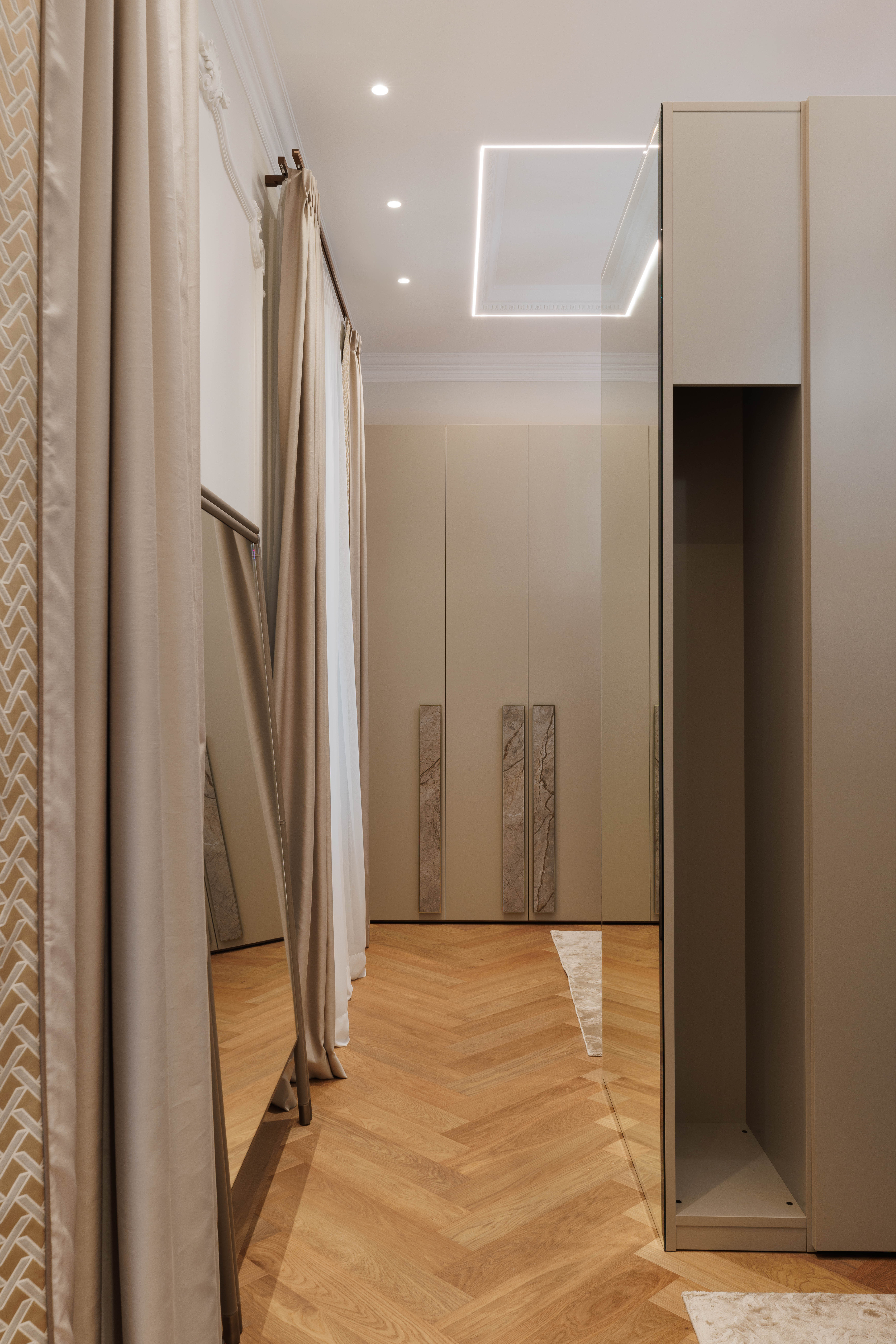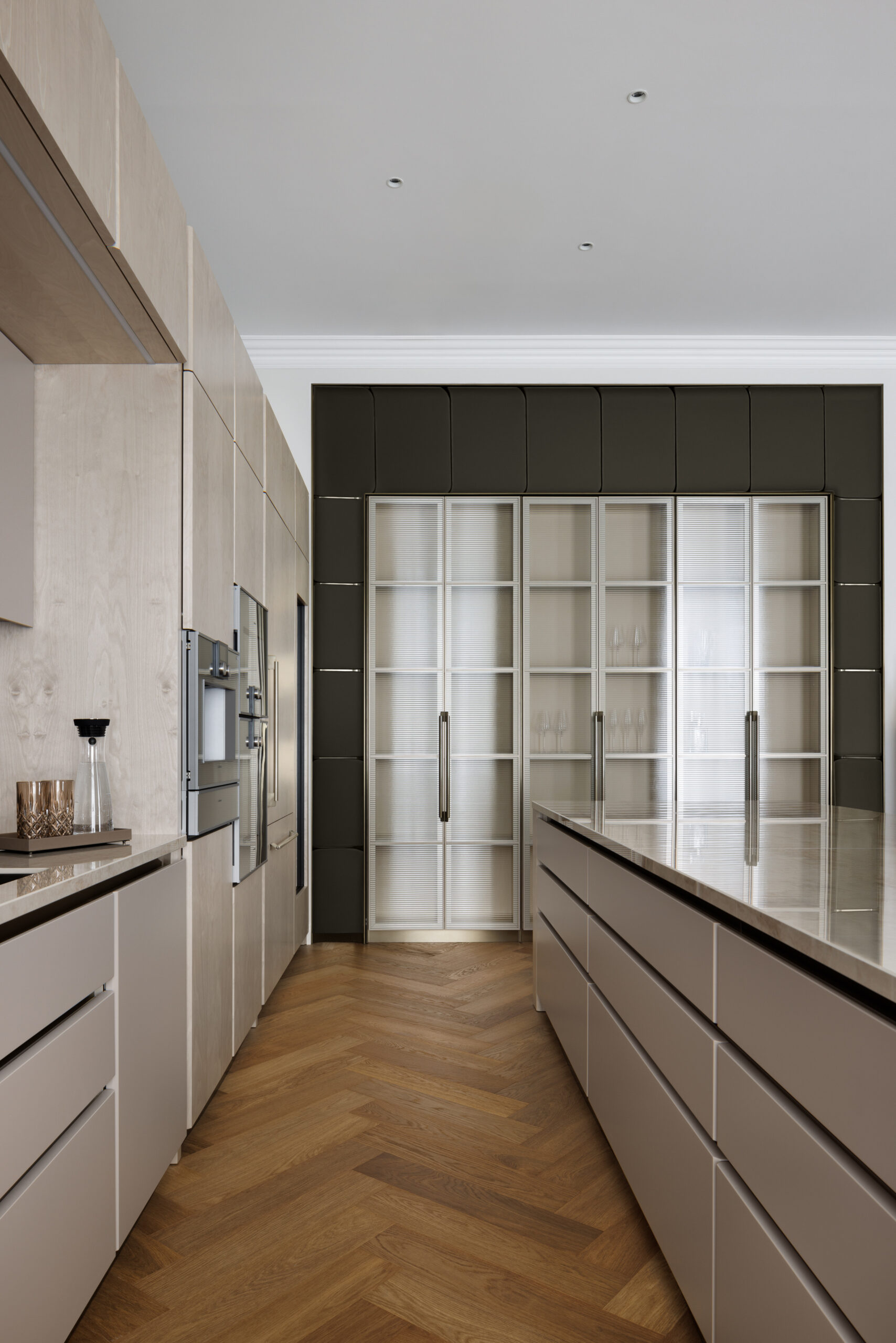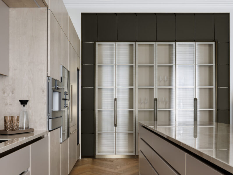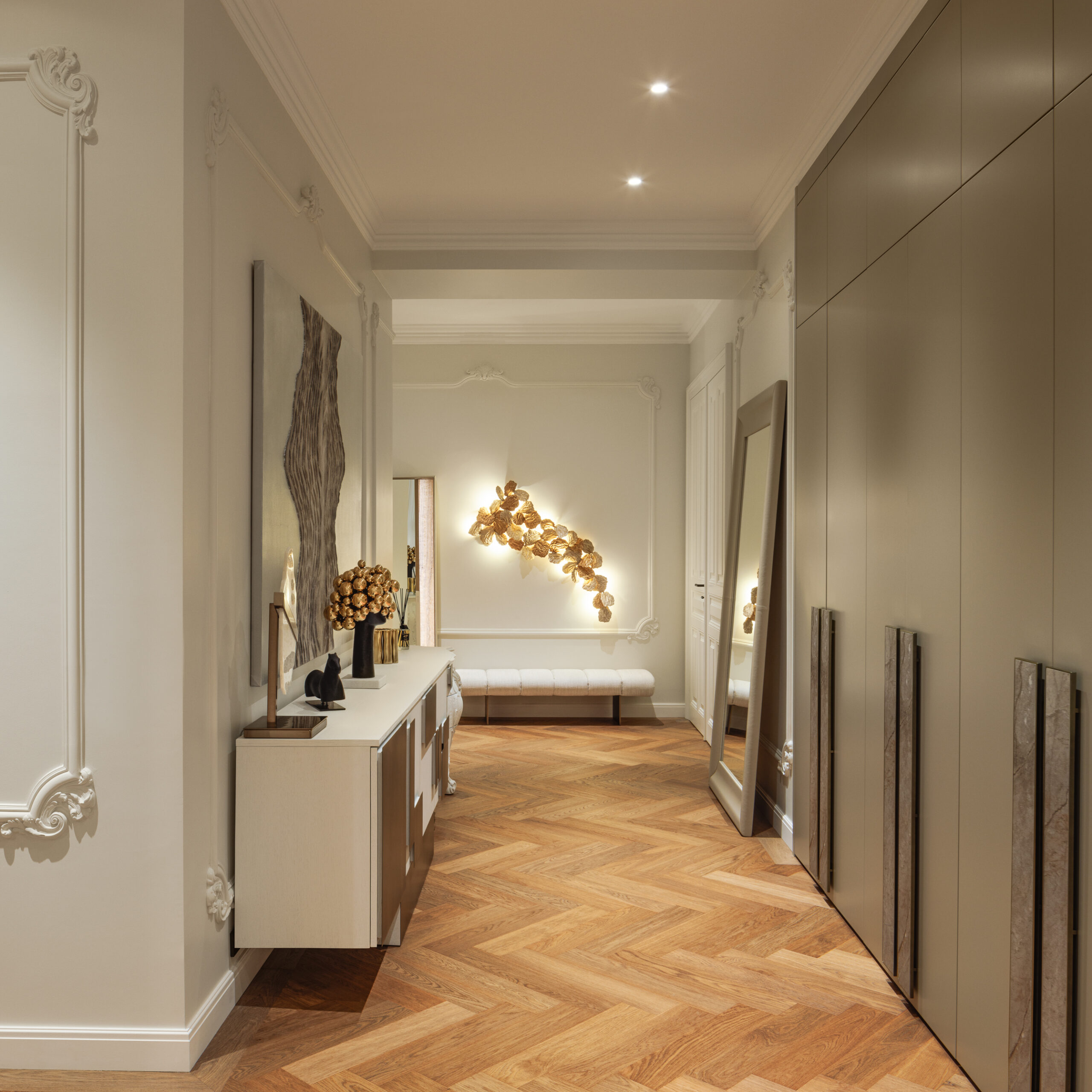 Für dieses Projekt wurden Möbel von Visionnaire sorgfältig ausgewählt und durch eine Reihe von speziell für diesen Raum angefertigten Elementen ergänzt. Zu den wichtigsten Sonderanfertigungen zählen die integrierten Küchenschränke und ein maßgeschneiderter Regalschrank für das Homeoffice, die beide Funktionalität mit architektonischer Raffinesse verbinden.