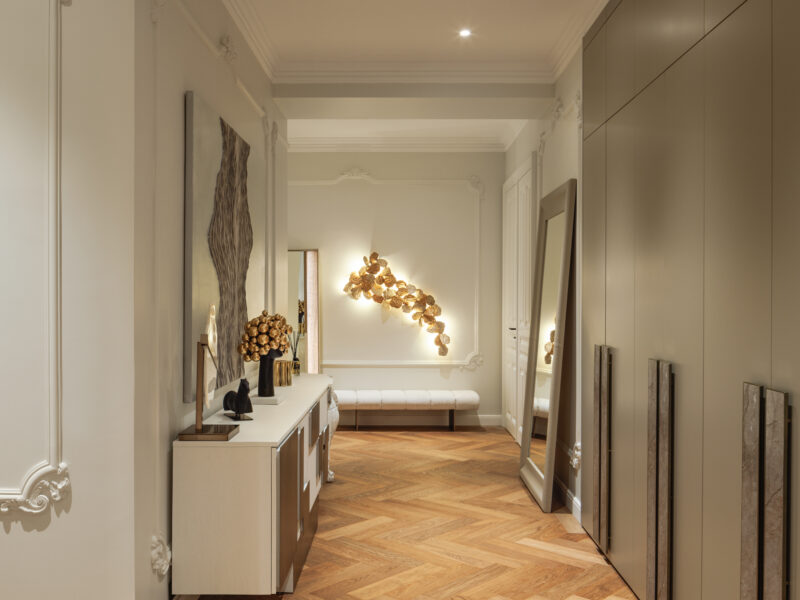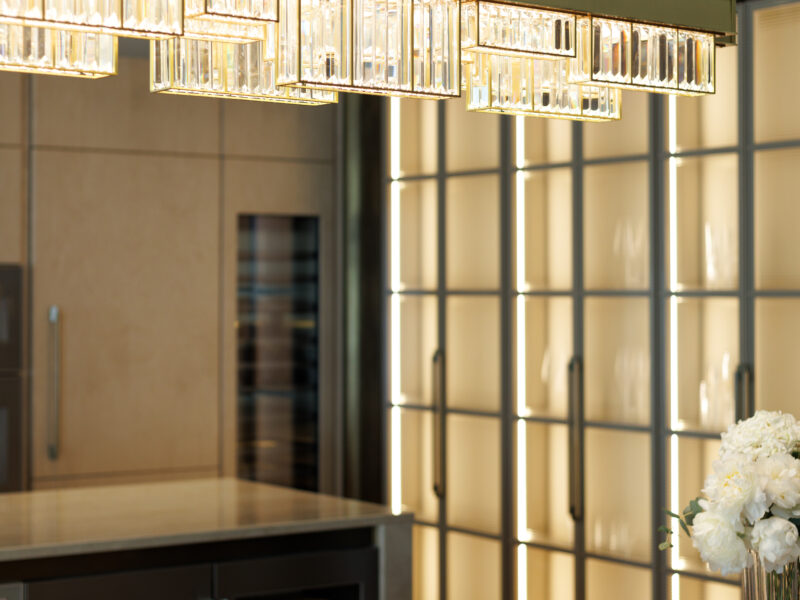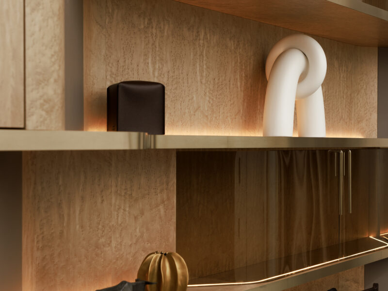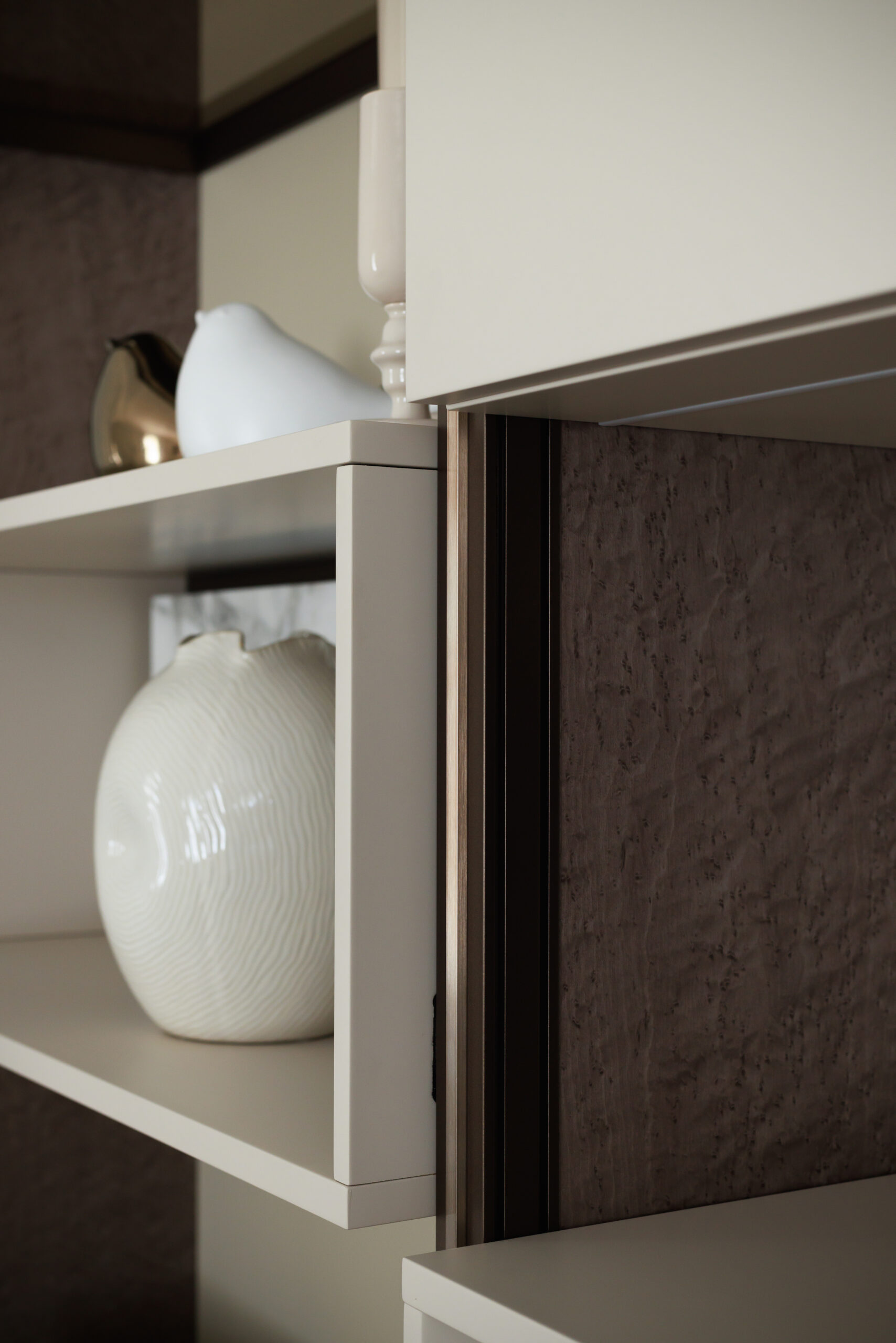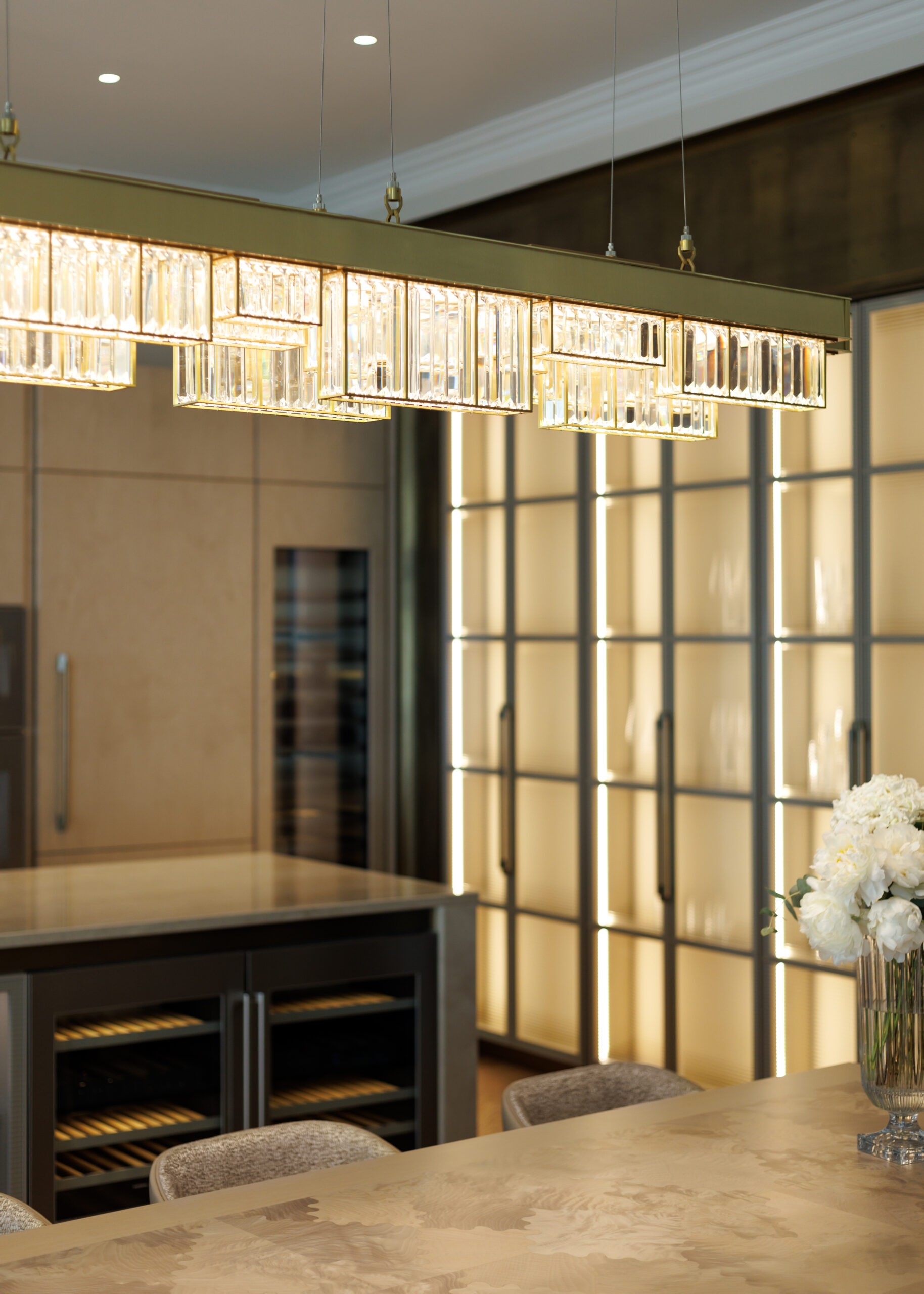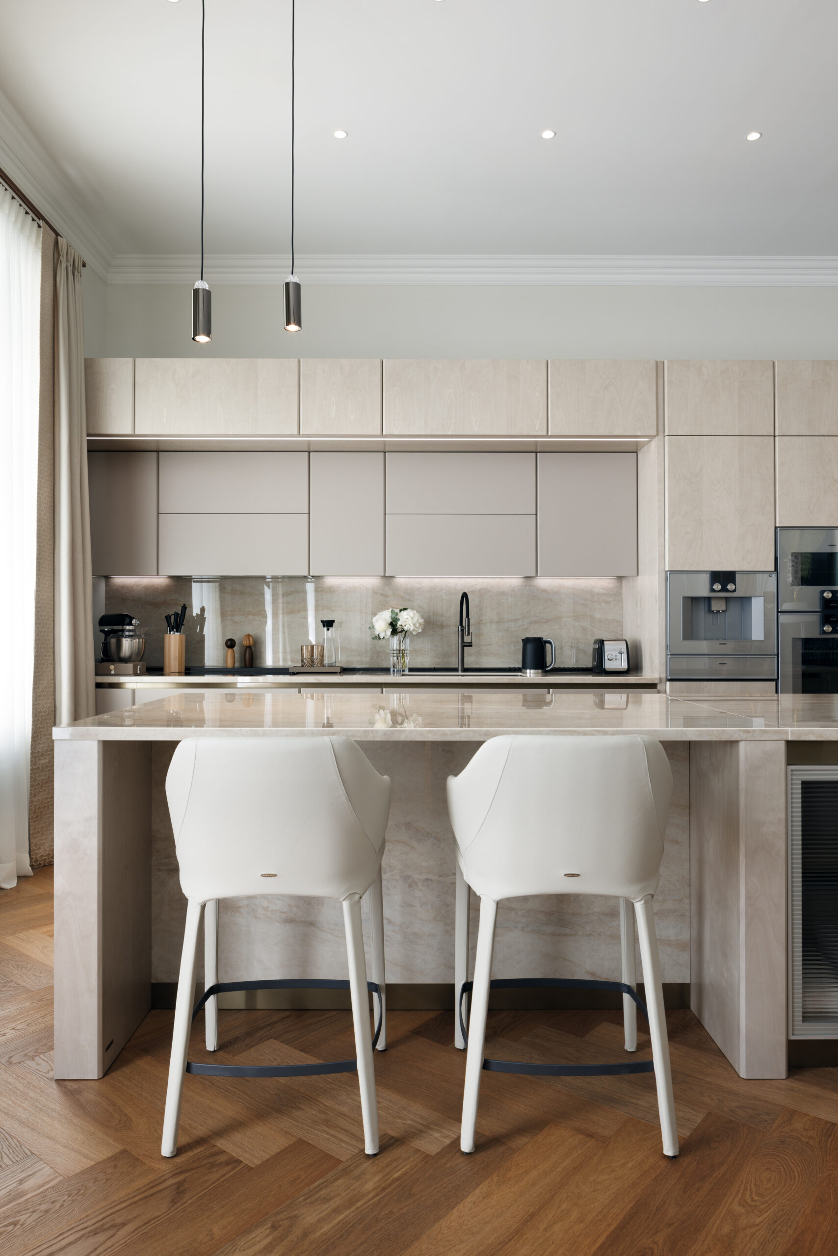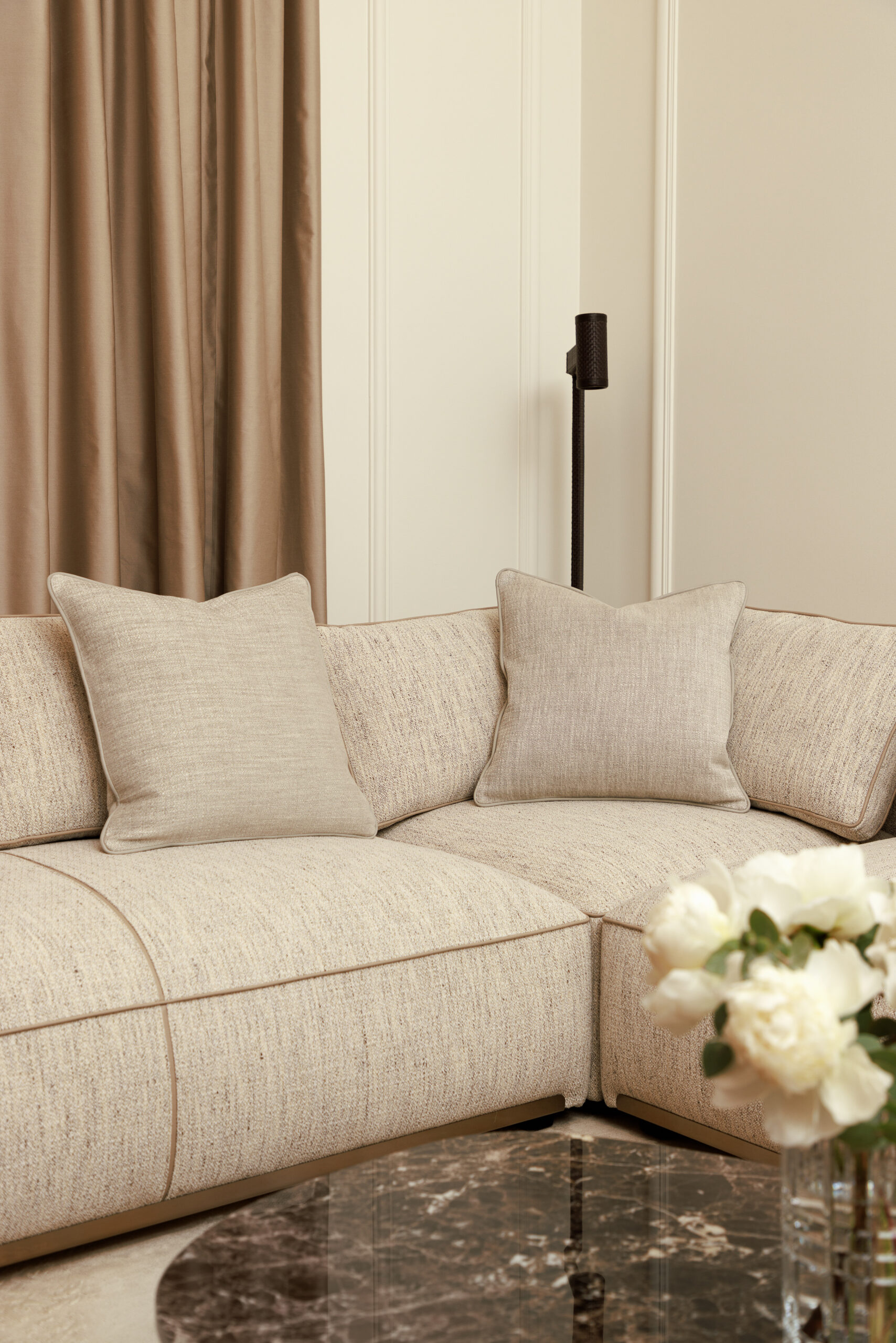 Für dieses Projekt wurden Möbel von Visionnaire sorgfältig ausgewählt und durch eine Reihe von speziell für diesen Raum angefertigten Elementen ergänzt. Zu den wichtigsten Sonderanfertigungen zählen die integrierten Küchenschränke und ein maßgeschneiderter Regalschrank für das Homeoffice, die beide Funktionalität mit architektonischer Raffinesse verbinden.