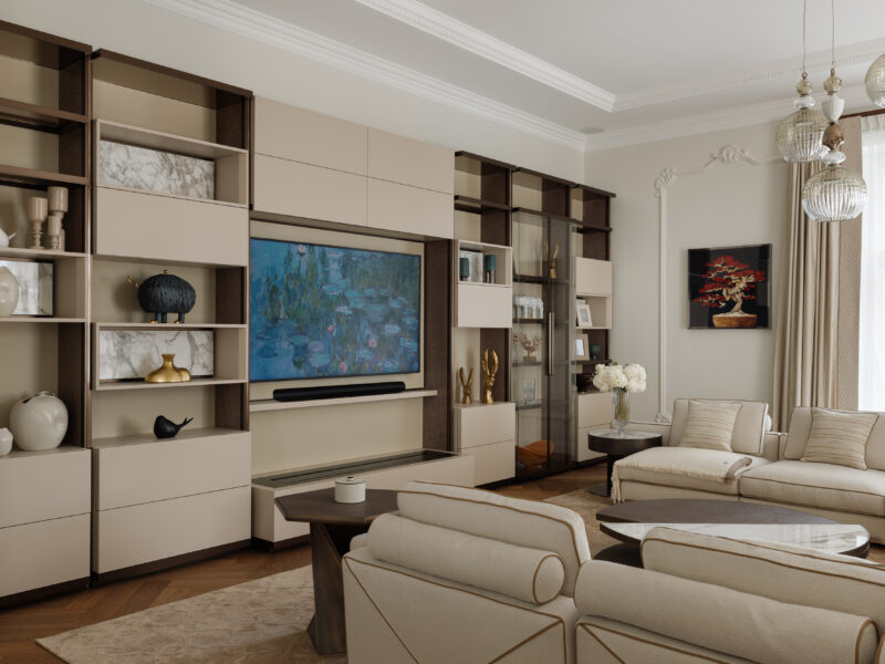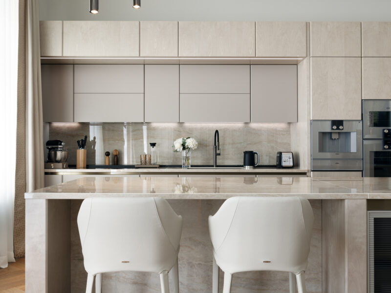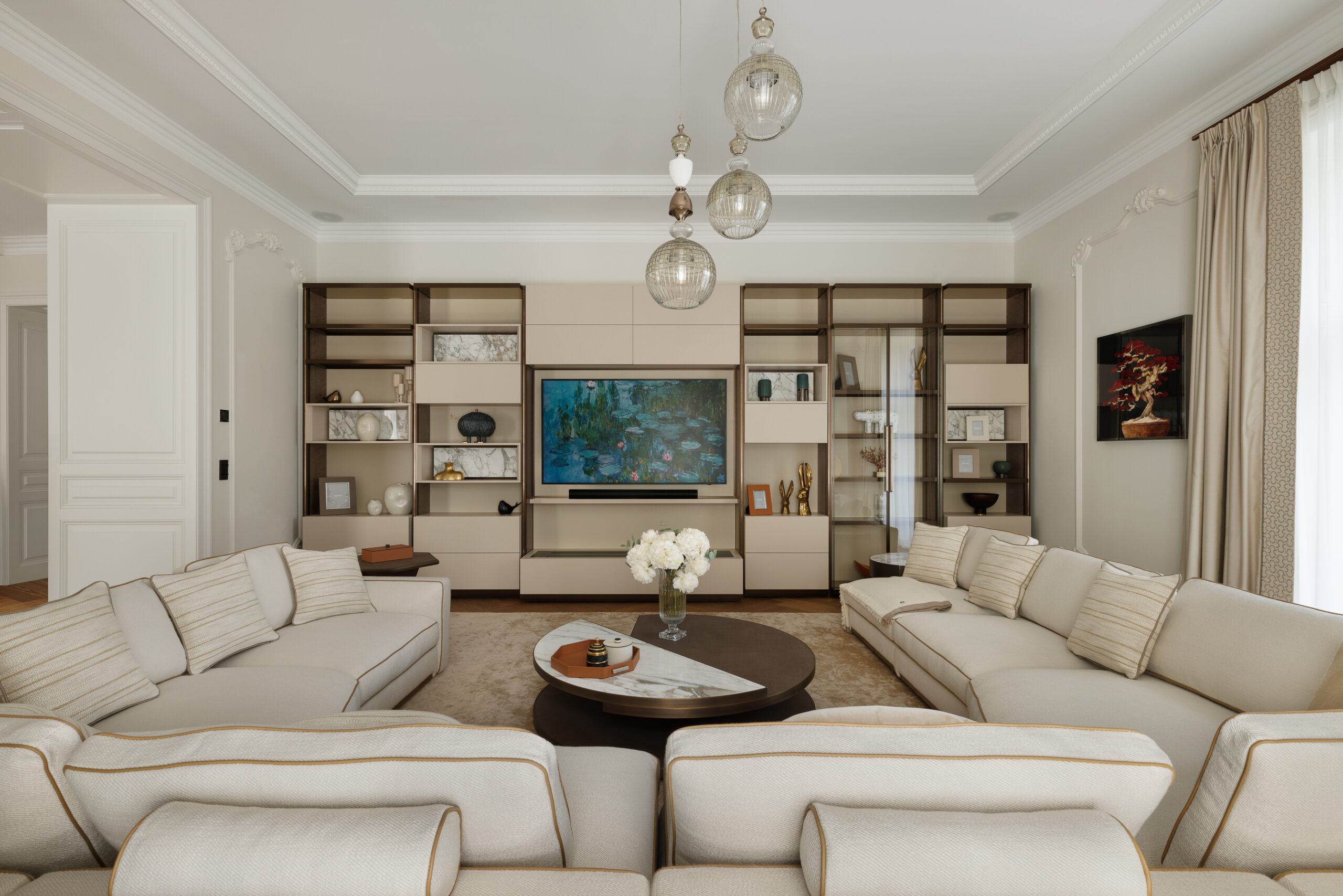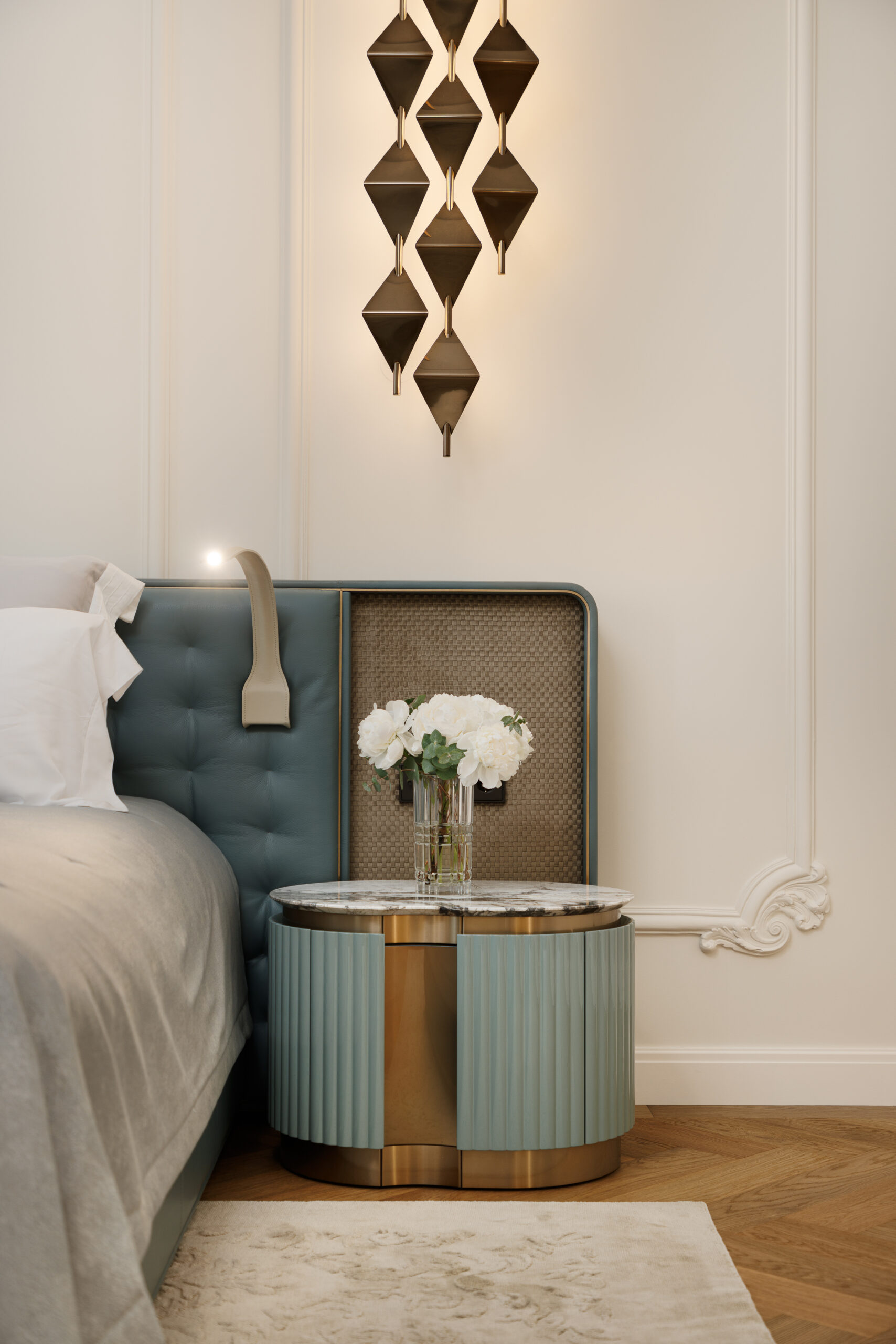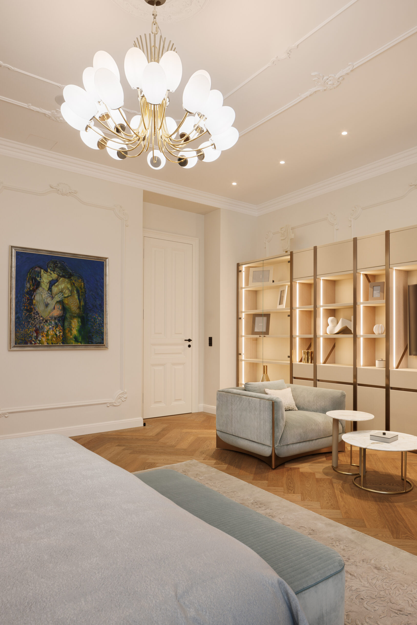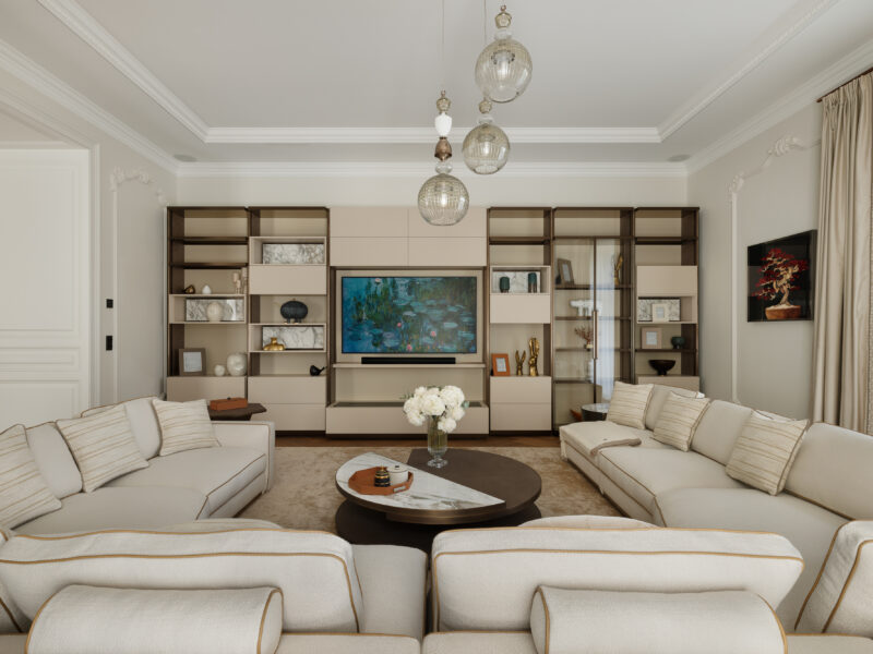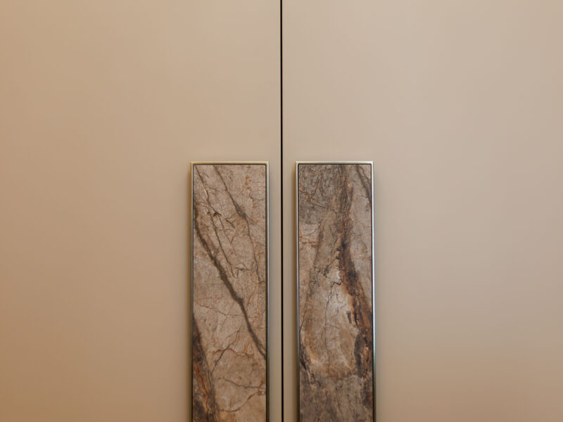 Für dieses Projekt wurden Möbel von Visionnaire sorgfältig ausgewählt und durch eine Reihe von speziell für diesen Raum angefertigten Elementen ergänzt. Zu den wichtigsten Sonderanfertigungen zählen die integrierten Küchenschränke und ein maßgeschneiderter Regalschrank für das Homeoffice, die beide Funktionalität mit architektonischer Raffinesse verbinden.