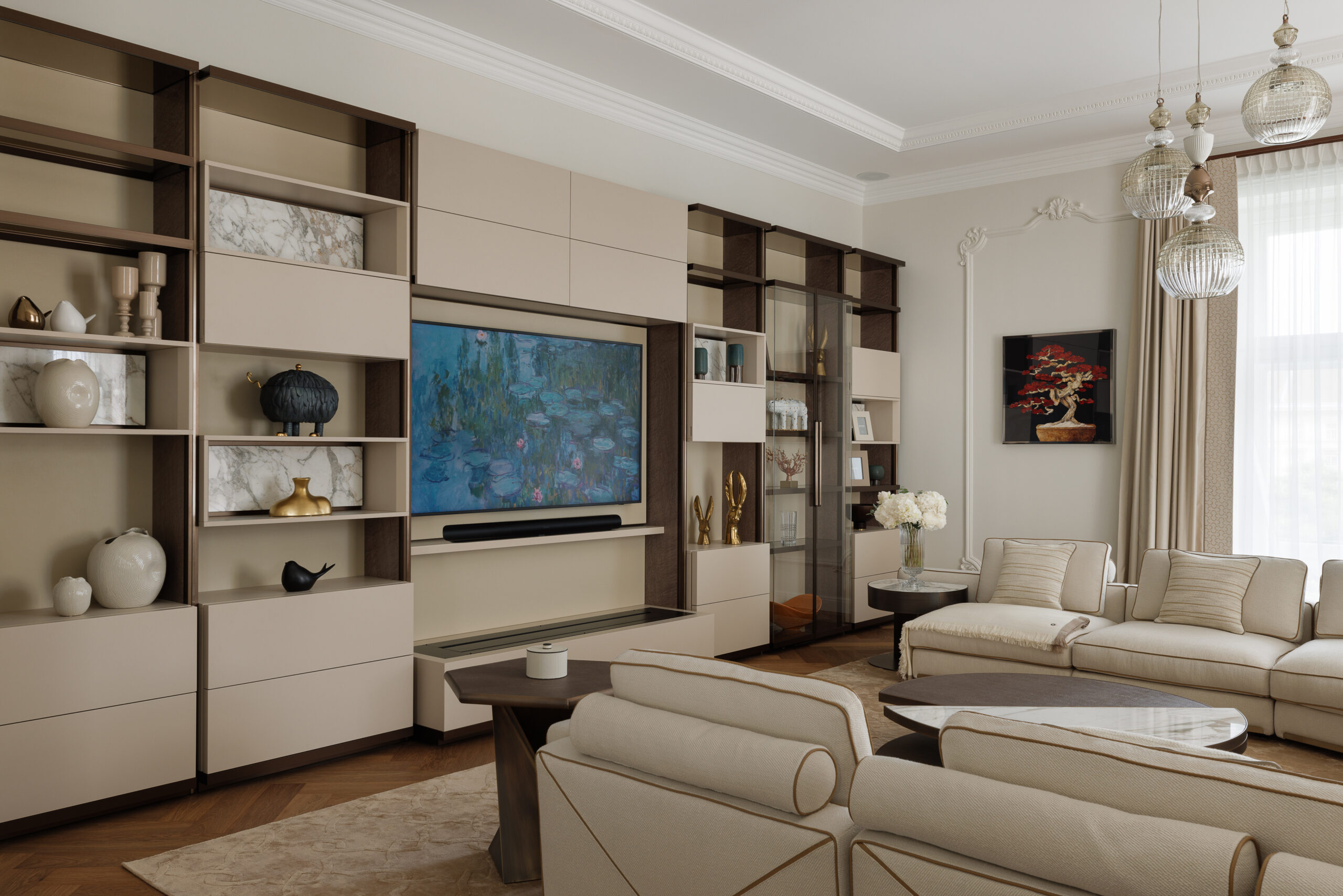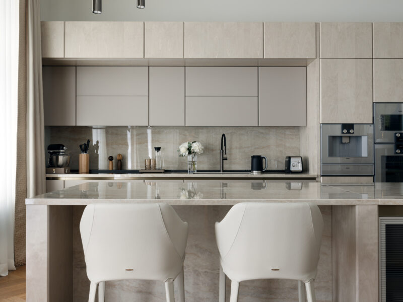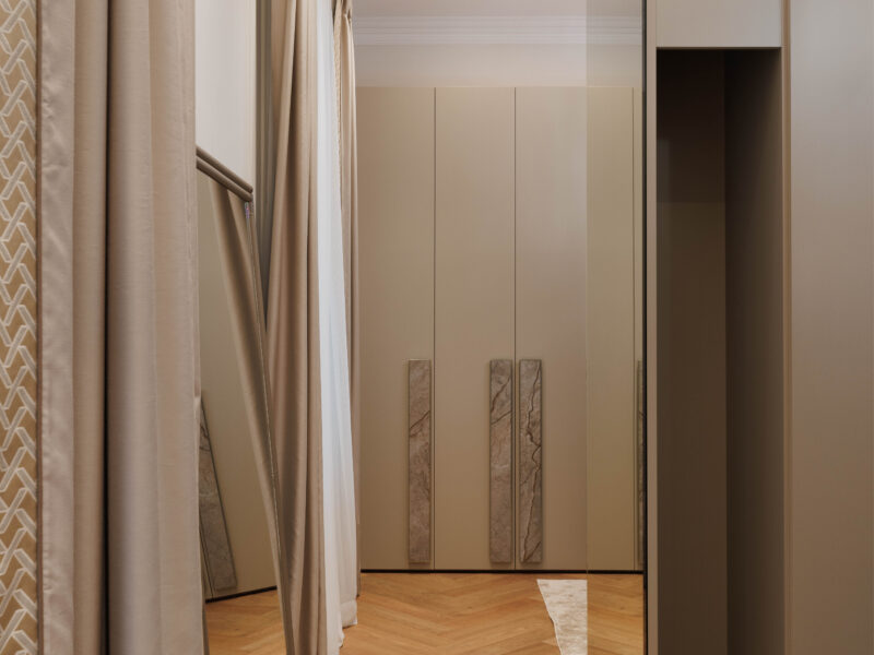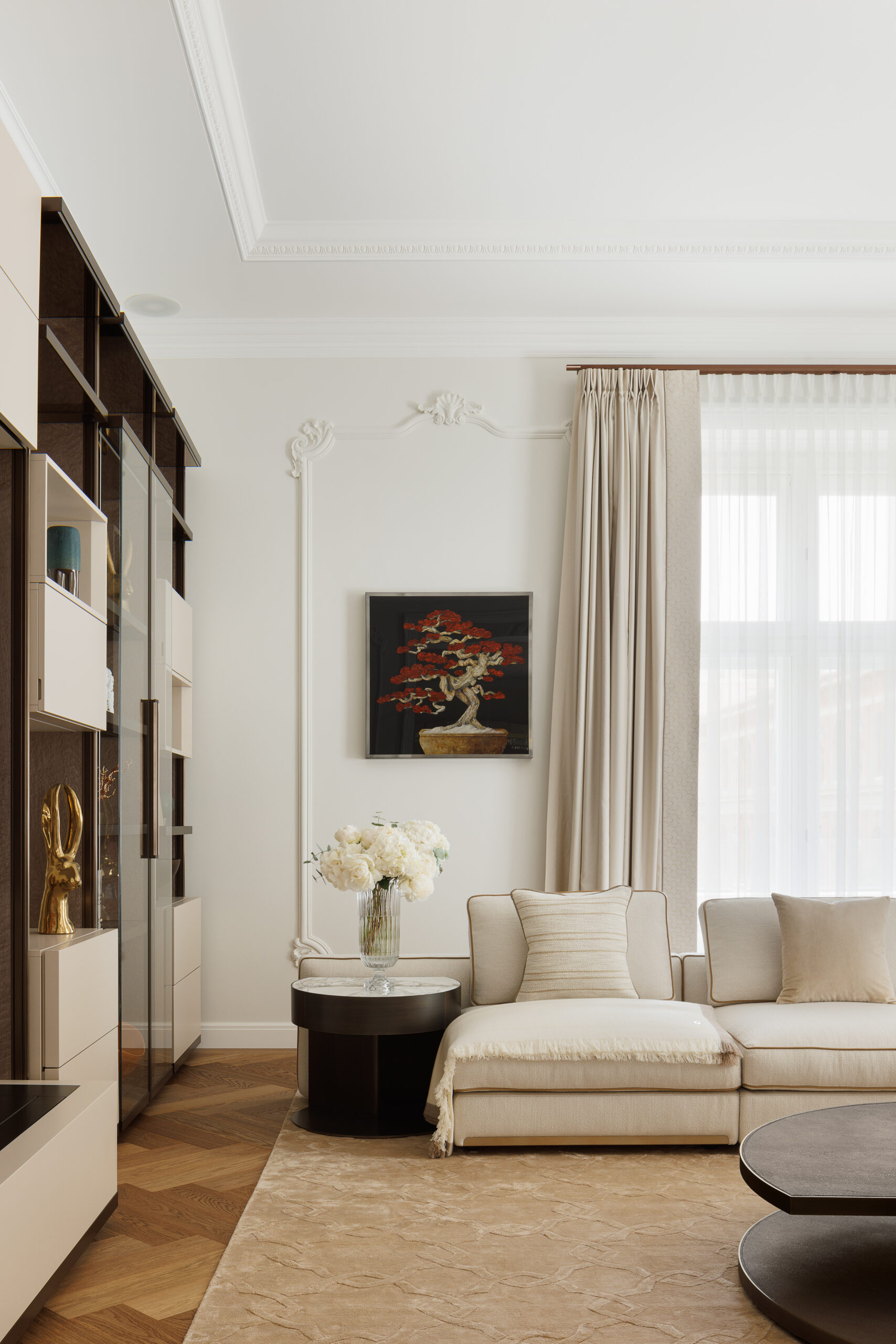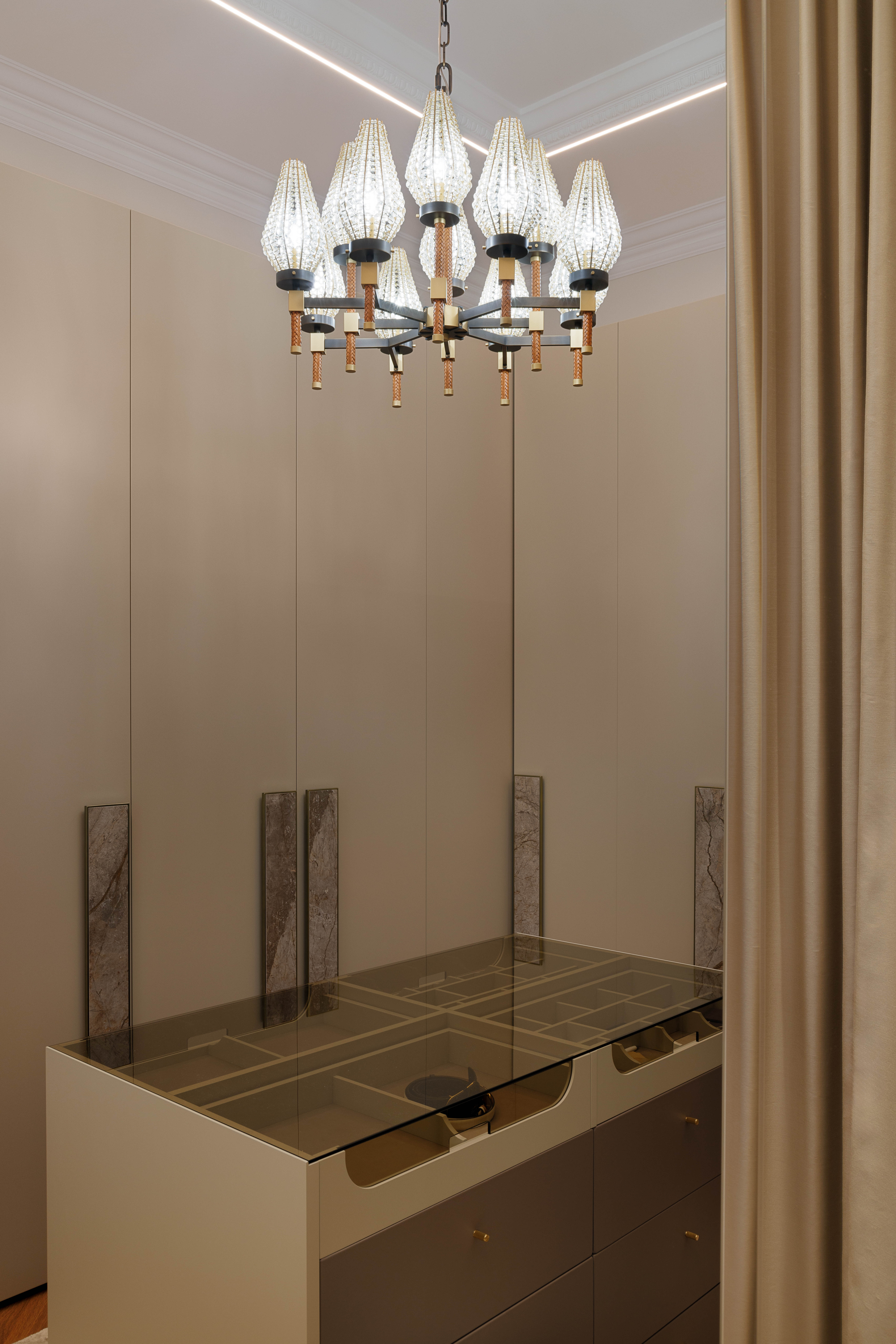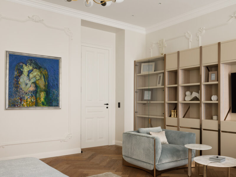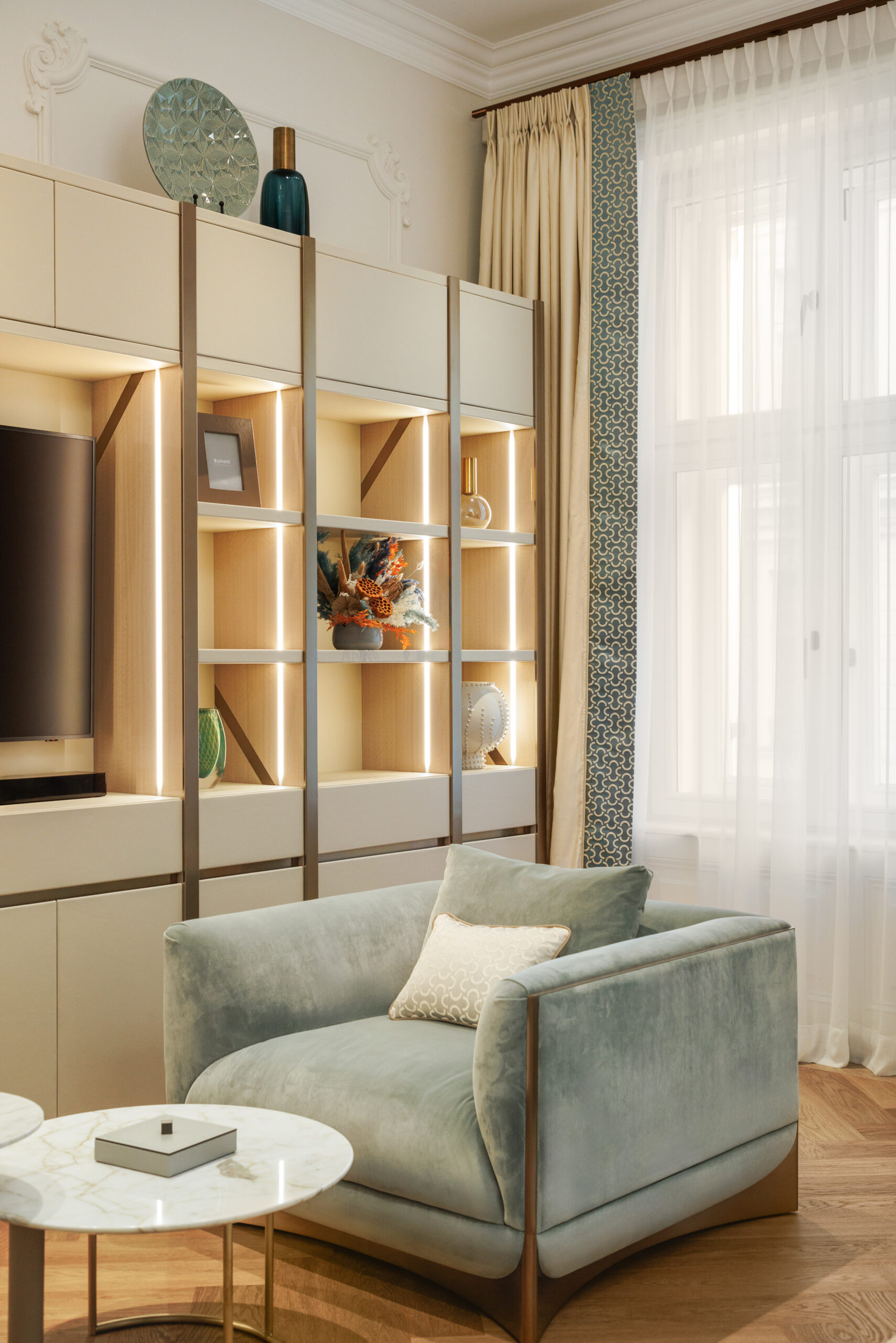 Für dieses Projekt wurden Möbel von Visionnaire sorgfältig ausgewählt und durch eine Reihe von speziell für diesen Raum angefertigten Elementen ergänzt. Zu den wichtigsten Sonderanfertigungen zählen die integrierten Küchenschränke und ein maßgeschneiderter Regalschrank für das Homeoffice, die beide Funktionalität mit architektonischer Raffinesse verbinden.