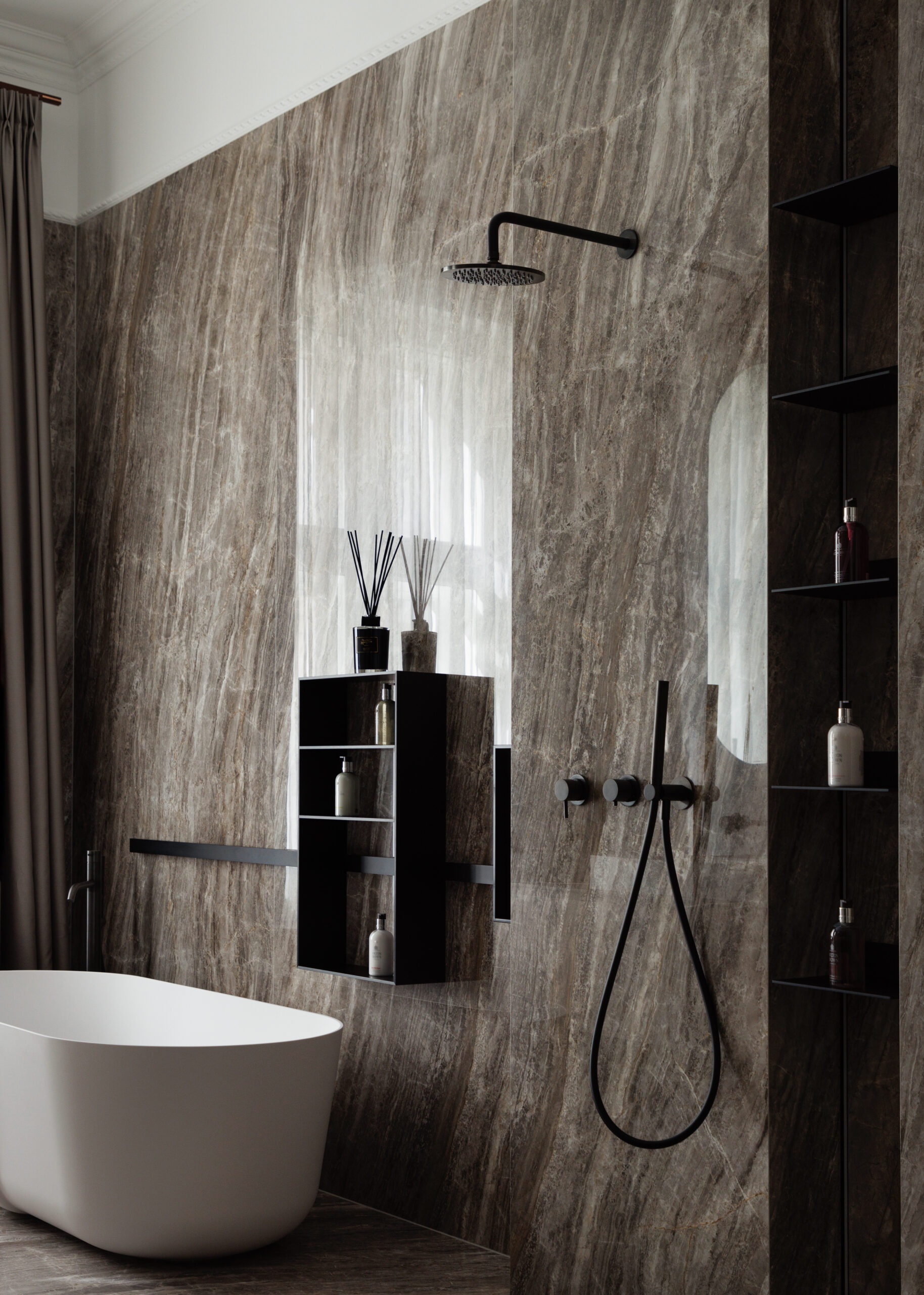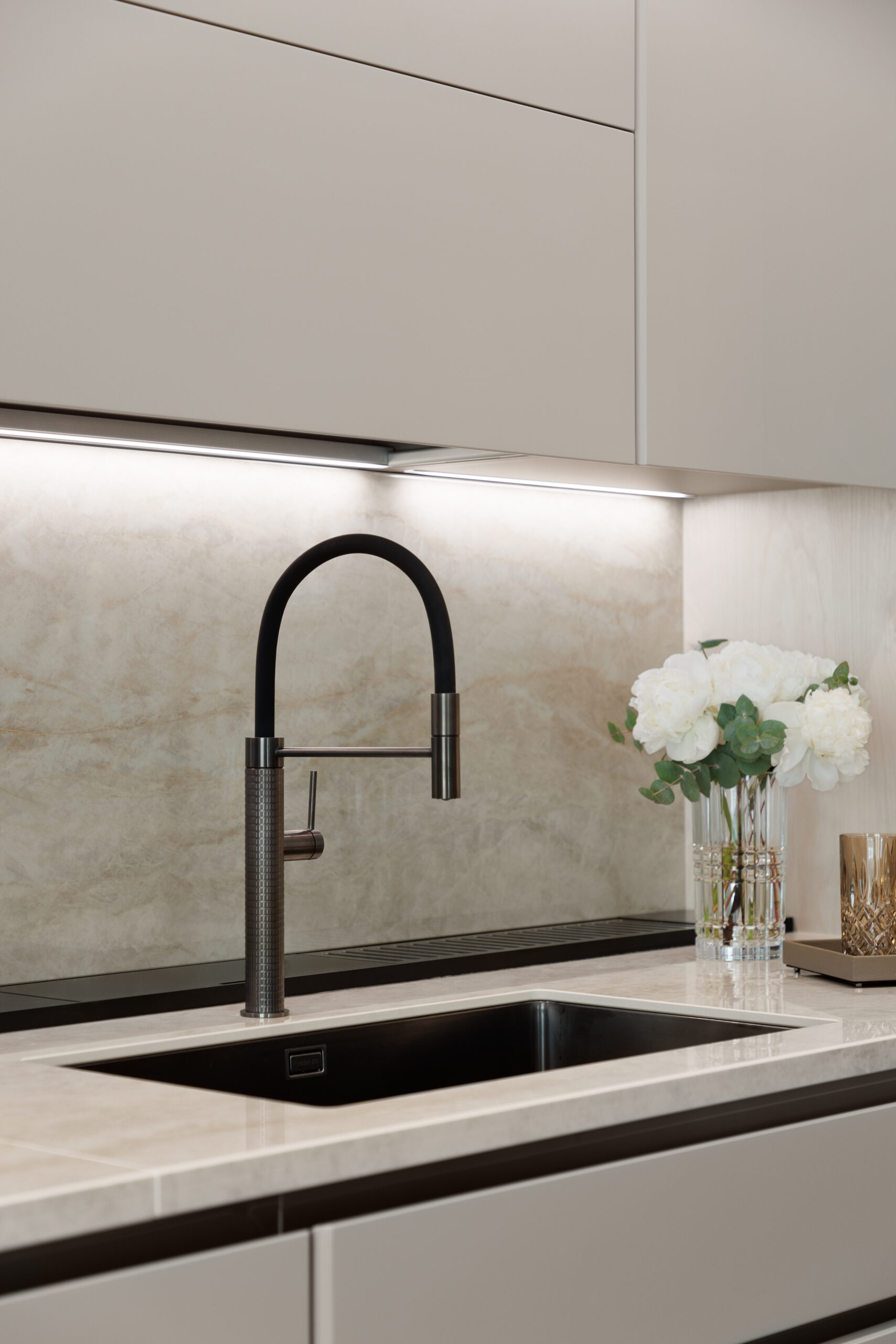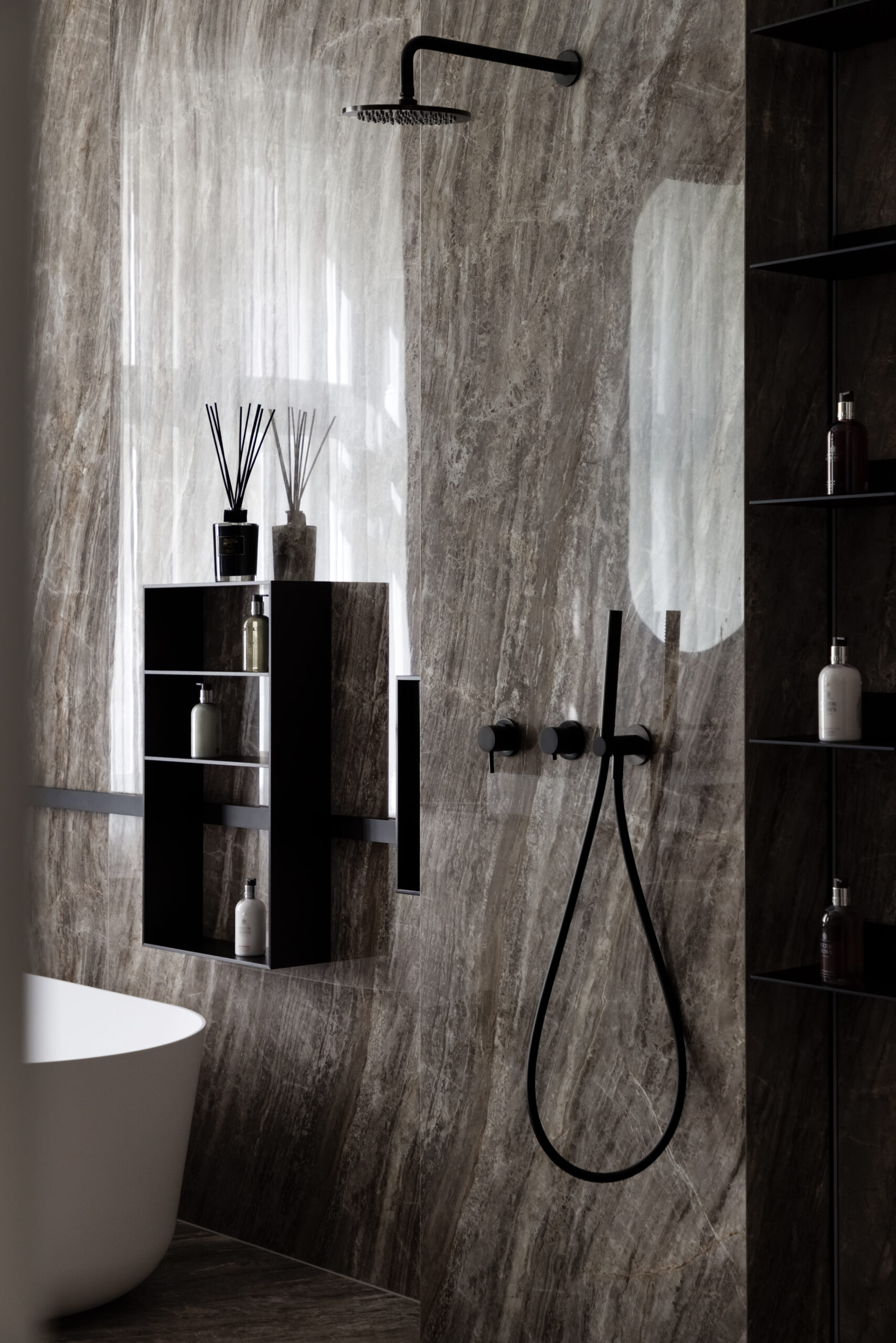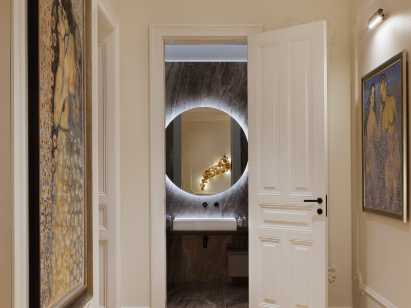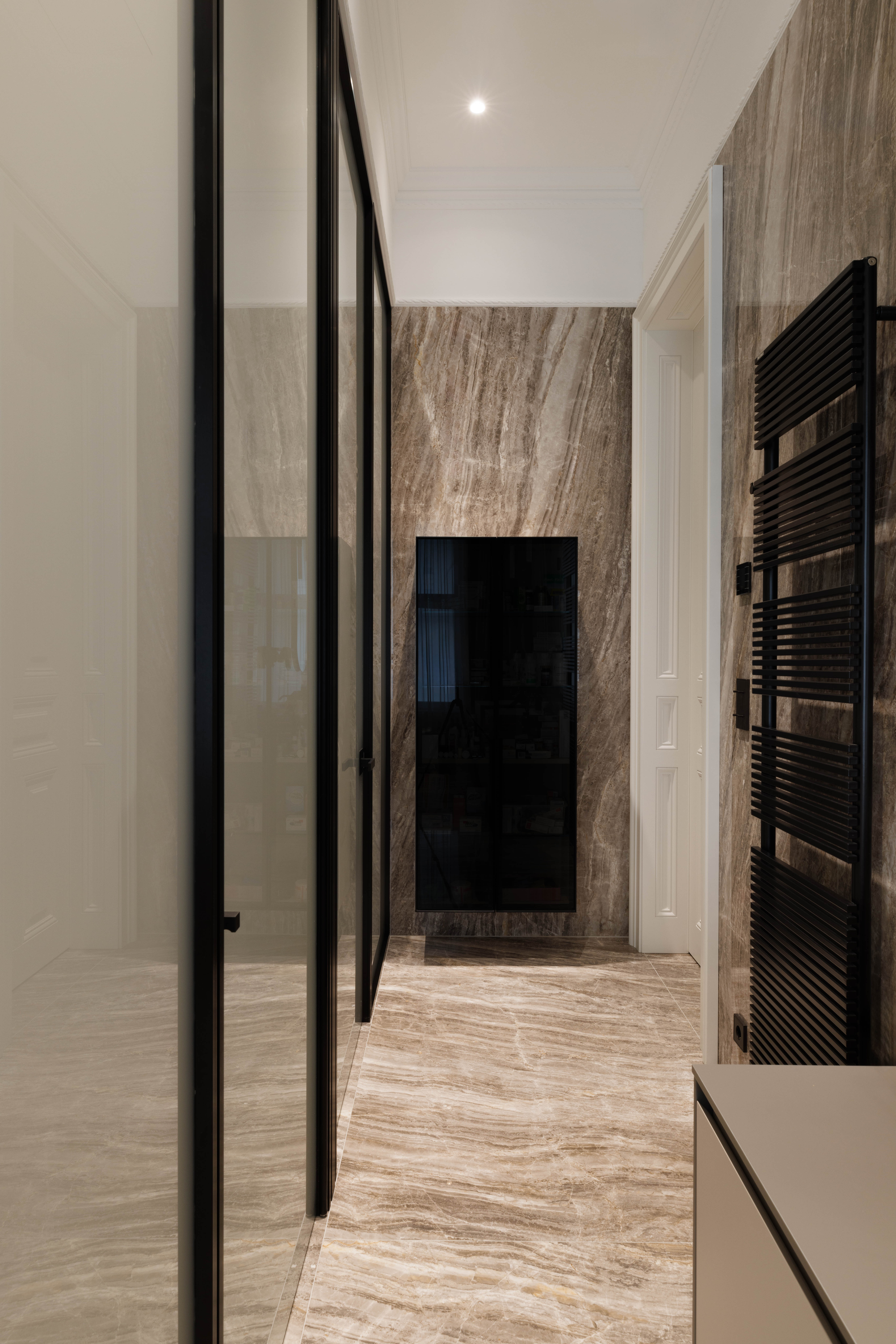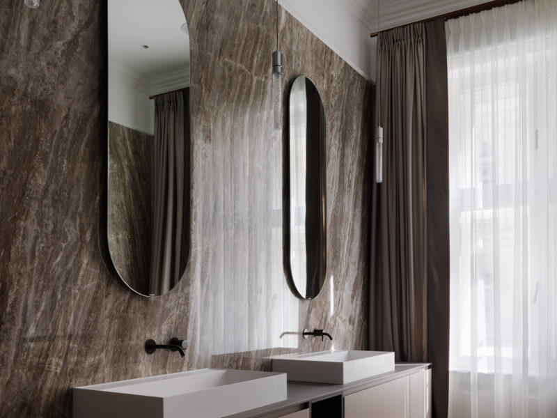 Für dieses Projekt wurden Möbel von Visionnaire sorgfältig ausgewählt und durch eine Reihe von speziell für diesen Raum angefertigten Elementen ergänzt. Zu den wichtigsten Sonderanfertigungen zählen die integrierten Küchenschränke und ein maßgeschneiderter Regalschrank für das Homeoffice, die beide Funktionalität mit architektonischer Raffinesse verbinden.